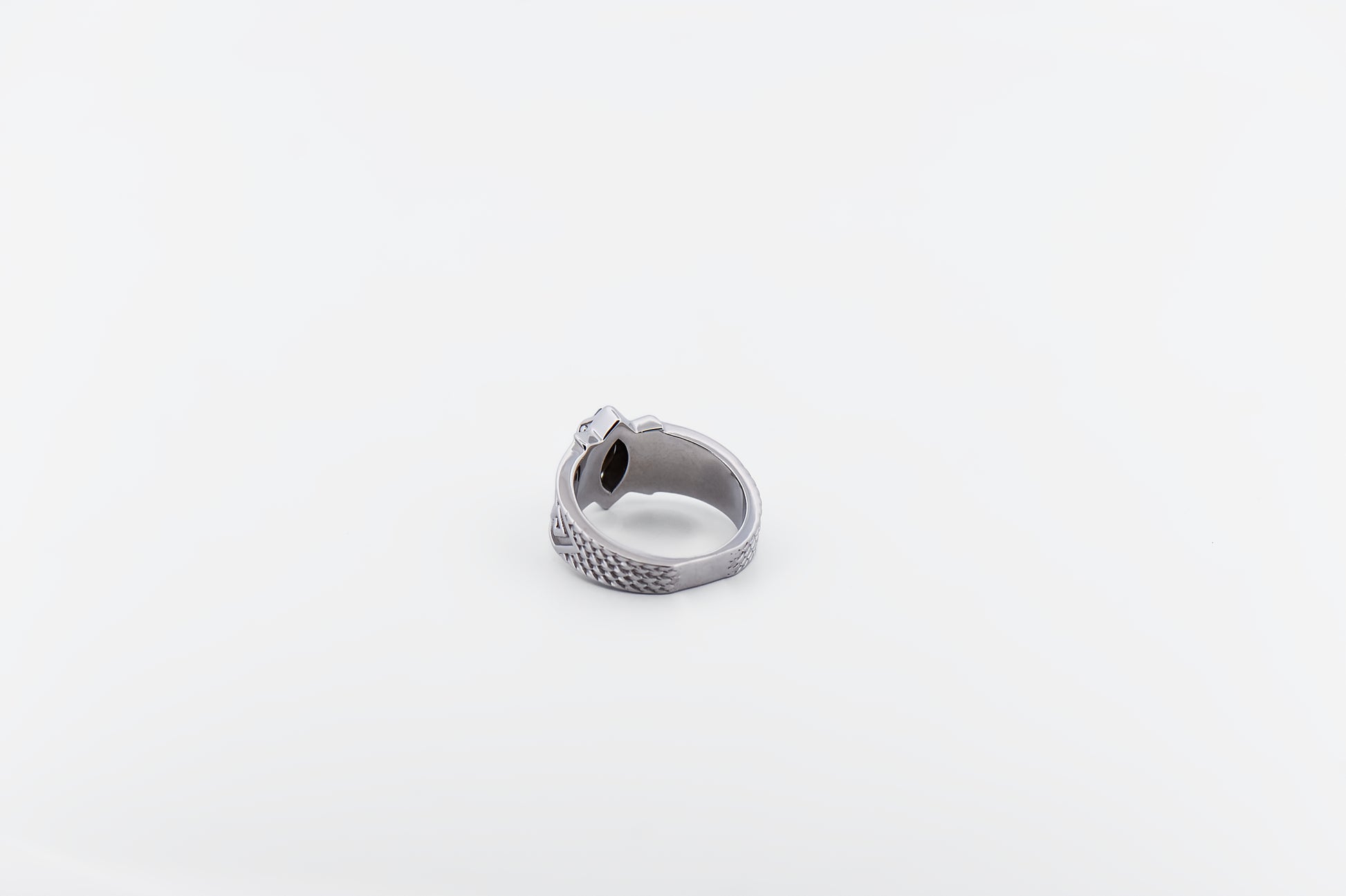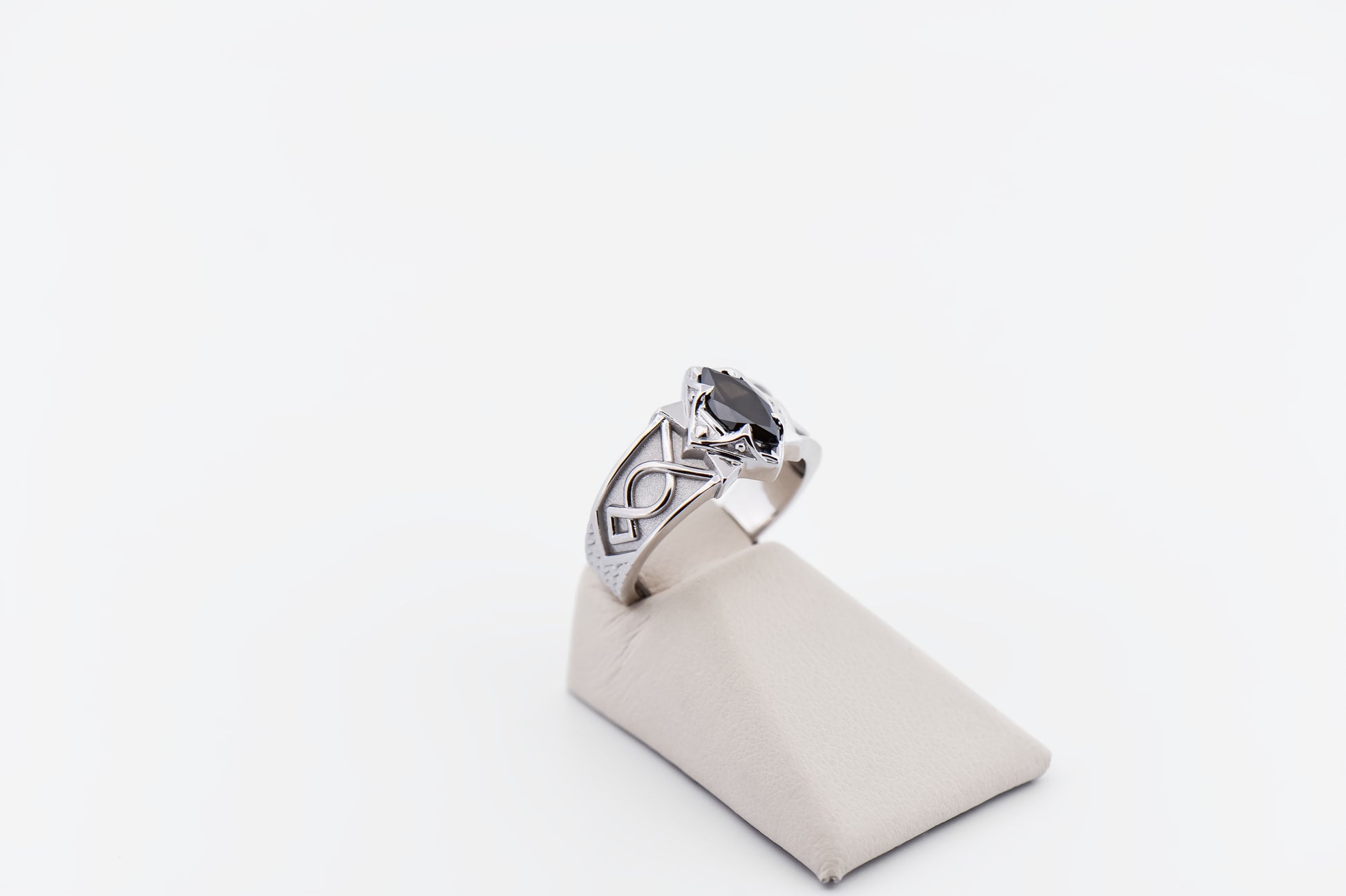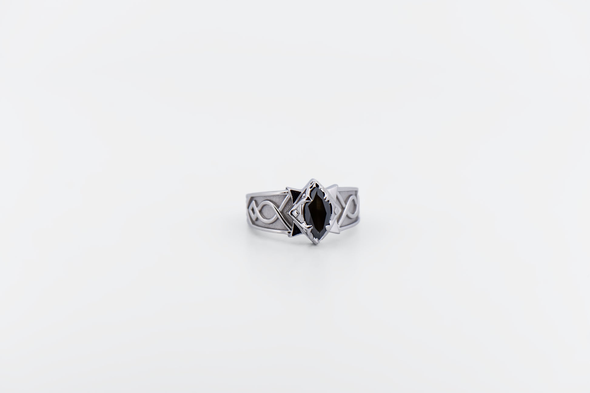 Crafted in luminous 14k white gold, the ring features intricate metalwork inspired by mystical motifs, lending the design an air of symbolism and fantasy. The rich, inky tone of the black diamond contrasts beautifully against the bright white gold, highlighting the craftsmanship and enhancing the ring's otherworldly character.