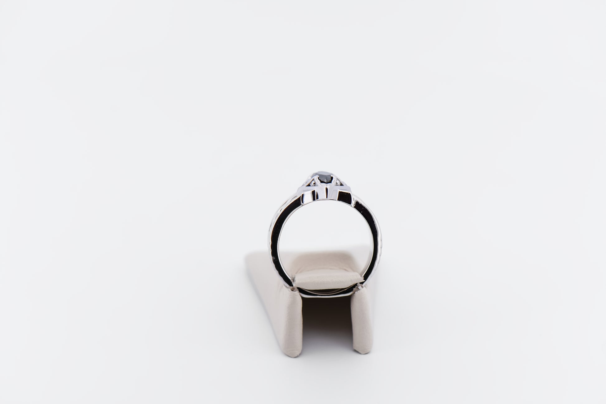 Details: Custom fantasy-inspired ring in 14k white gold featuring an approx. 0.92ct marquise-cut black diamond.