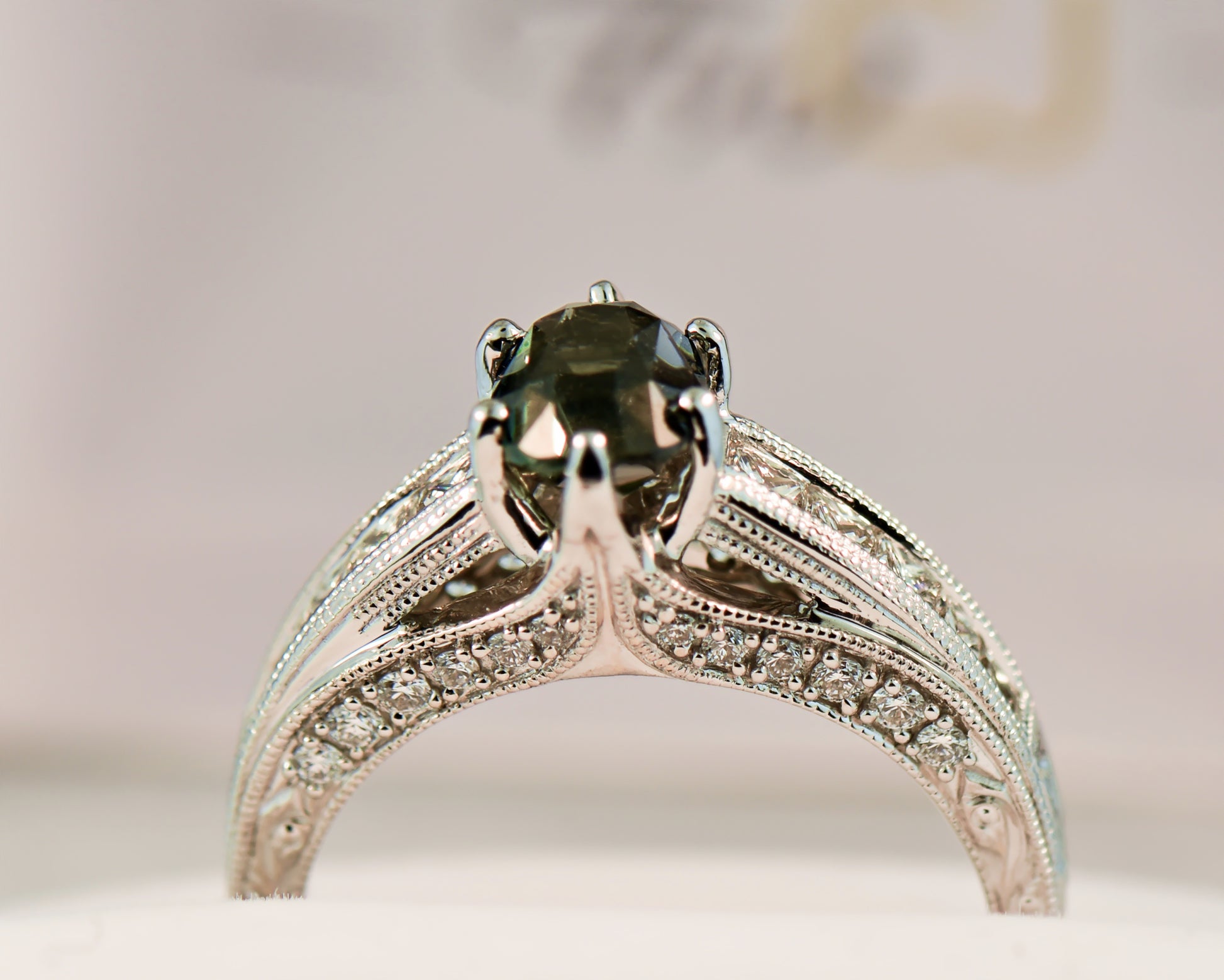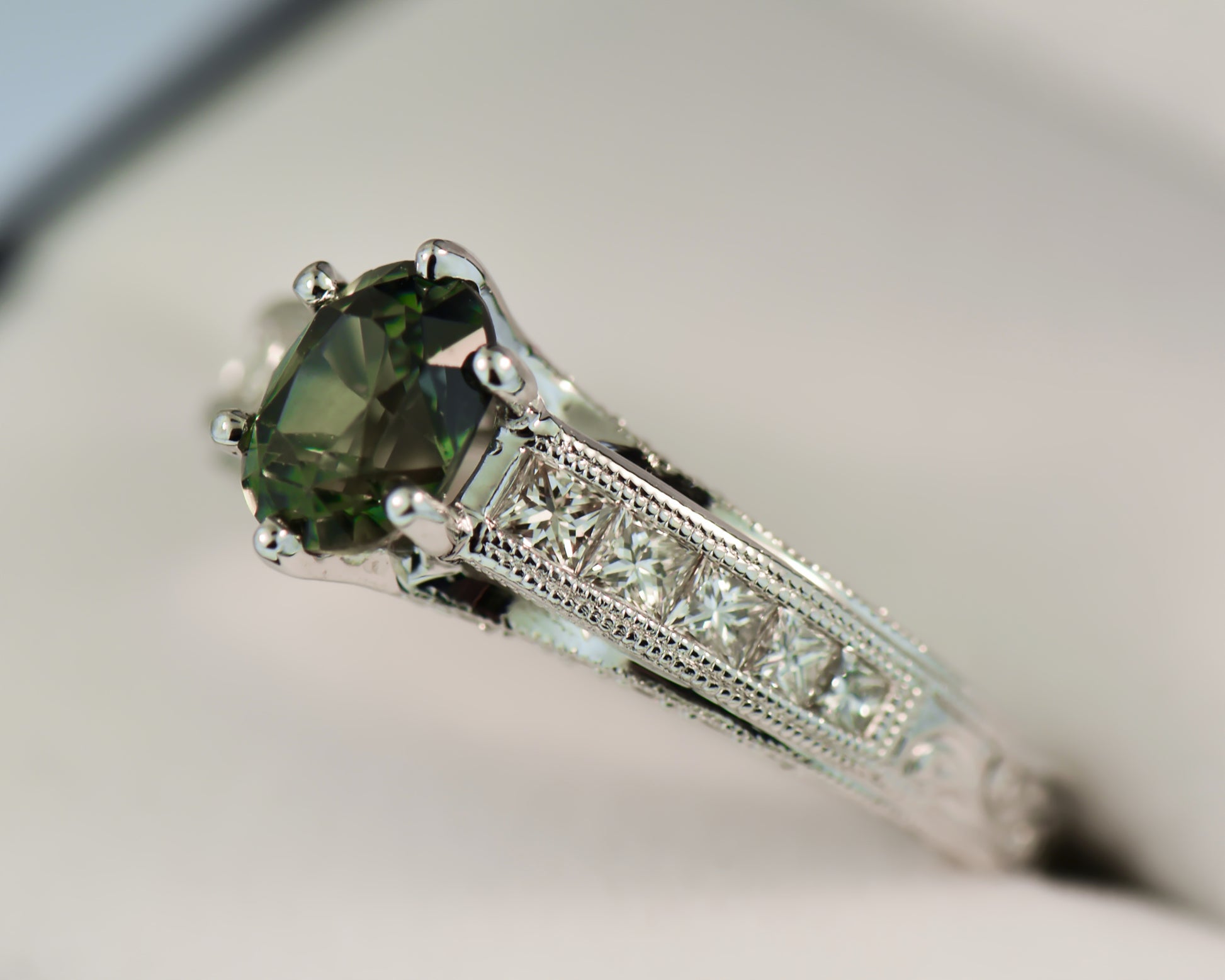 Details: Custom-made 18k white gold engagement ring set with a 1.50ct oval green sapphire (untreated, sourced from Sri Lanka) and .75ctw of natural princess-cut and round diamond accents (VS-SI1, G-H), along with intricate engravings.