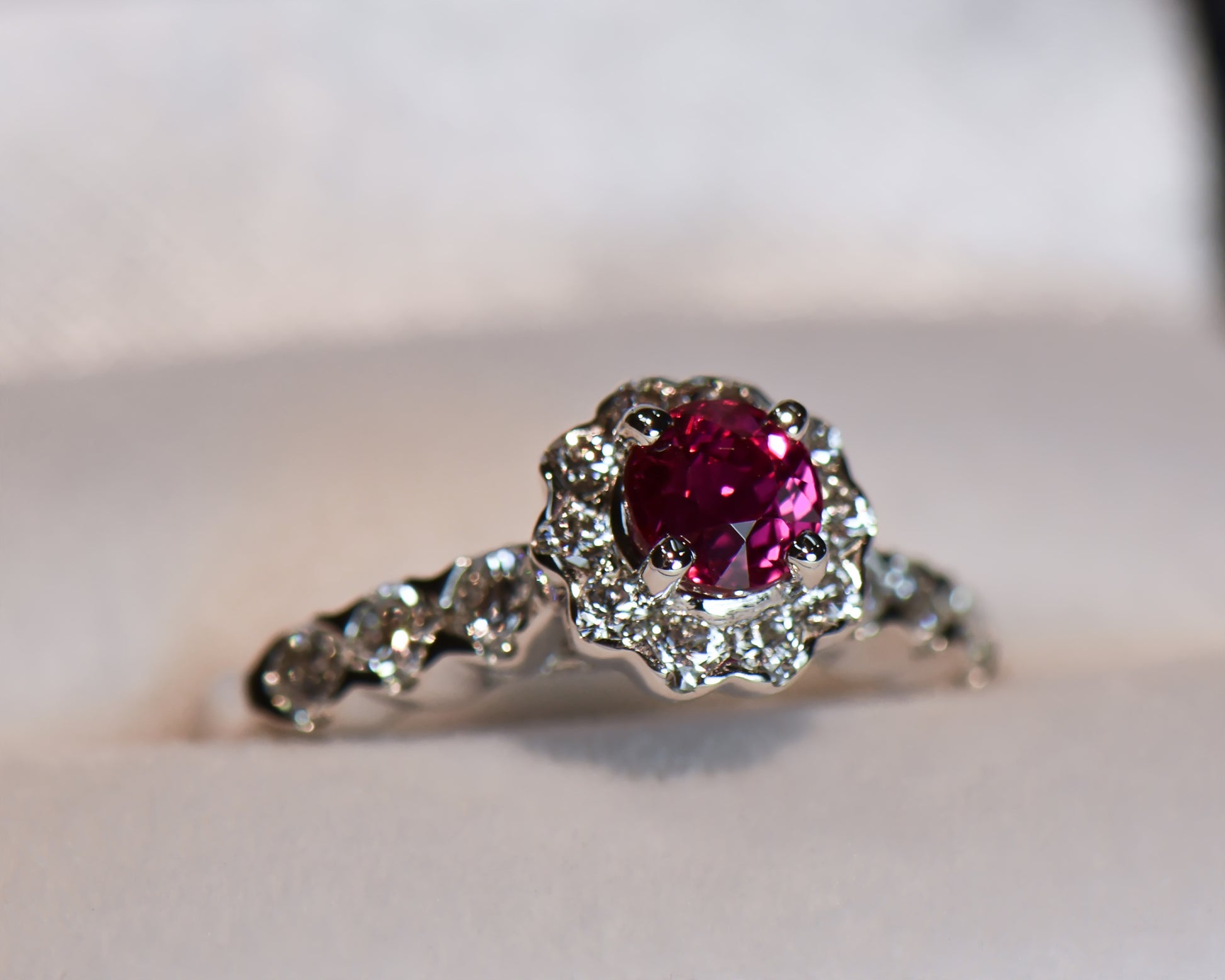 This is not a dull or opaque ruby but a crystalline, clean, sparkly gem. To highlight the cooler tones of this ruby, we have set it in a neutral white gold setting, surrounded by white diamonds for added sparkle. While this would make a breathtaking ruby engagement ring, it would also be a fabulous statement piece for anyone fortunate enough to wear it.