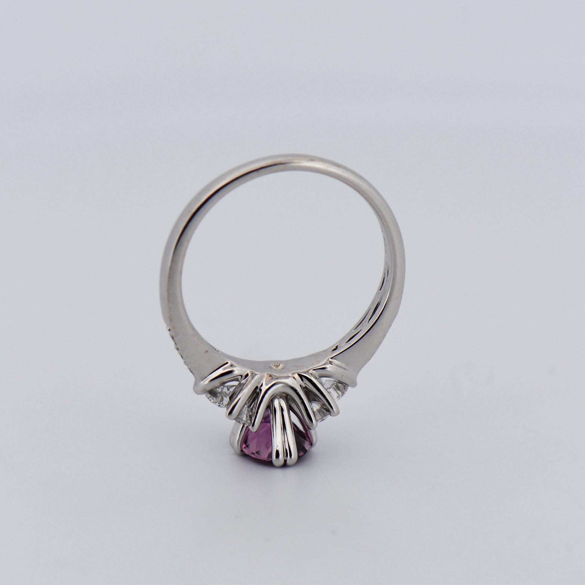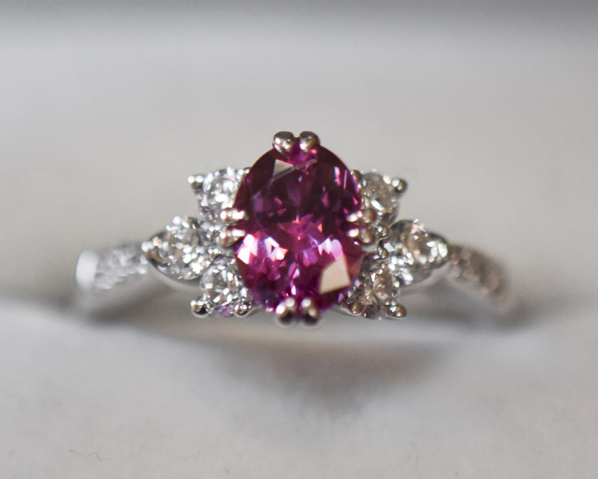 Details: Custom 18k white gold ring set with a 1.38ct oval sapphire (pink-purple, heat treated) and .53ctw round natural diamond accents (VS, G-H).