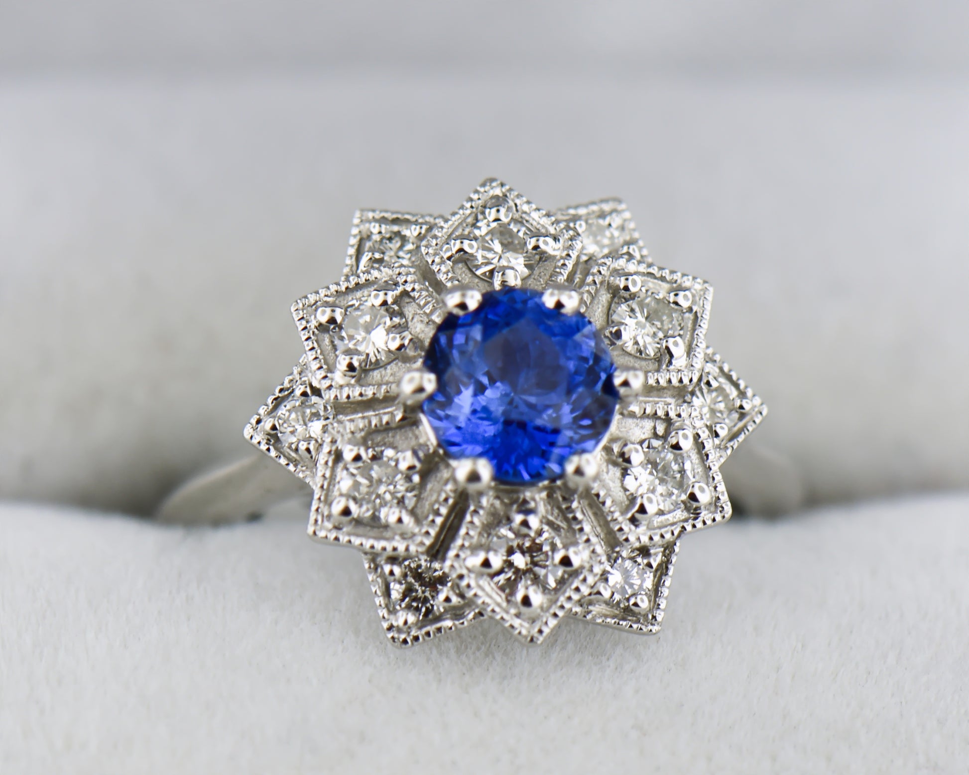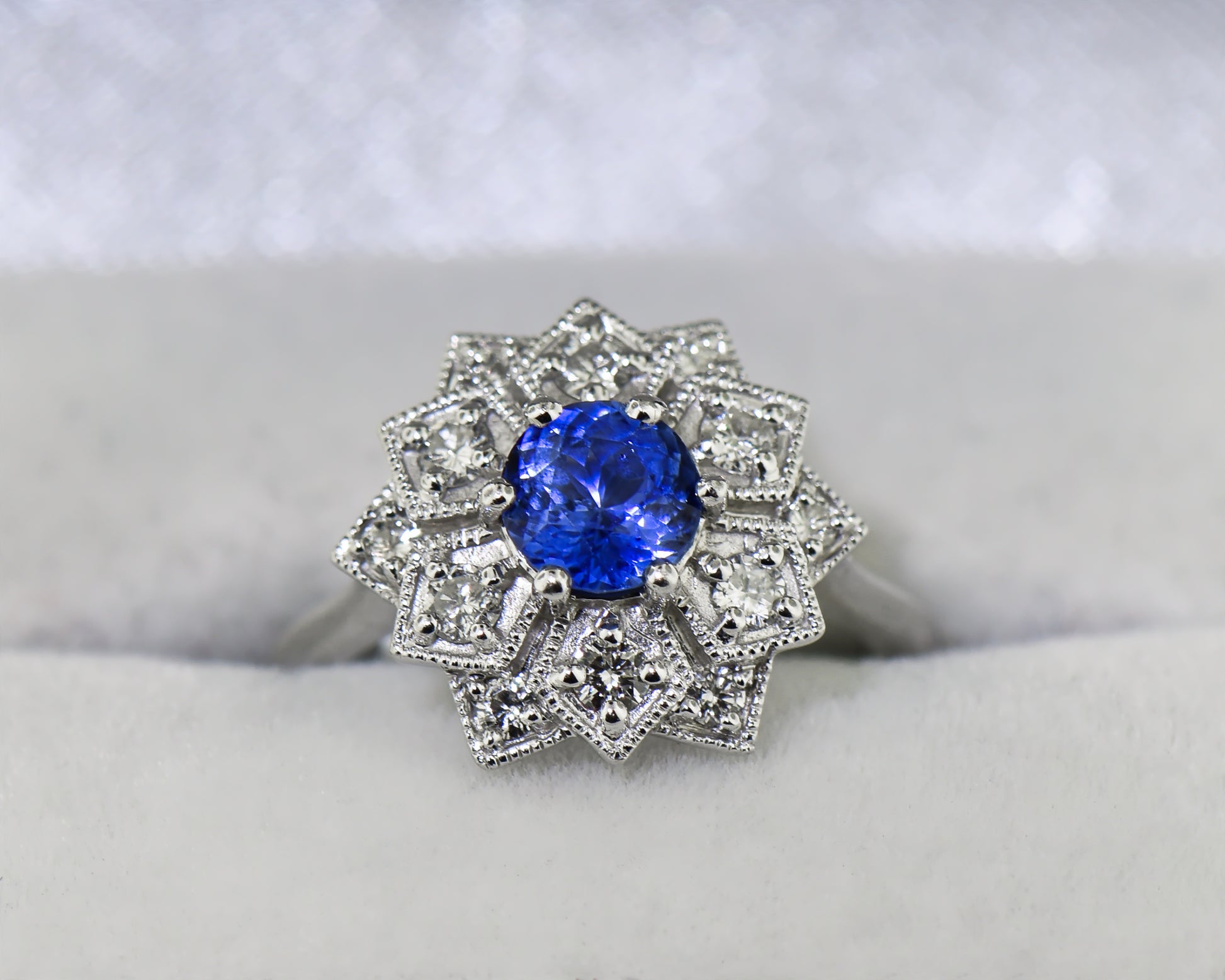 Details: Custom 14k white gold mandala ring set with a 0.91ct round blue sapphire (Sri Lanka, heat only) and 0.38ctw of natural diamond accents (SI GH).