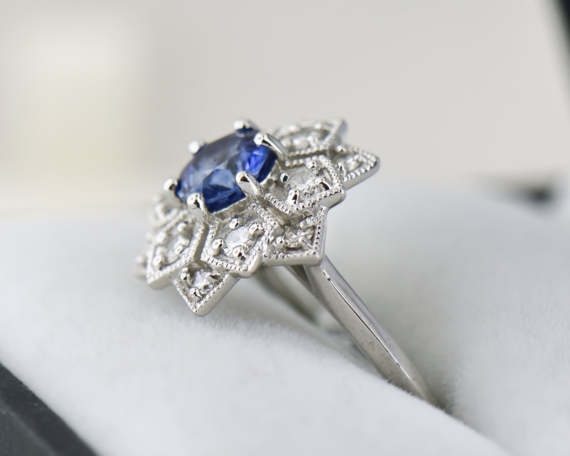 This stunning sapphire and diamond engagement ring is designed to resemble a mandala. Mandalas are artistic creations from India, rich in religious significance, and typically feature geometric designs arranged in symmetrical or floral patterns. Known for enhancing meditation and inspiring a sense of calm, these forms influenced our design, which seeks to capture that same peaceful, tranquil energy.