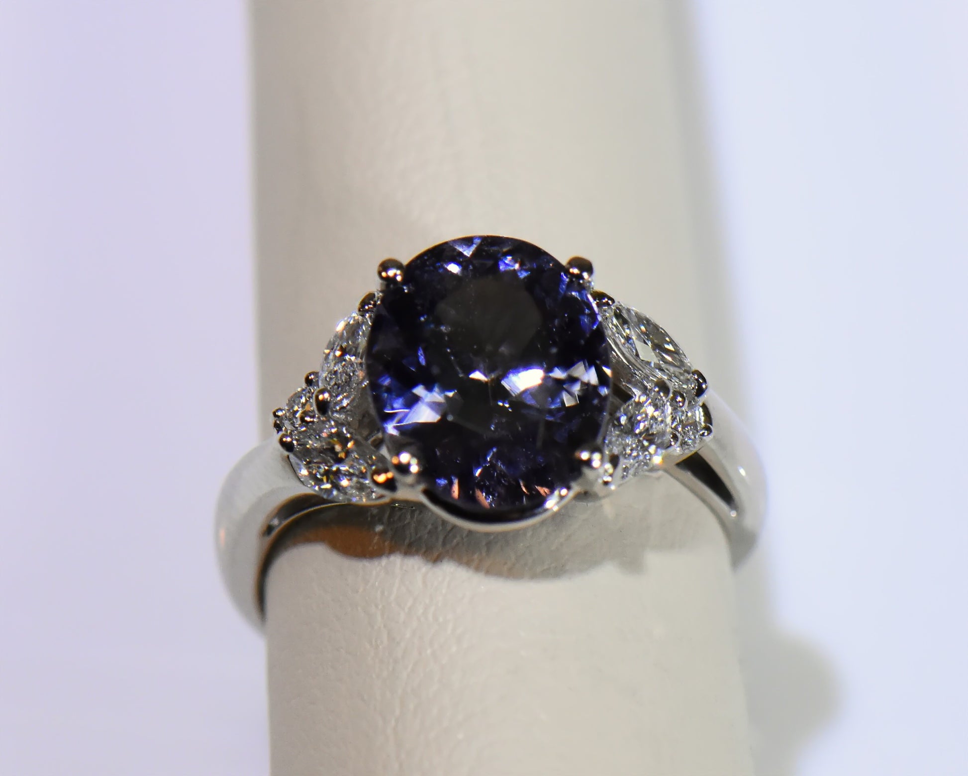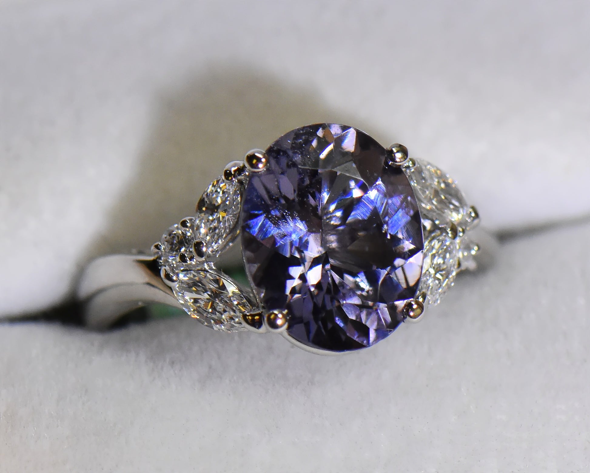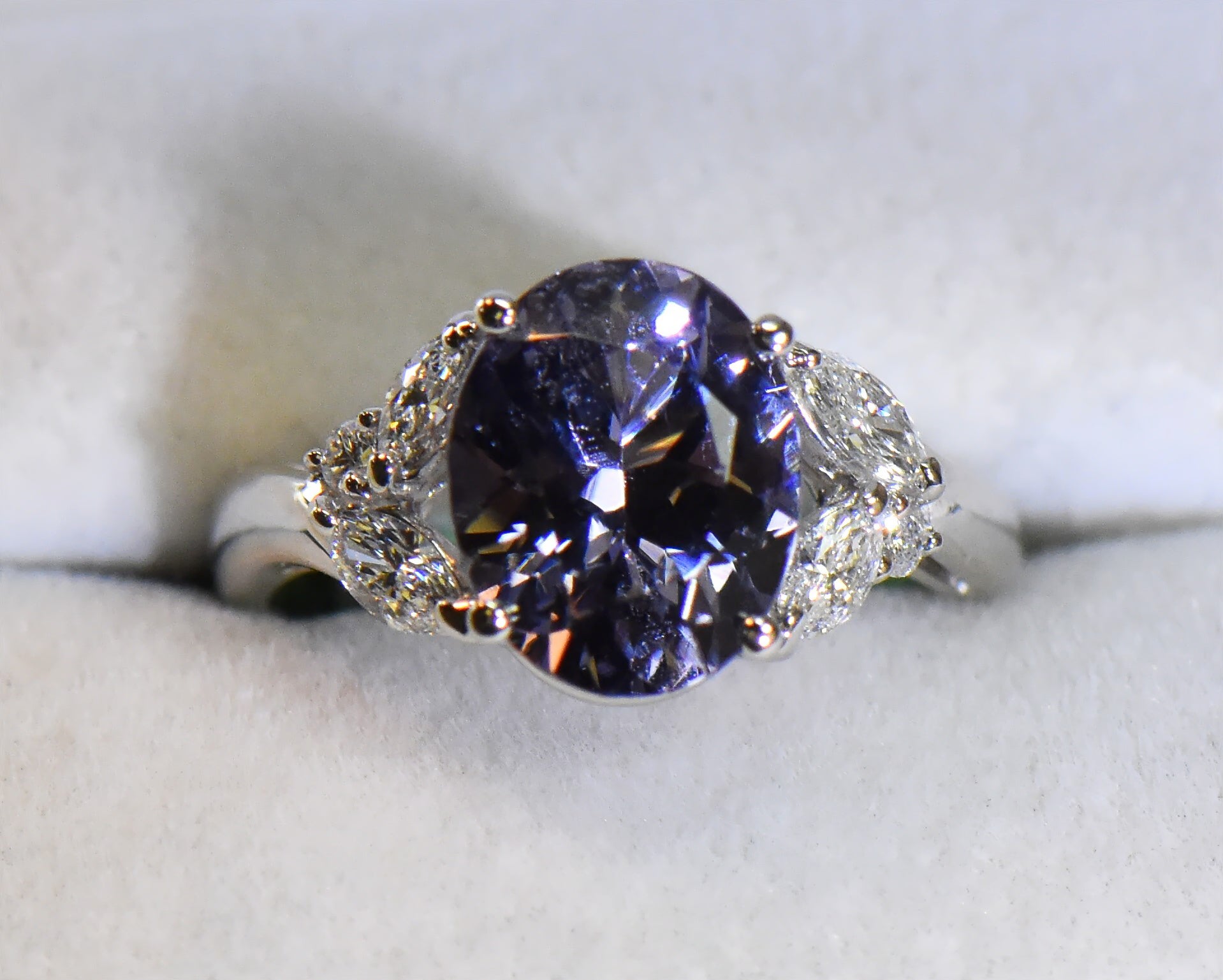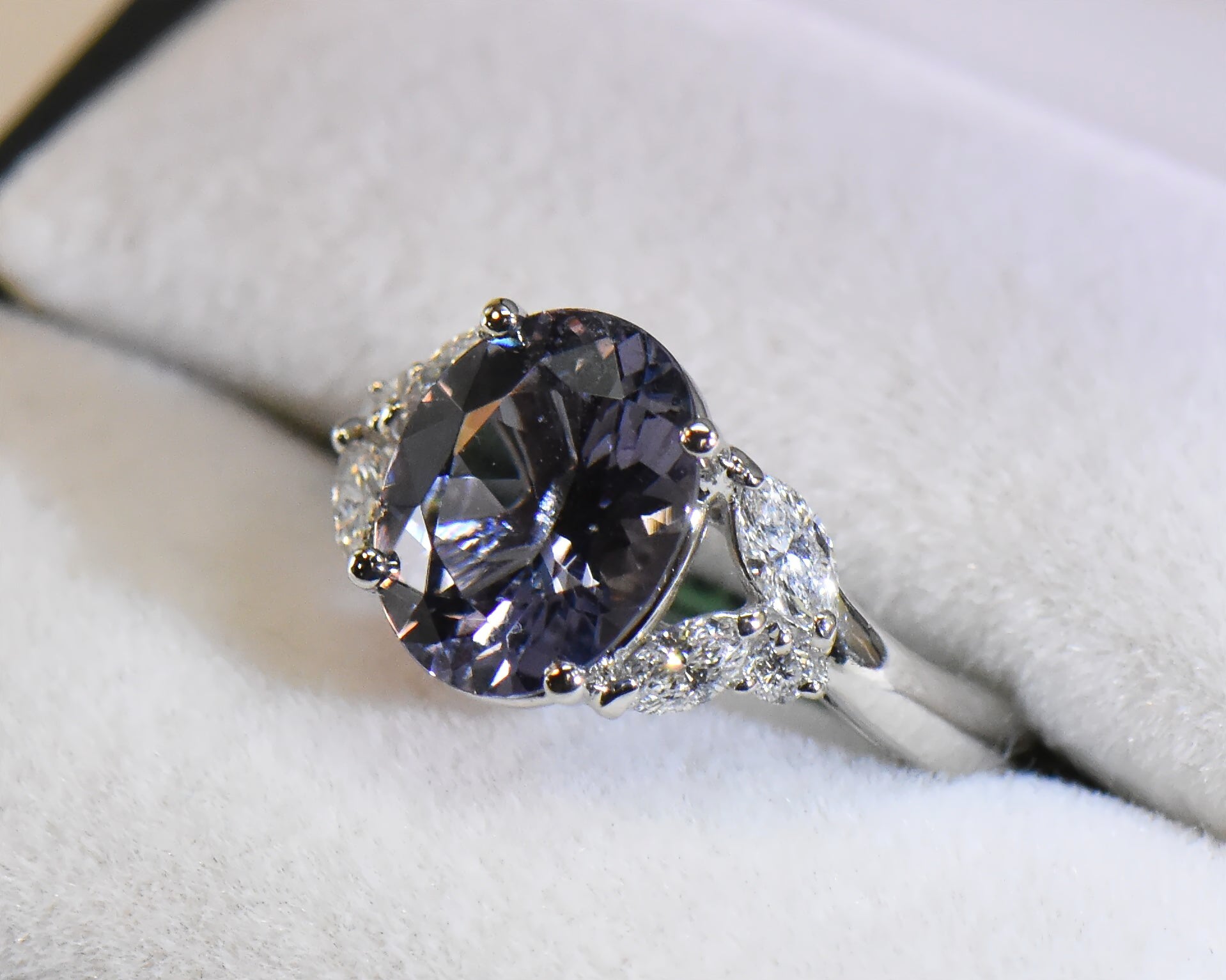 Details: 900 platinum ring set with a natural 2.94ct oval color-shifting blue-violet spinel (Sri Lanka, untreated) and .37ctw of round and marquise diamond accents (VS2, GH).