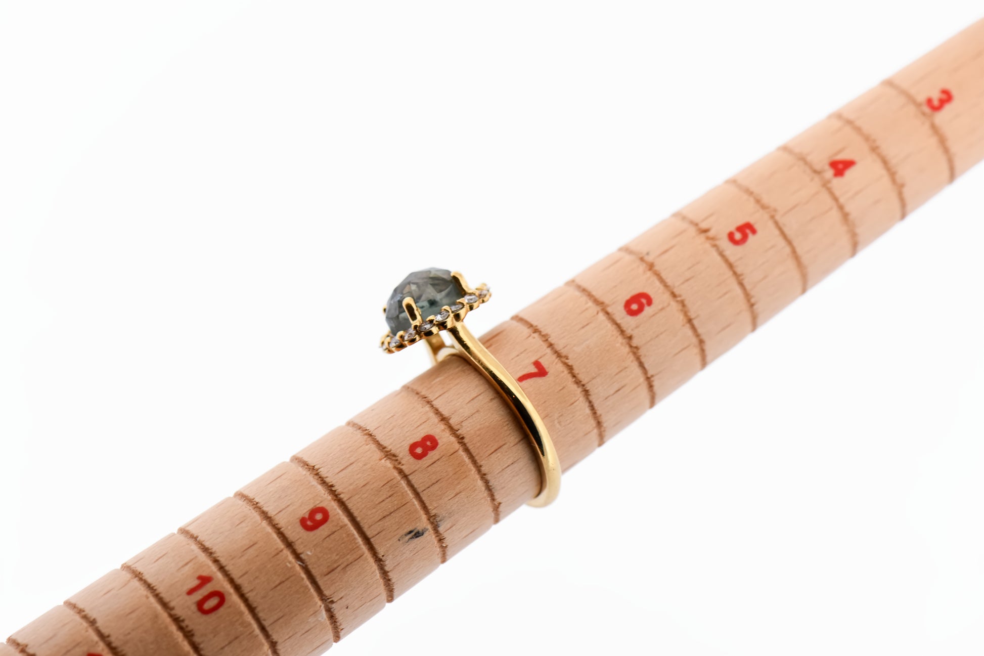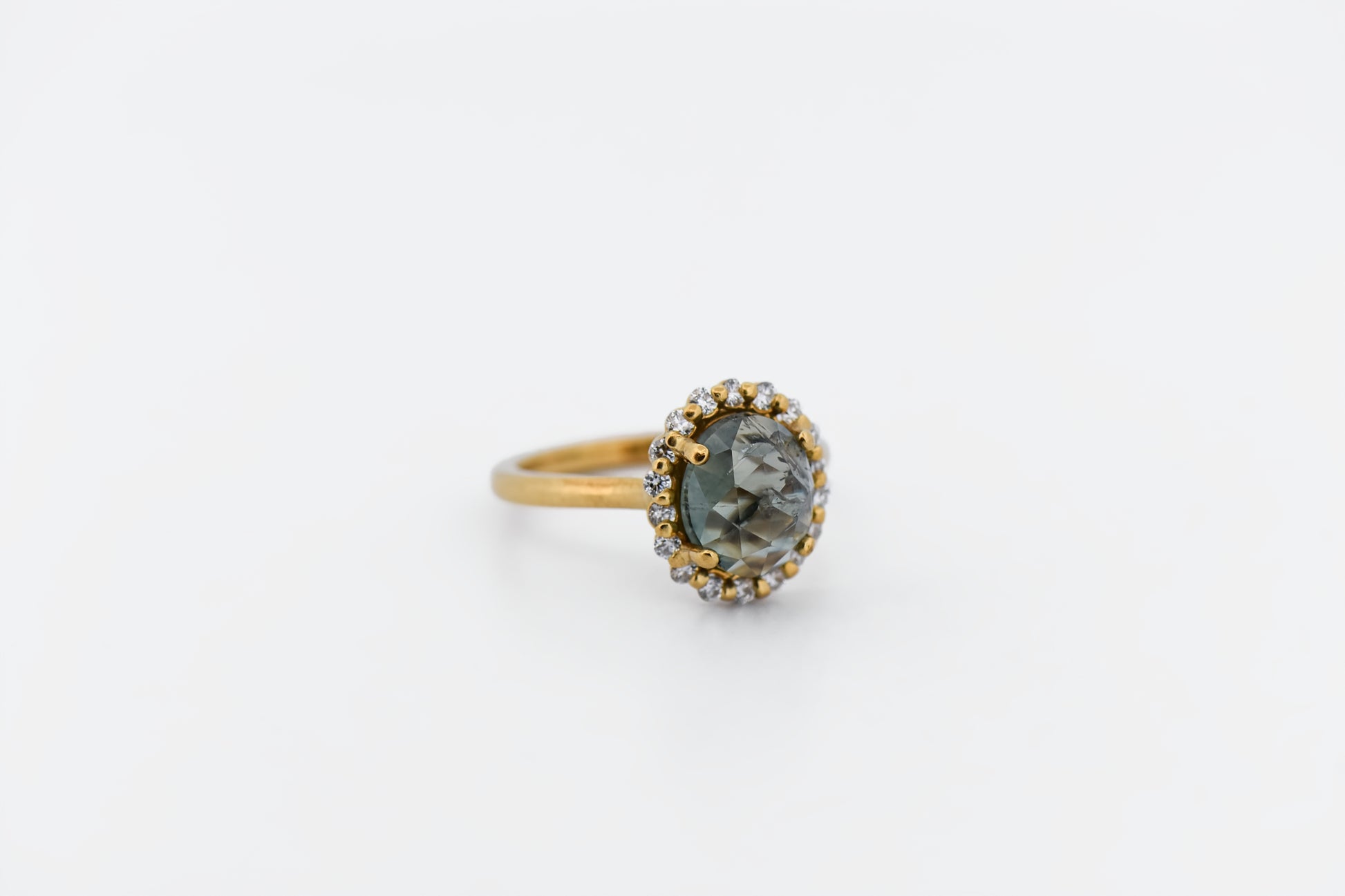 Details: Custom rose-cut Montana green sapphire ring in 18k yellow gold featuring an approx. 3.00ct oval rose-cut green sapphire accented by an approx. 0.40ctw diamond halo (VS clarity, G–H color)