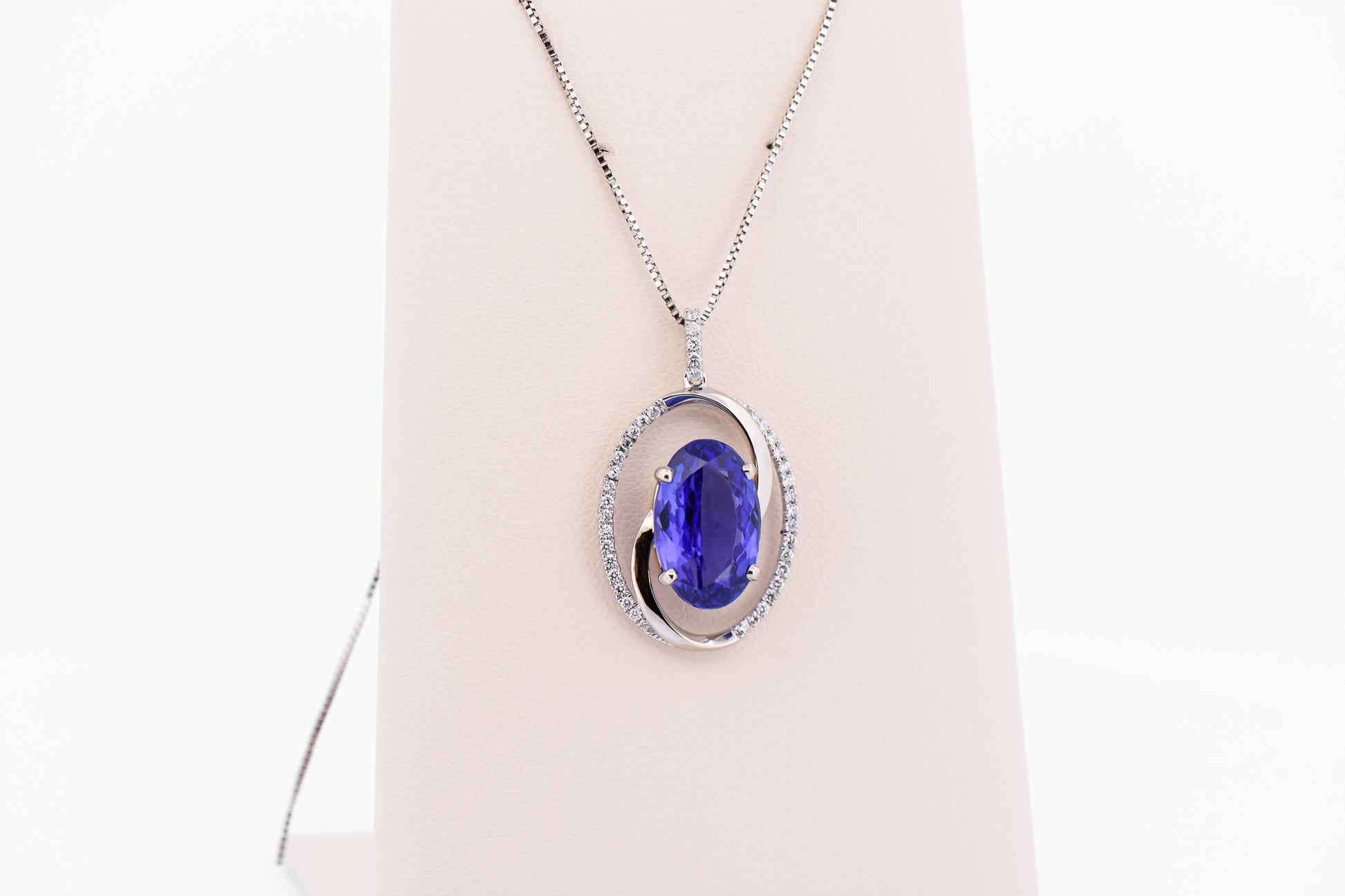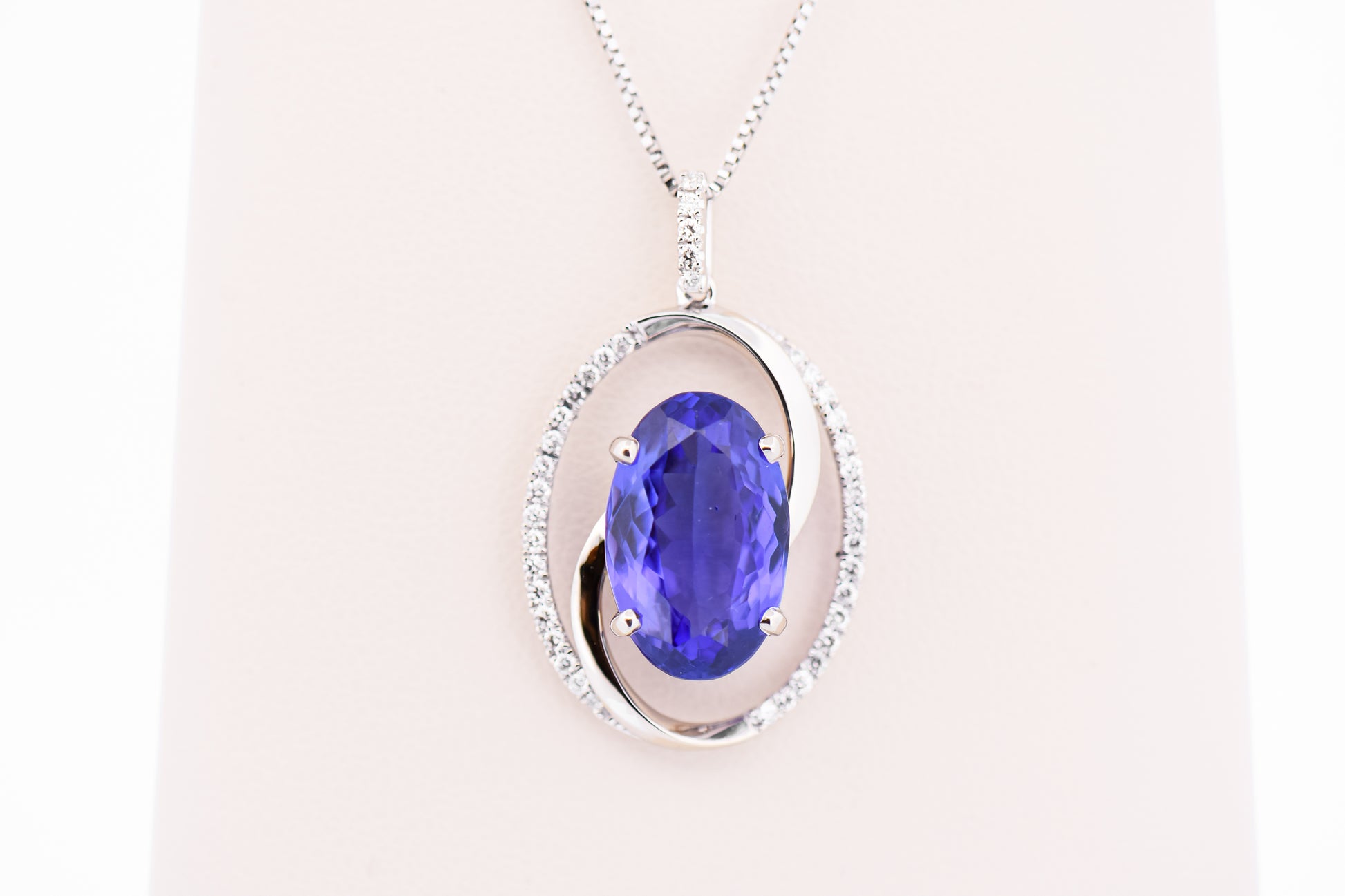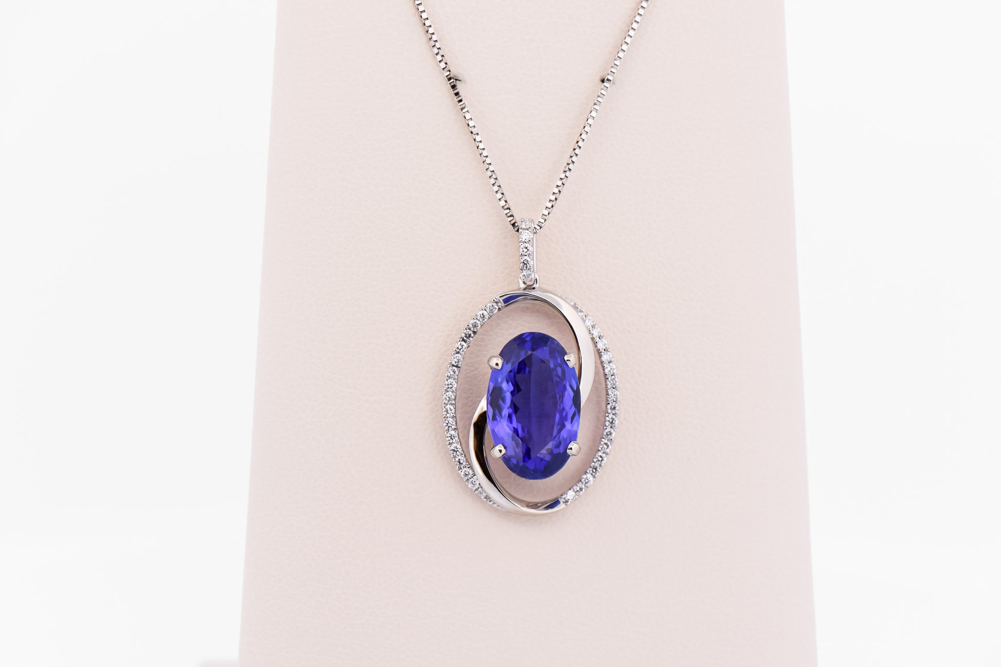 Details: Custom swirl pendant in 14k white gold featuring an oval 6.38ct AAA-grade tanzanite accented by approx. 0.23ctw diamonds (VS clarity, G–H color).