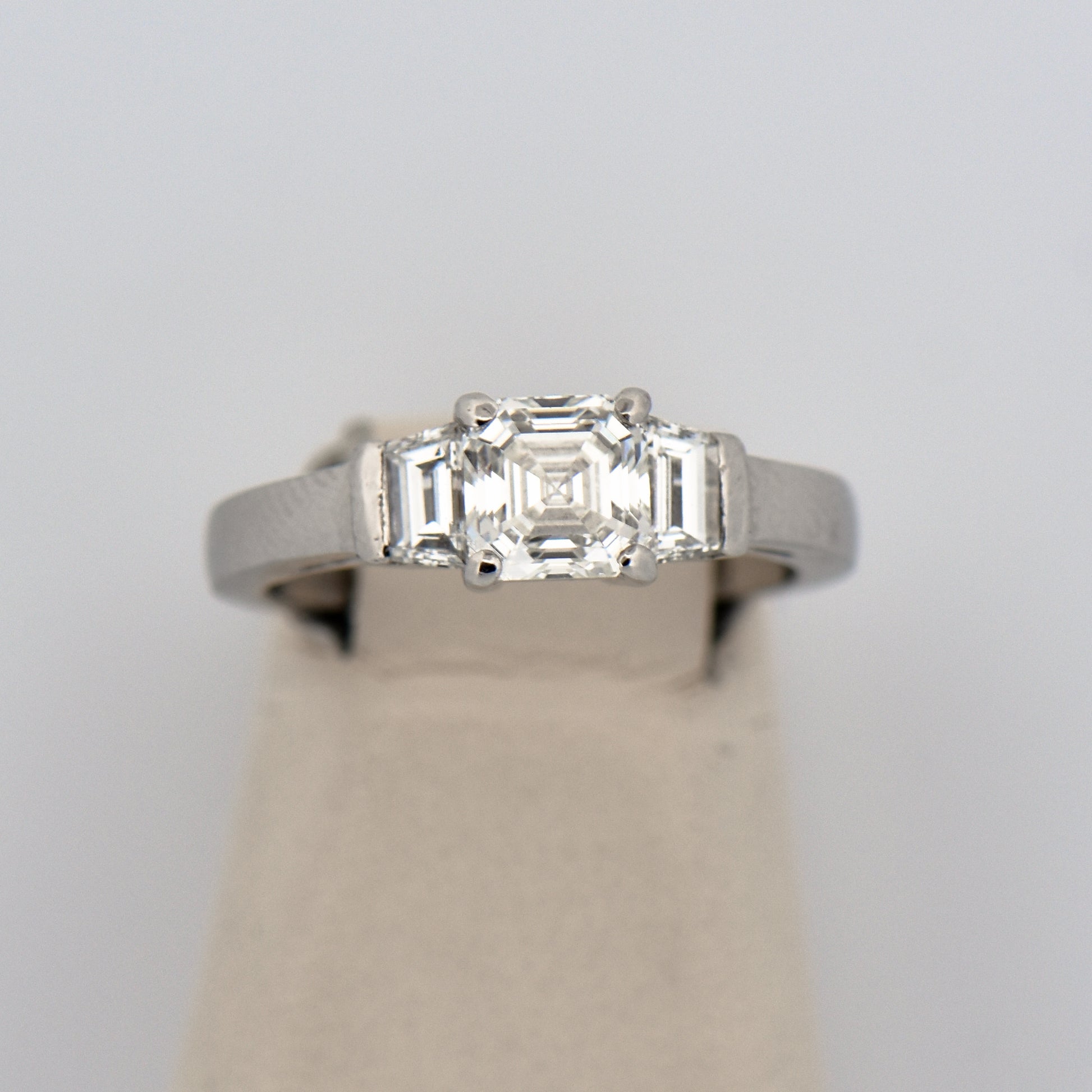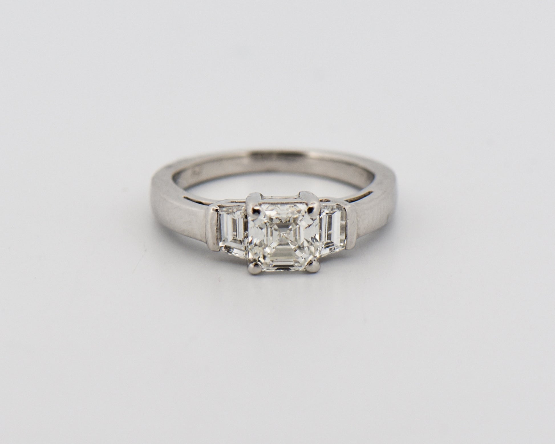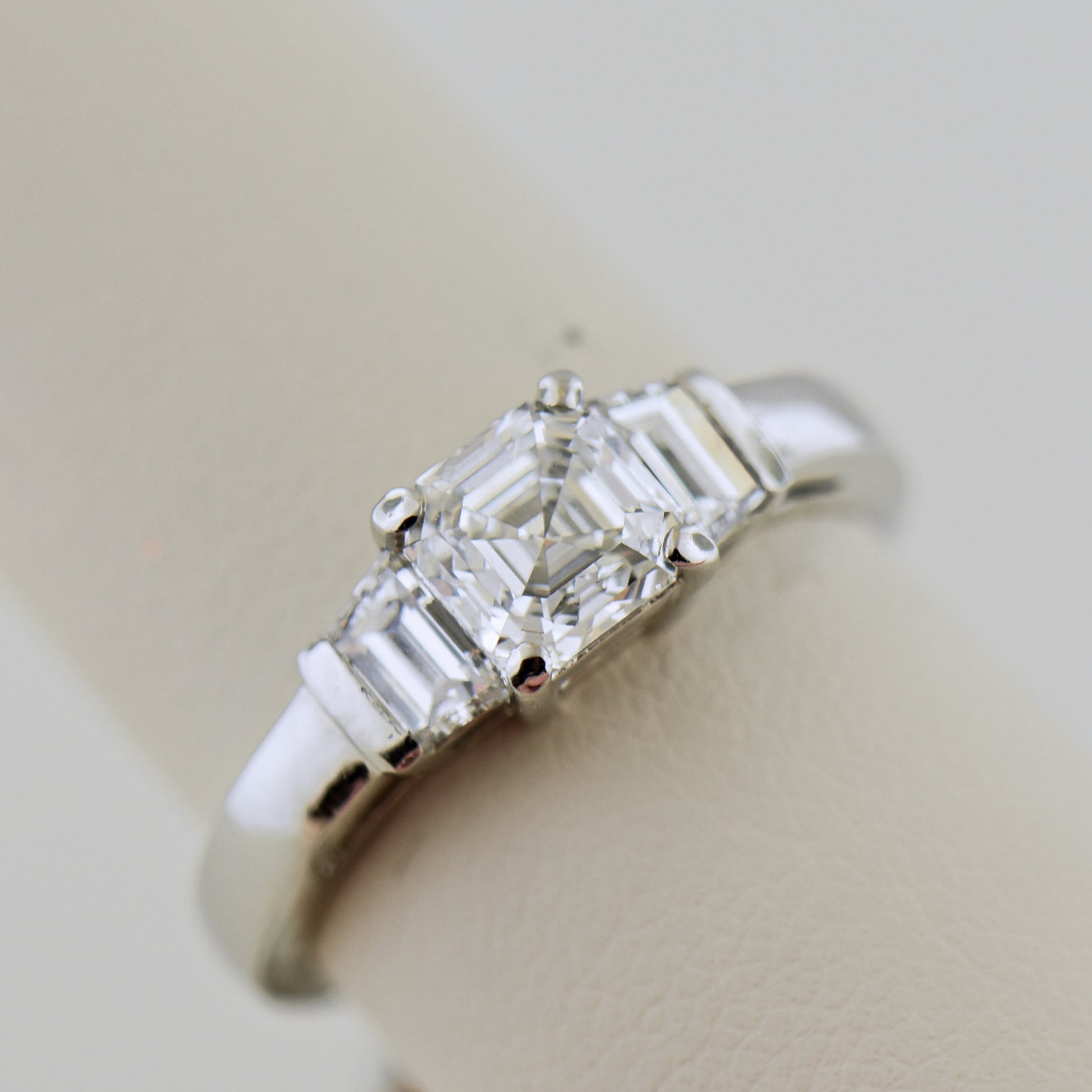 Crafted from highly polished platinum, the ring features a stunning 1-carat Asscher-cut diamond at its center, flanked by trapezoid diamond accents for a refined, Art Deco-inspired look. The combination of geometric lines and vintage elegance gives the design timeless appeal, while the certified VS-quality diamonds ensure brilliance and clarity throughout.