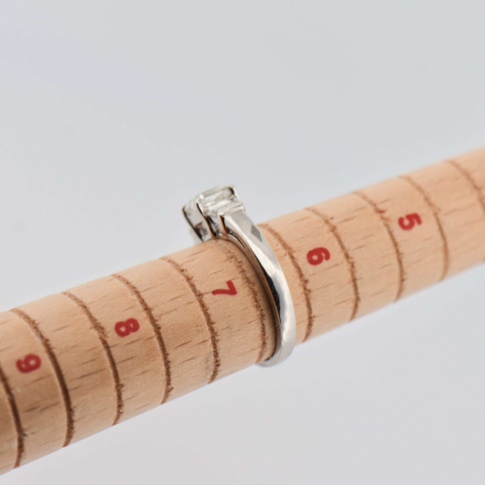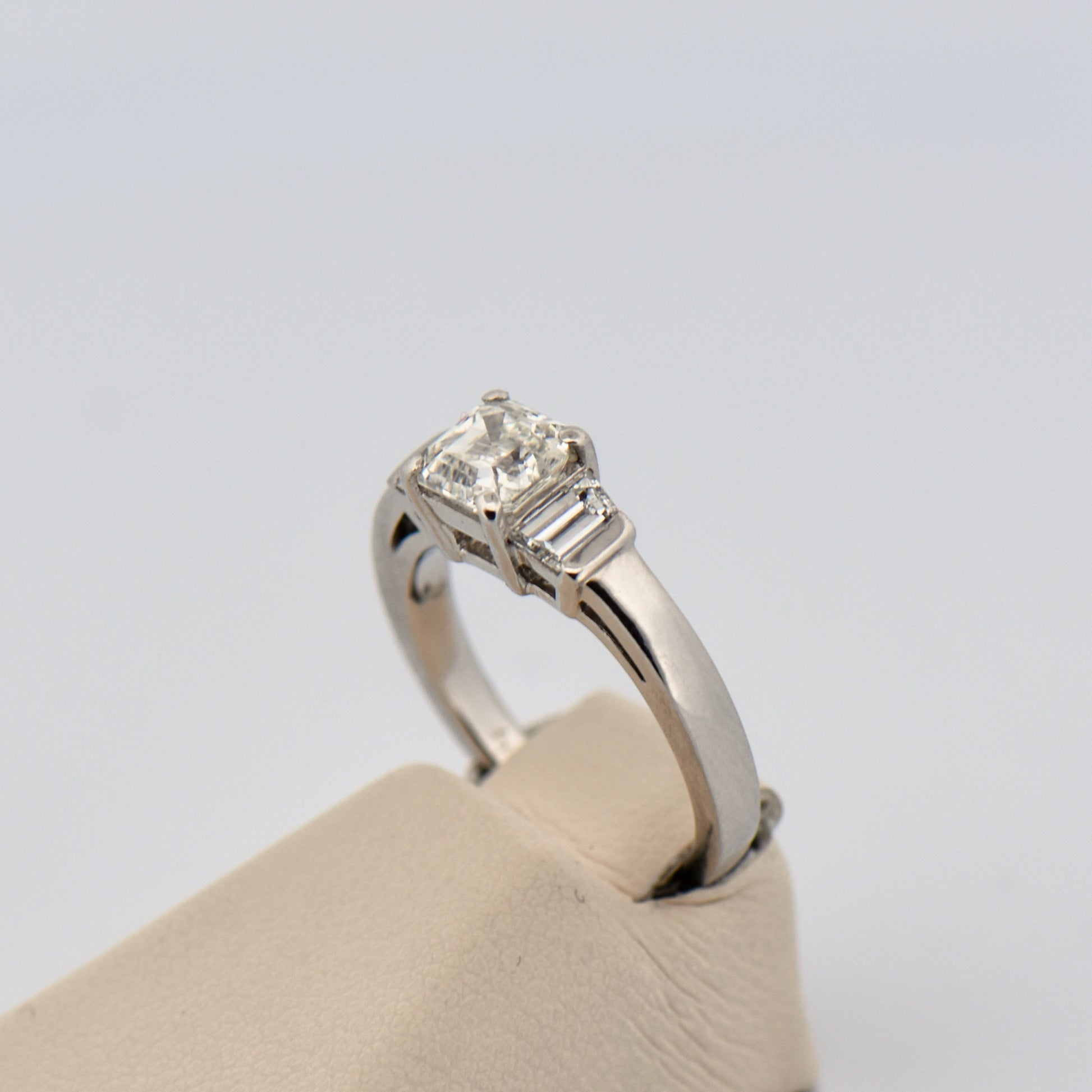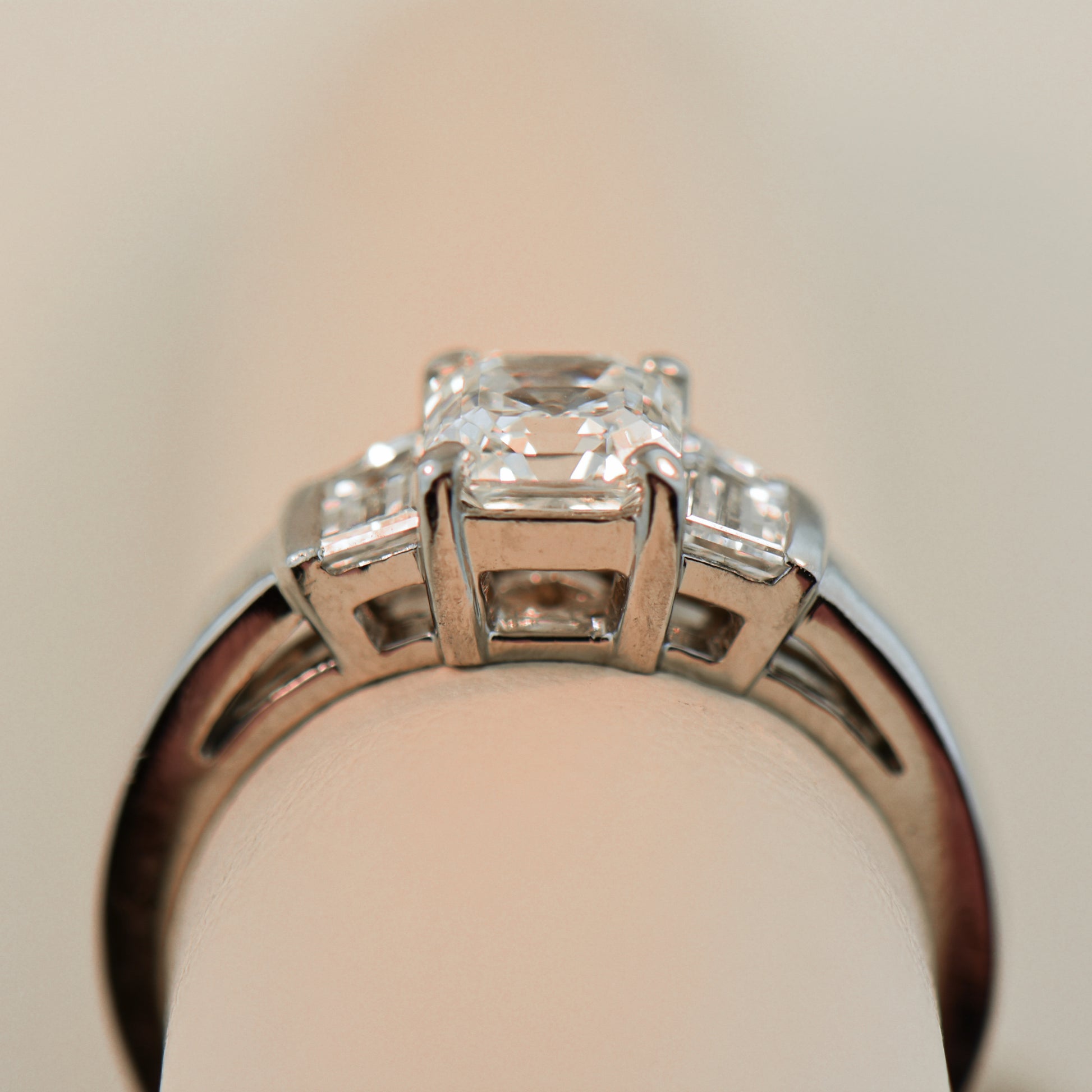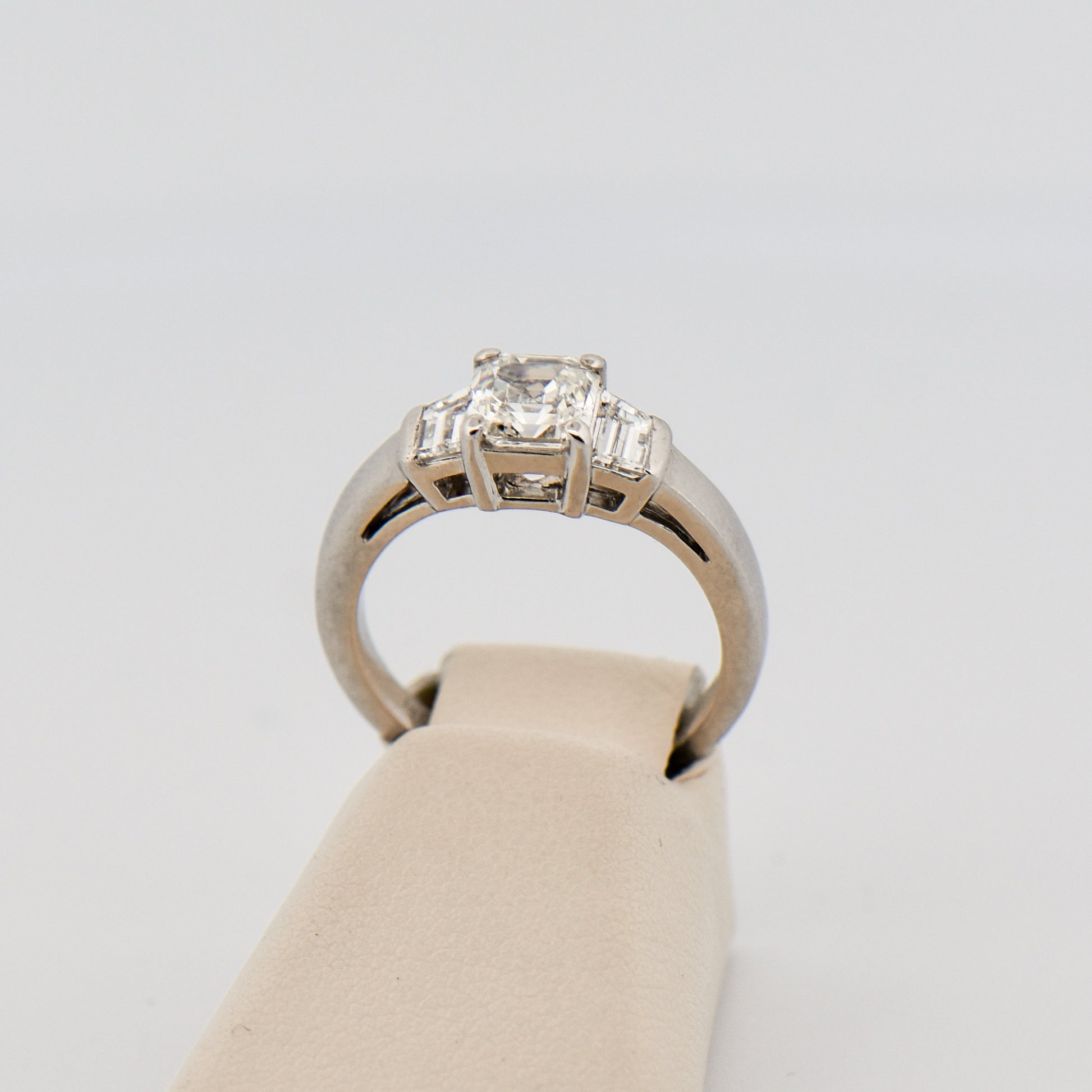 Crafted from highly polished platinum, the ring features a stunning 1-carat Asscher-cut diamond at its center, flanked by trapezoid diamond accents for a refined, Art Deco-inspired look. The combination of geometric lines and vintage elegance gives the design timeless appeal, while the certified VS-quality diamonds ensure brilliance and clarity throughout.