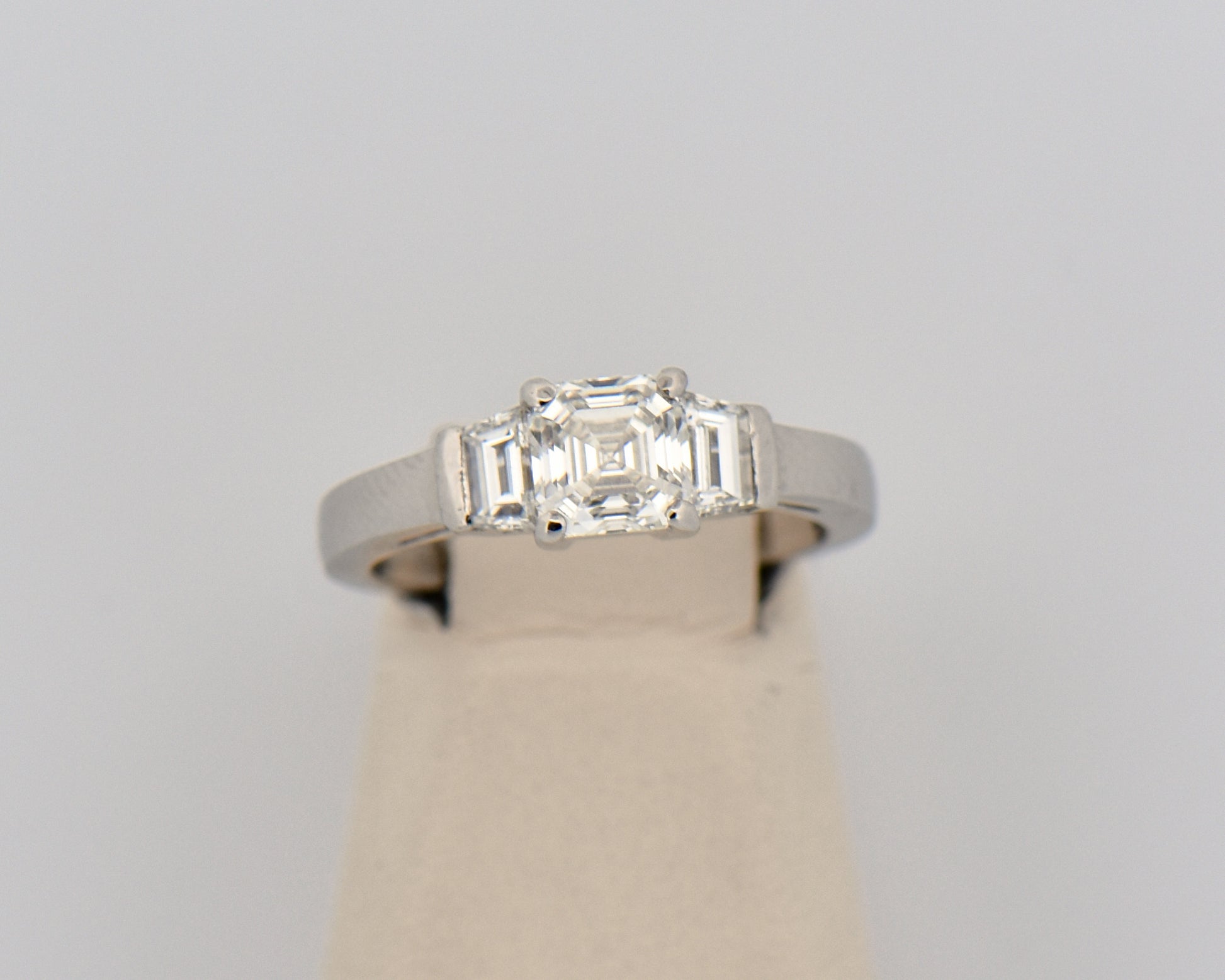 Details: Custom platinum engagement ring with a natural 1ct Asscher (VS2, H) and 0.46ctw in natural trapezoid cuts (VS, GH) IGI Report #2907581.