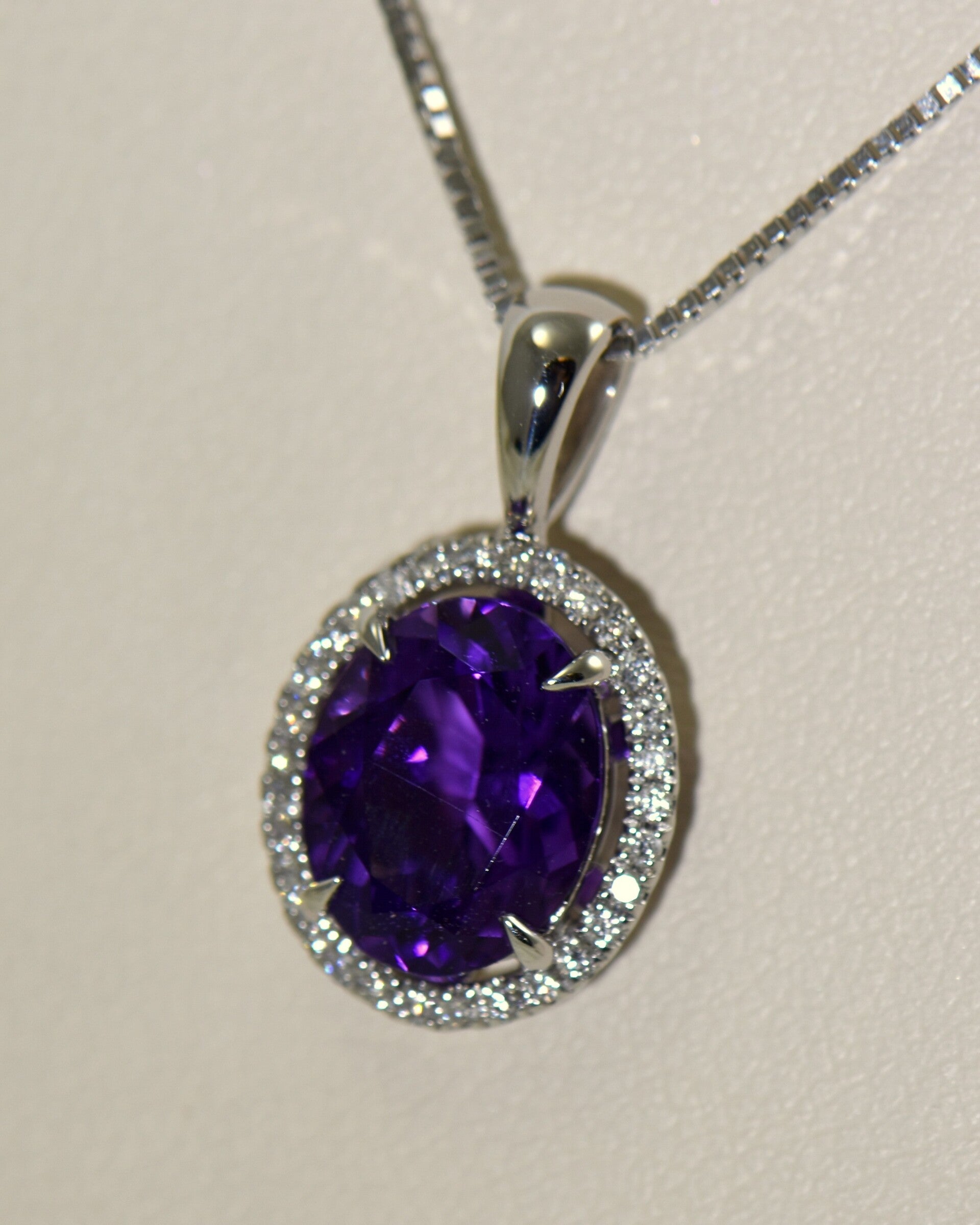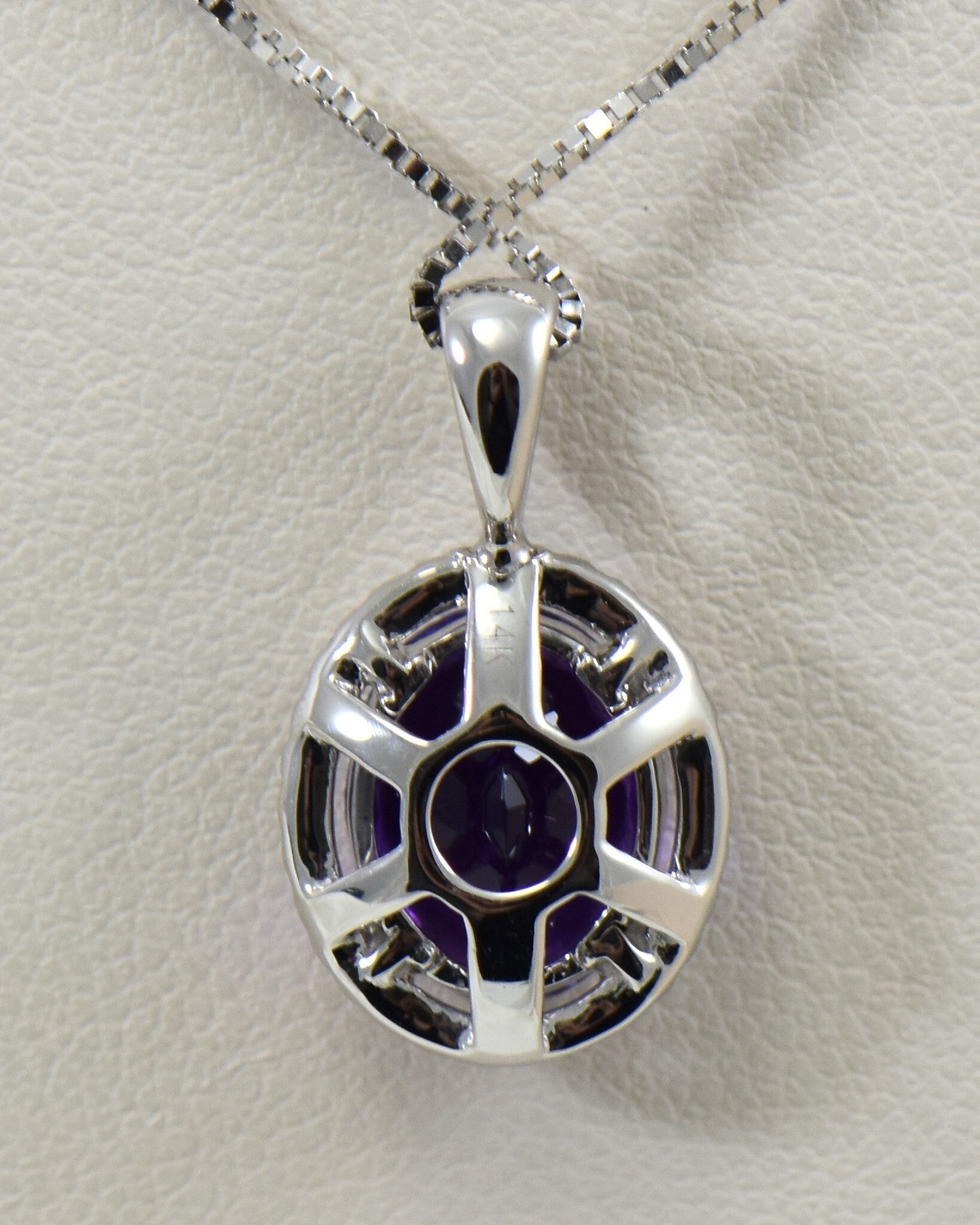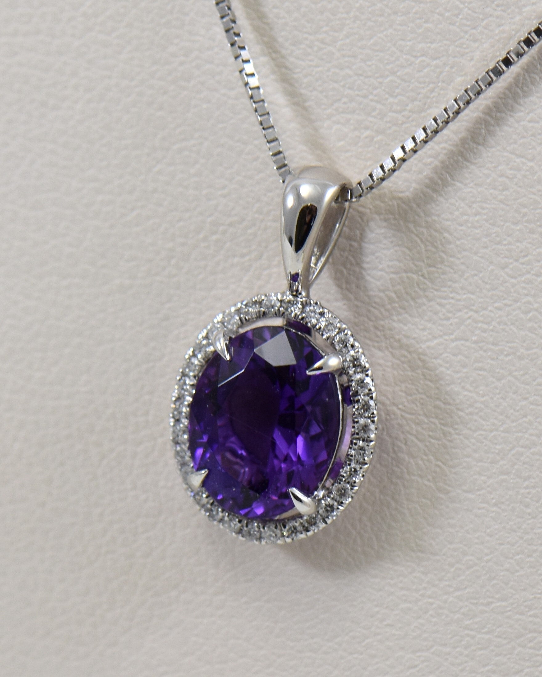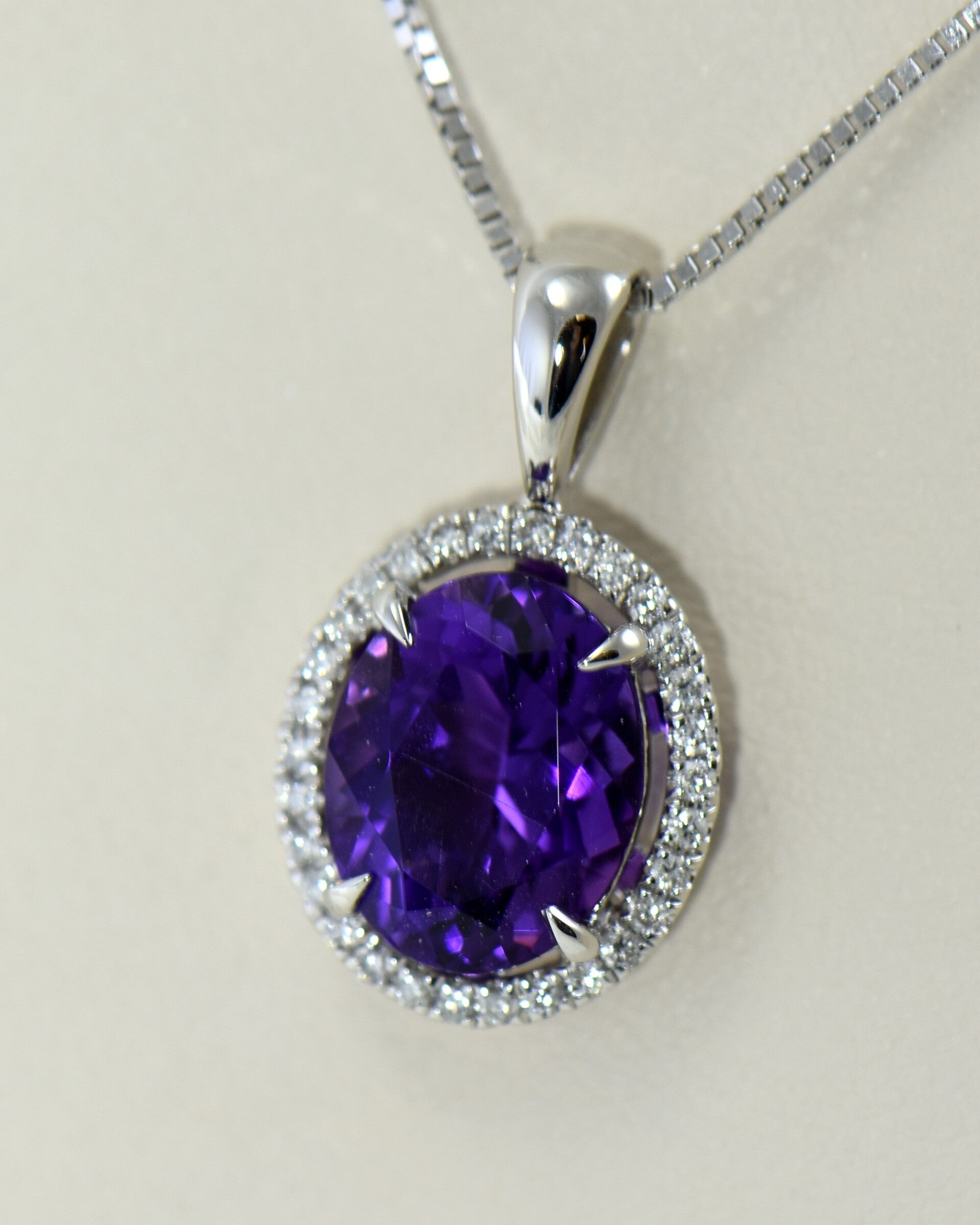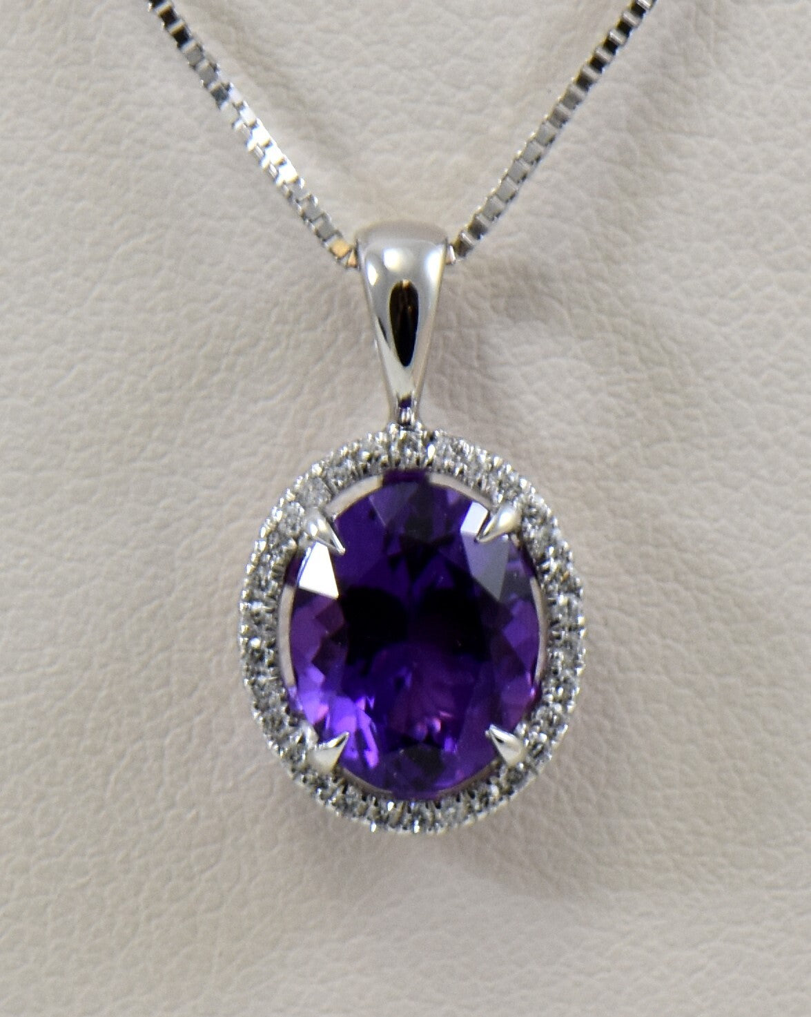 Details: 14k white gold pendant set with a 2.15ct oval amethyst (from Africa) and .15ctw in natural diamond accents (I1 GH).