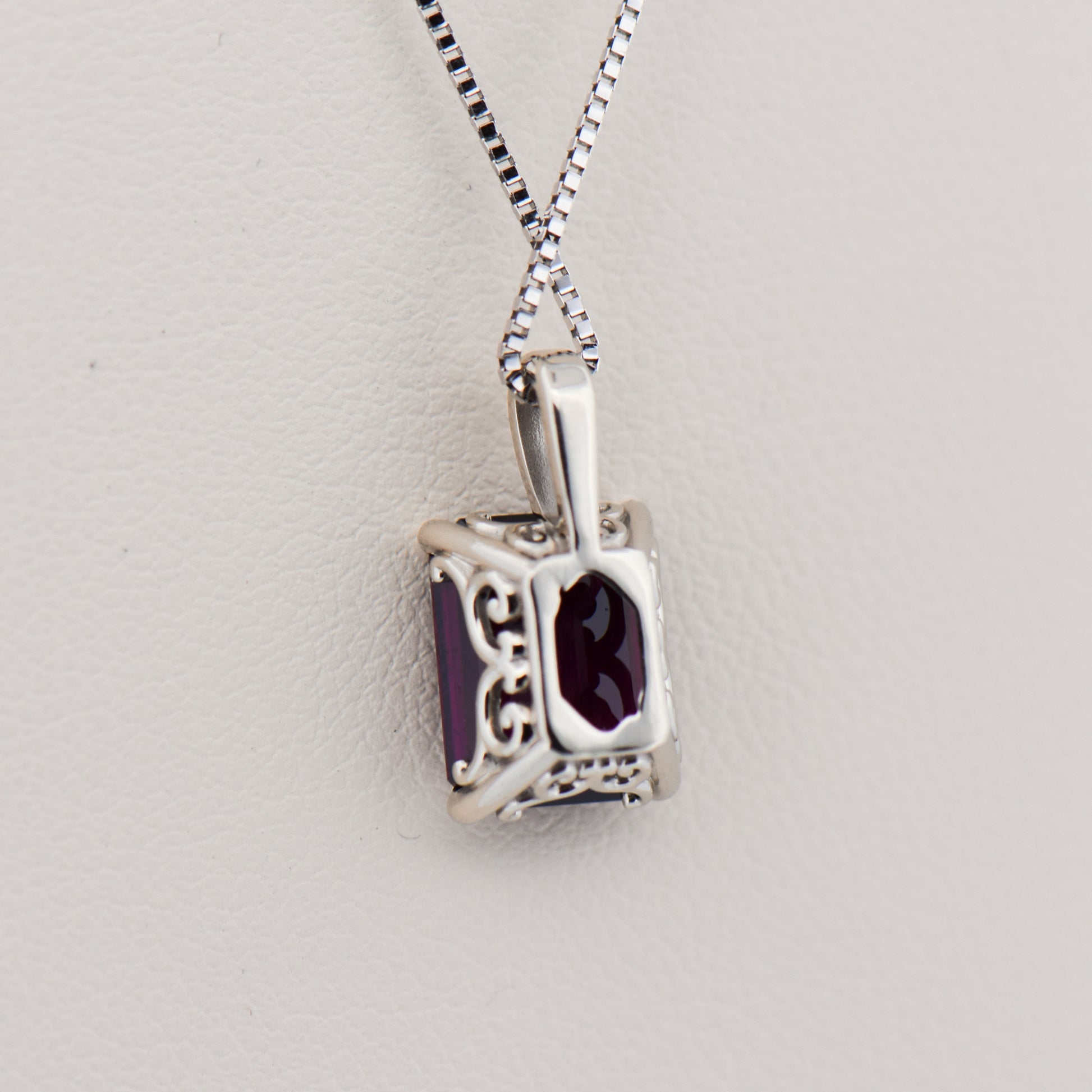Details: Custom 14k white gold solitaire pendant set with a 3.33ct emerald-cut rhodolite garnet from Tanzania (untreated).
