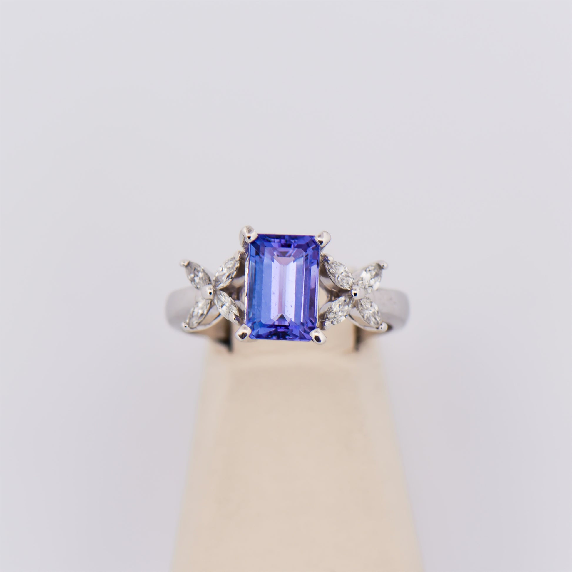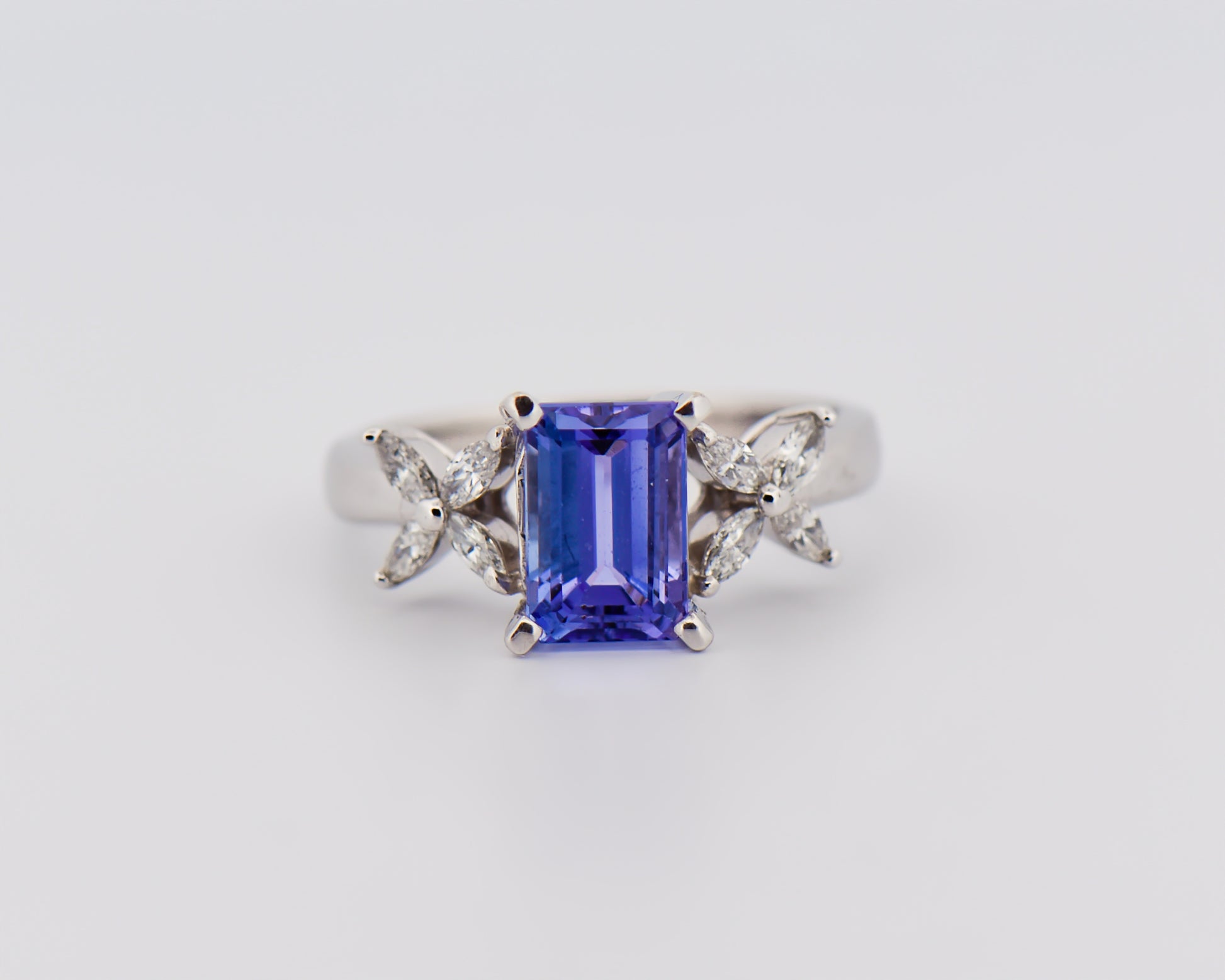 A celebration of vivid color and refined design, this emerald-cut tanzanite ring is a striking statement of elegance. The 2.00-carat tanzanite, cut in a clean emerald silhouette, reveals the gem's signature violet-blue depth with sophistication and clarity. Its geometric lines provide a modern counterpoint to the romantic sparkle of the surrounding diamonds, creating a composition that is both bold and graceful.
