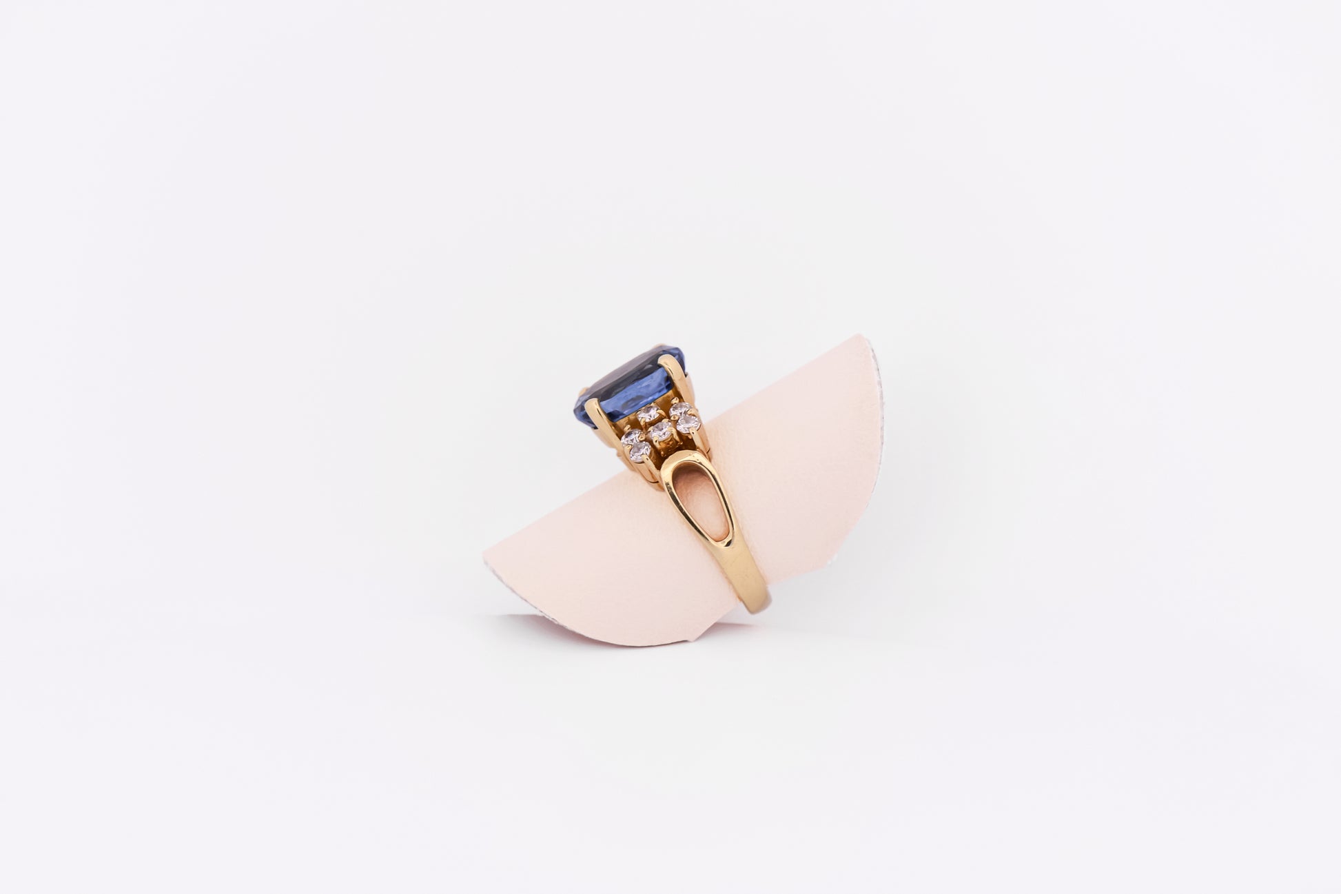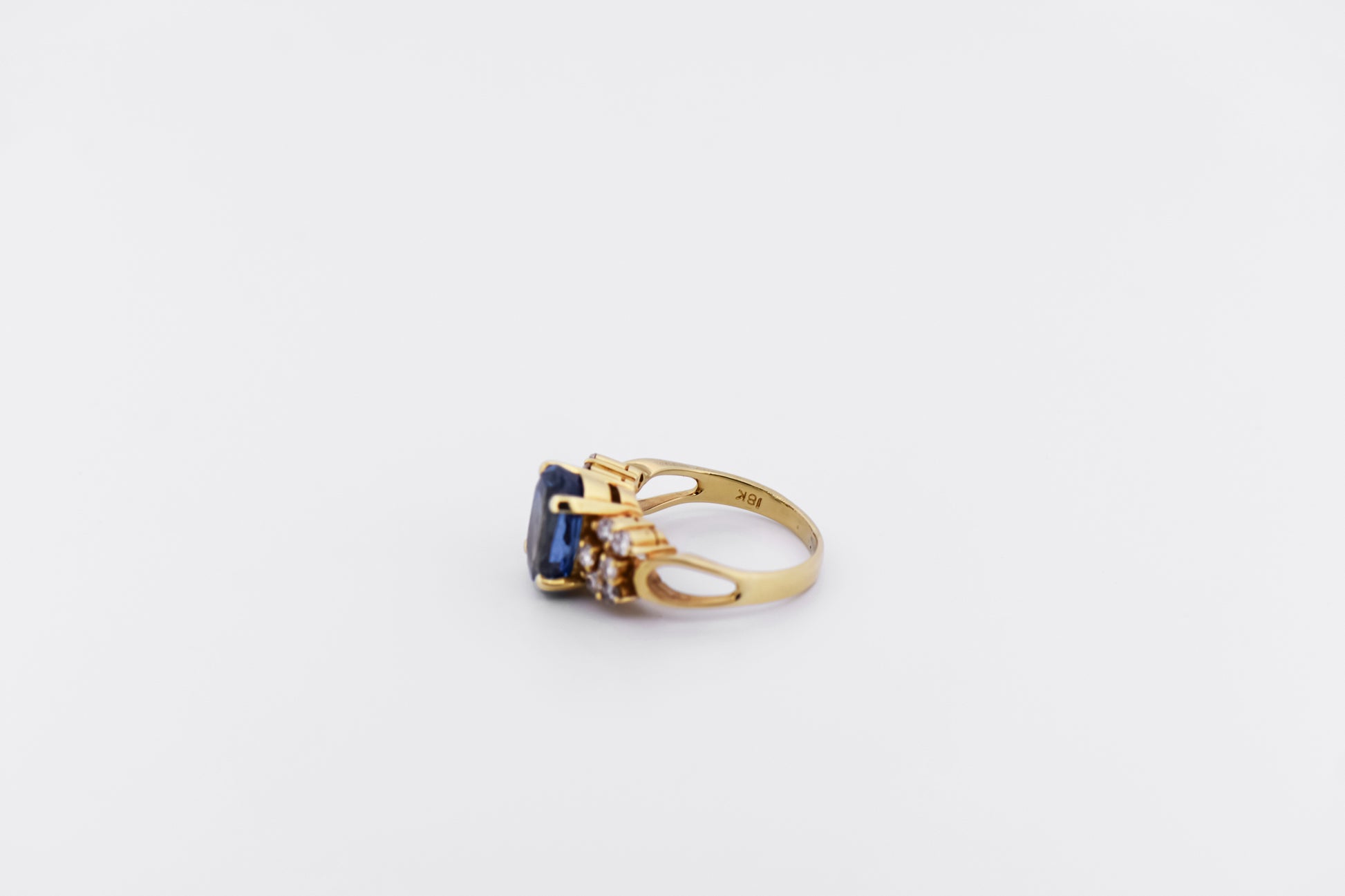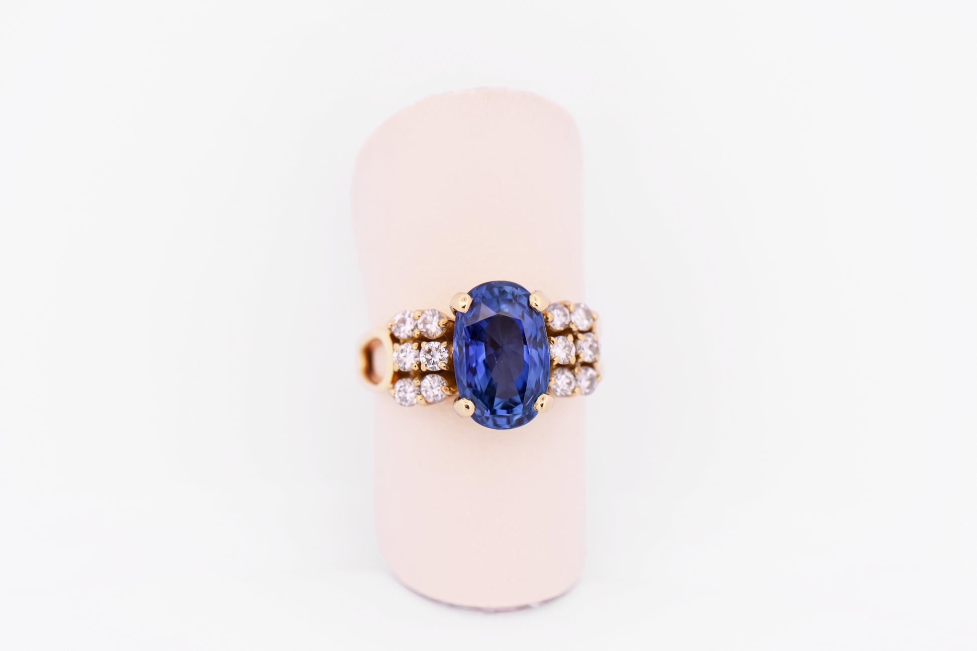 Details: Estate sapphire and diamond ring in 18k yellow gold featuring an approx. 3.5ct oval unheated Sri Lankan sapphire, approx. 0.36ctw diamonds (SI clarity, G-H color).