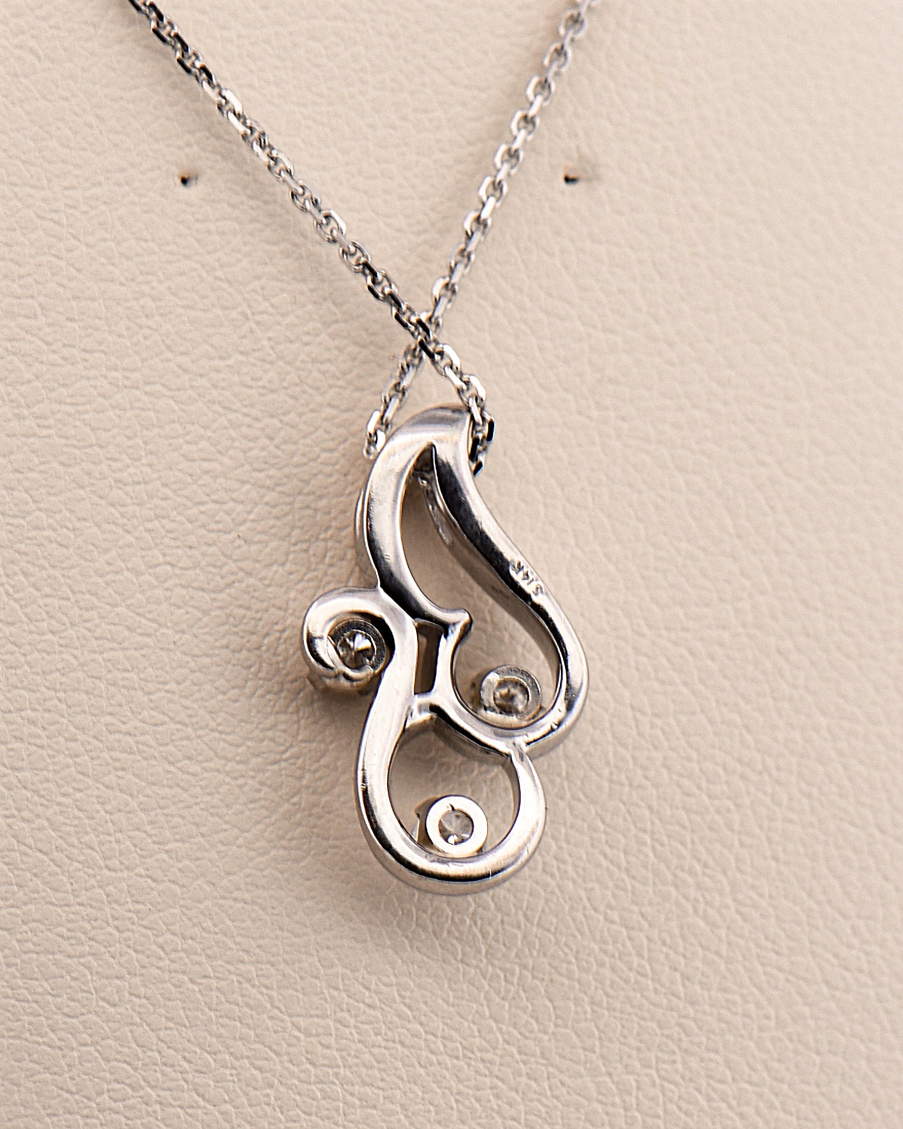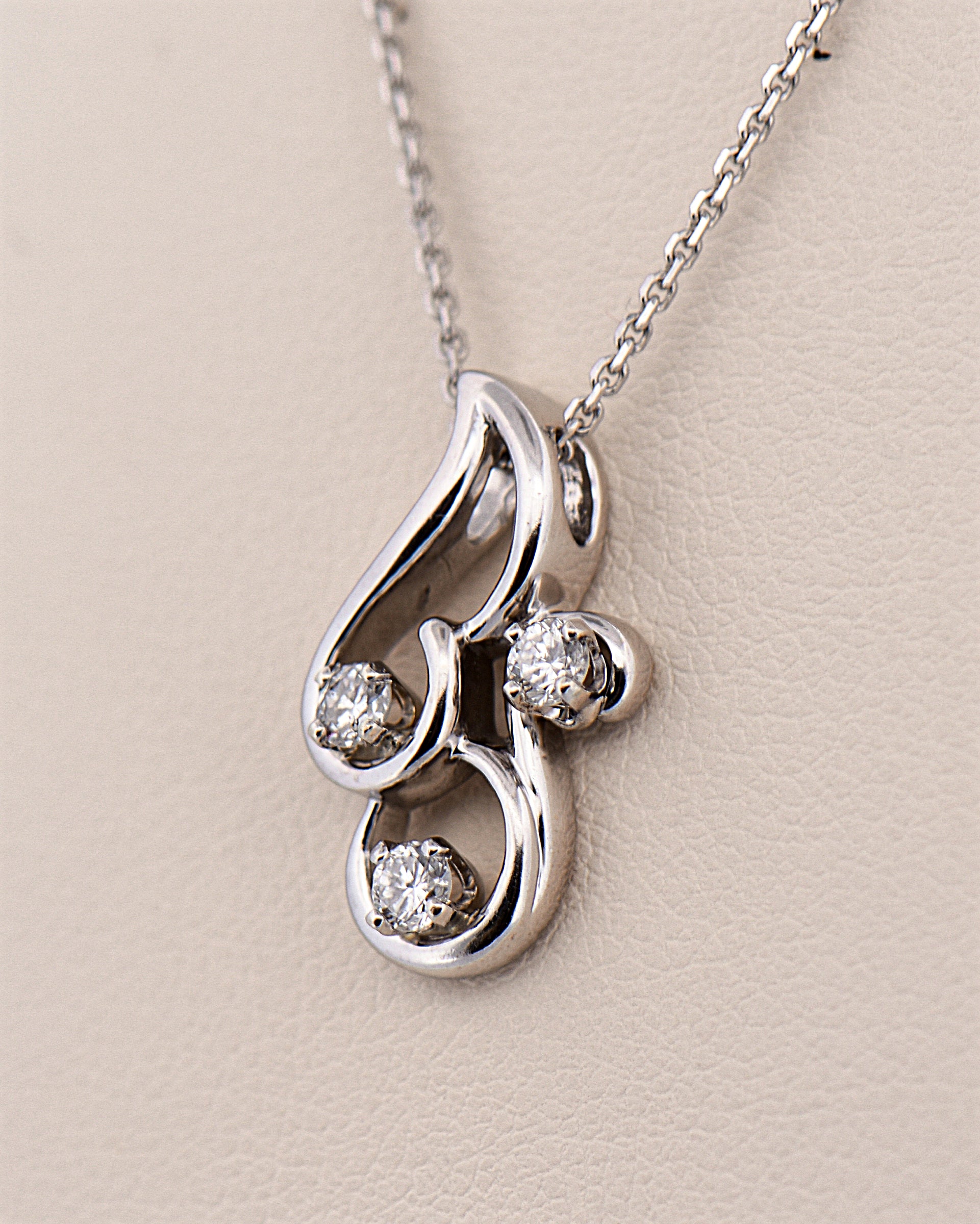 Graceful and expressive, this estate diamond swirl pendant is overflowing with timeless appeal. Set in polished white gold, three round diamonds are delicately arranged within a swirling design that reflects light from every angle.