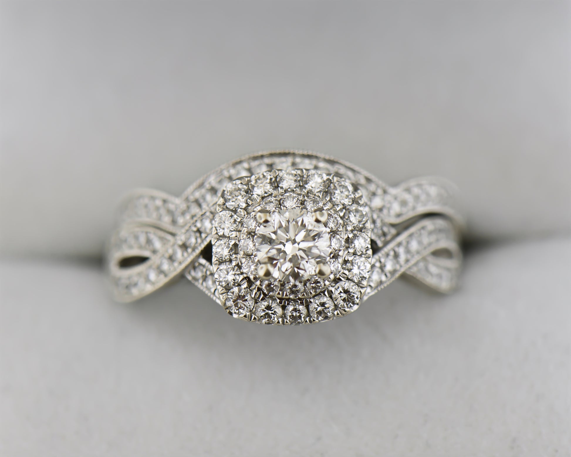 The graceful twist band is adorned with 0.70 carats of diamond accents, creating a continuous shimmer that symbolizes everlasting love. Crafted in 14k white gold, this set strikes a balance between classic beauty and contemporary flair, making it the perfect choice for the modern bride. With its refined design and heirloom quality, this piece promises to shine for generations as a symbol of commitment and artistry.