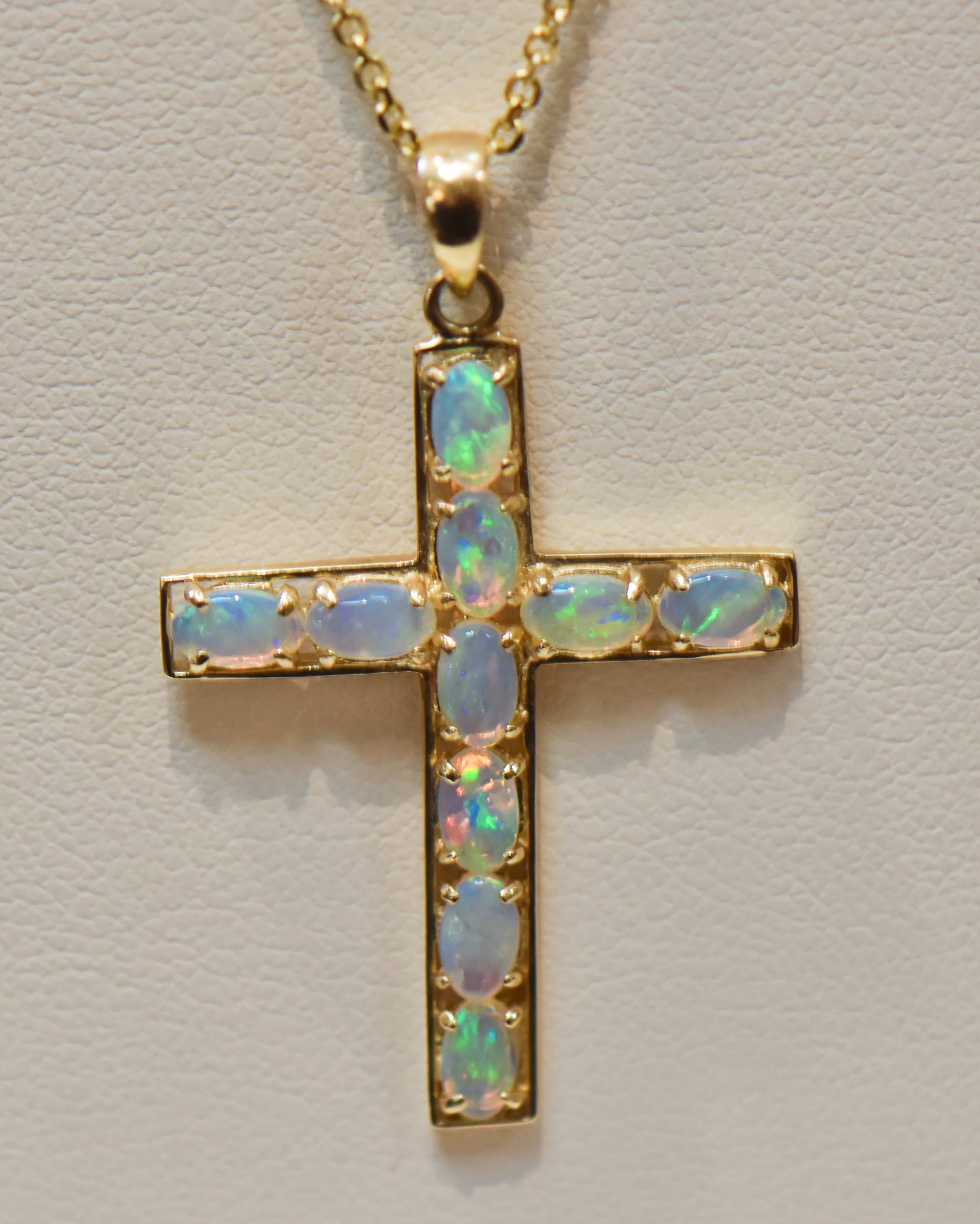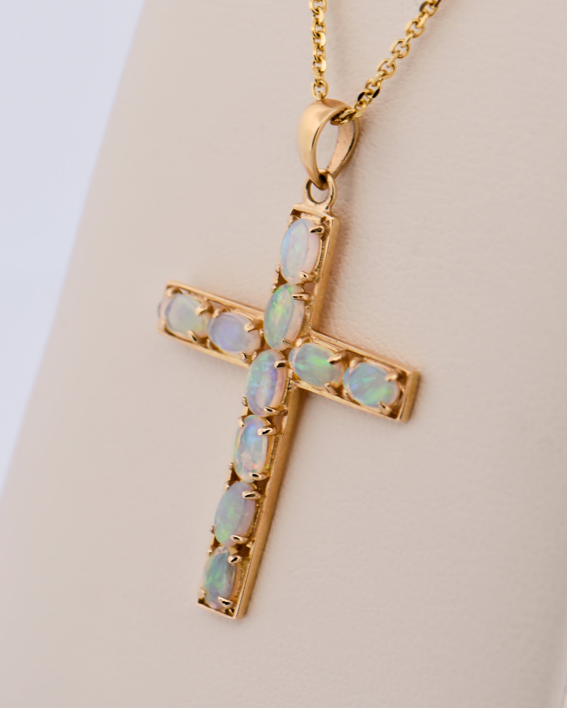 The cross design balances spiritual symbolism with refined craftsmanship, while the opals’ natural iridescence adds a soft, captivating glow. Elegant enough for special occasions yet versatile for everyday wear, this piece embodies both faith and artistry in perfect harmony.