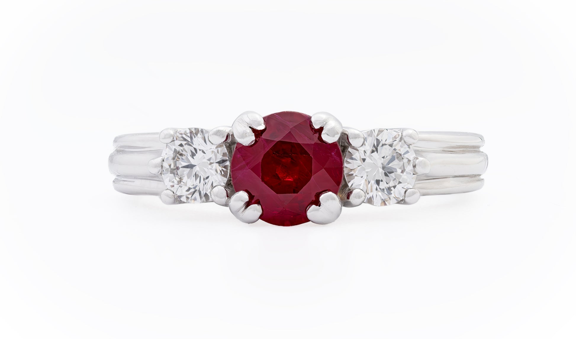 Elegant and timeless, this three-stone ring centers on a vivid ruby framed by brilliant white diamonds. Crafted in 18k white gold, the design features a classic trellis setting that allows light to flow through each stone, enhancing their natural brilliance and depth.