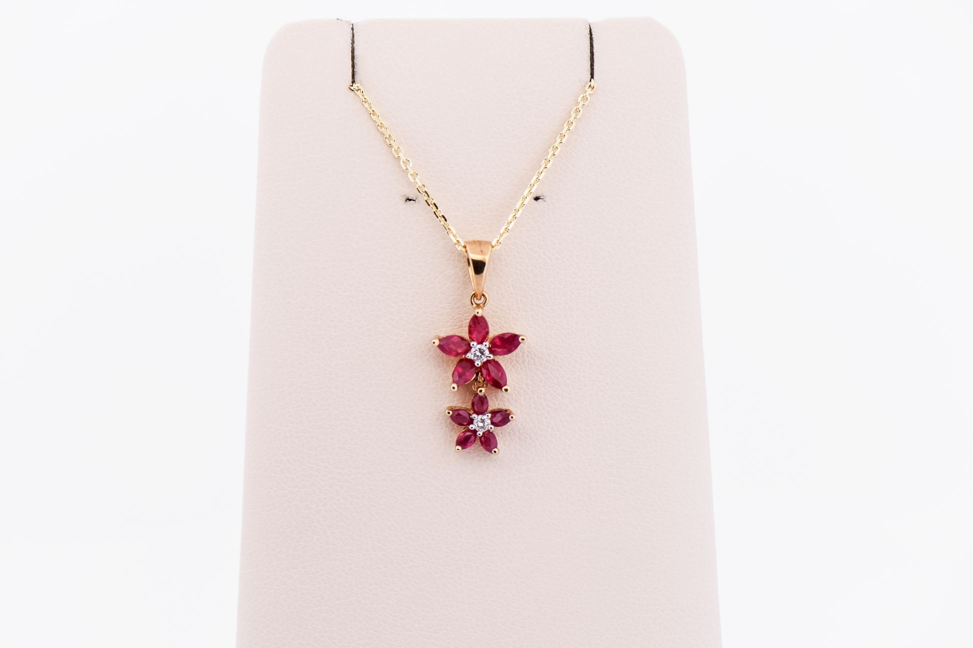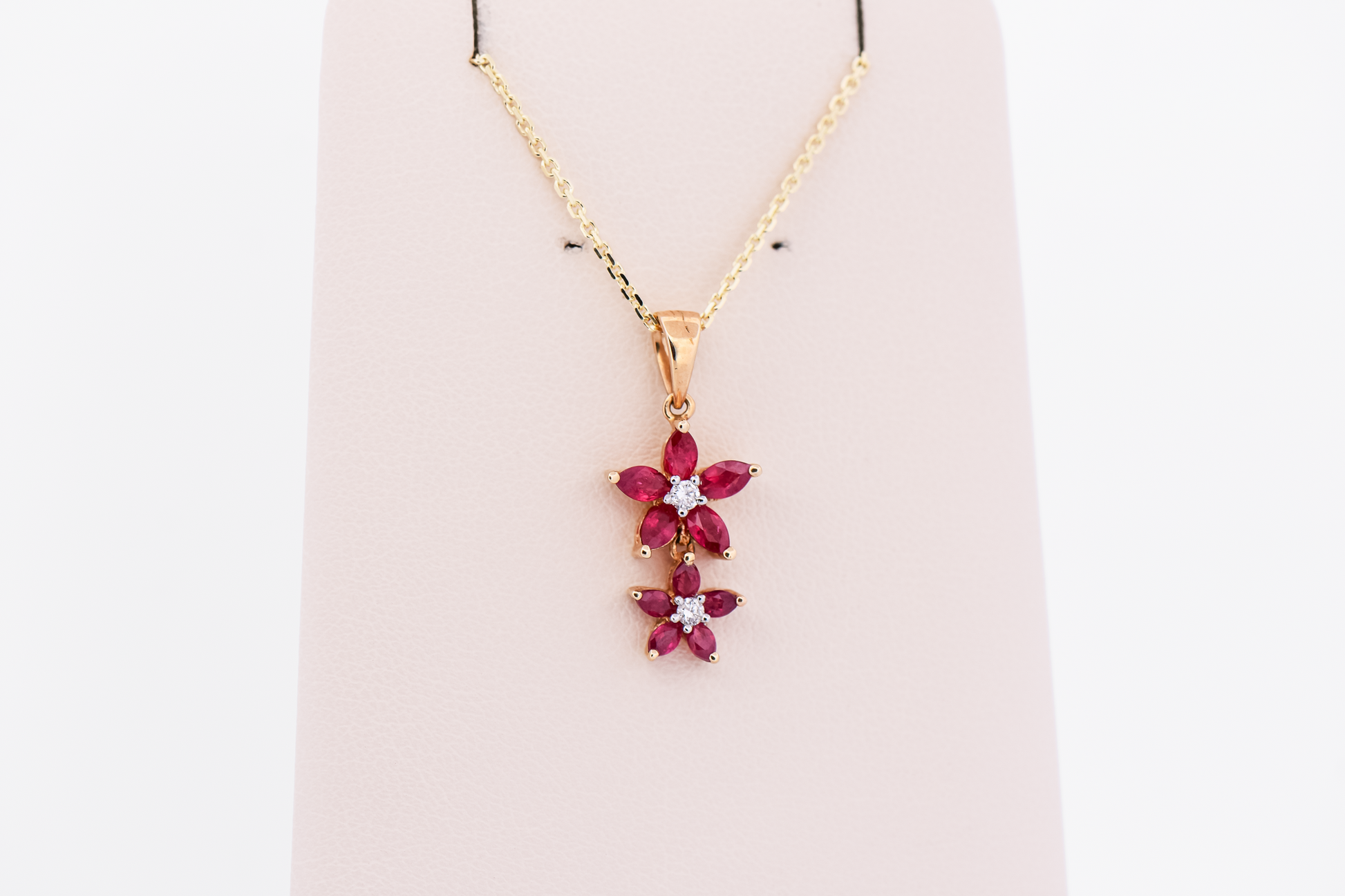 At the center of each flower, sparkling diamonds add a subtle brilliance, enhancing the rich red hues of the rubies without overpowering their natural beauty. The drop design adds gentle movement, allowing the pendant to catch the light beautifully as it rests along the neckline.