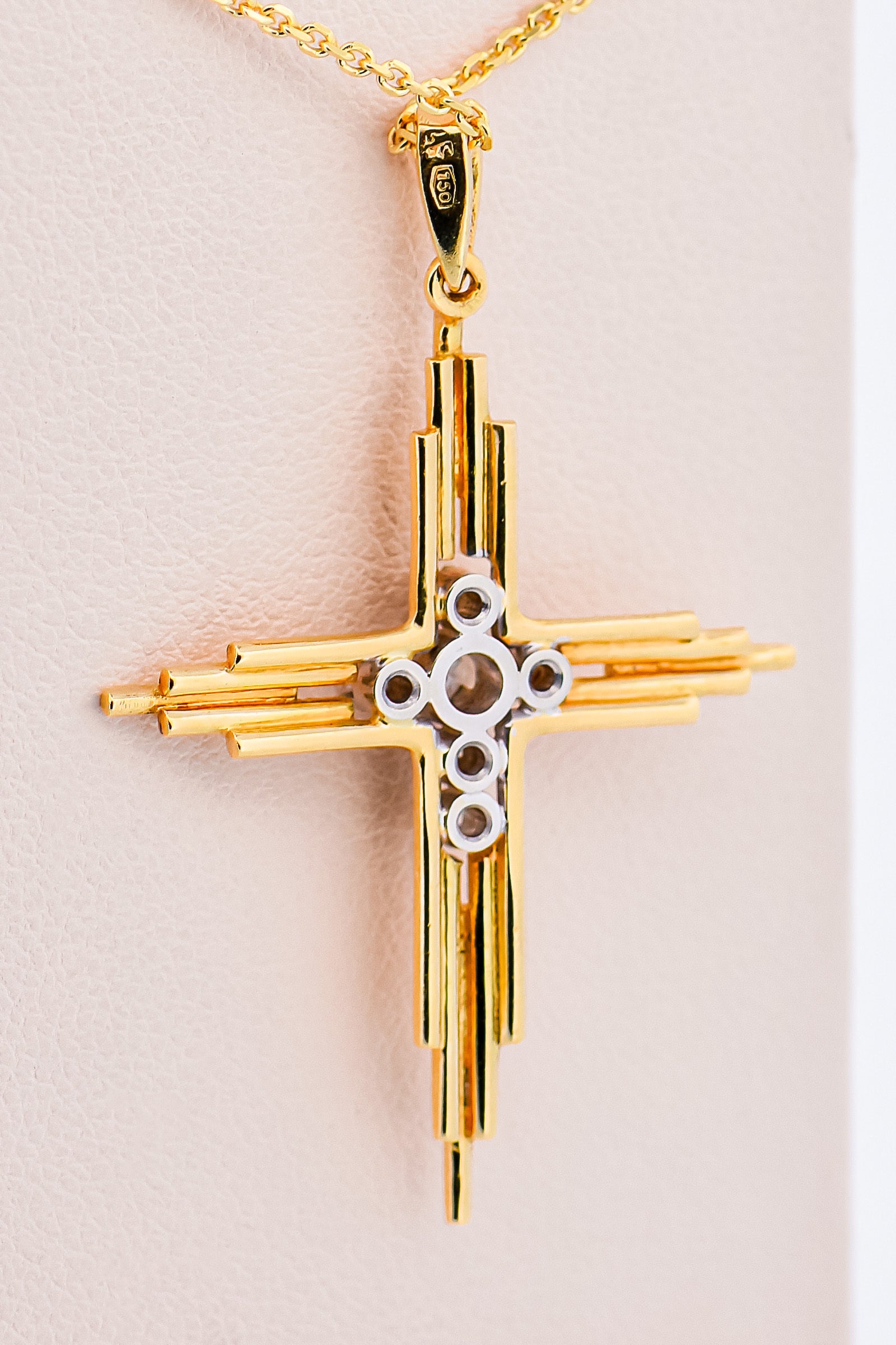 Details: Unisex diamond cross pendant crafted in 18k two-tone gold featuring approximately 0.15 carats total weight of diamonds.