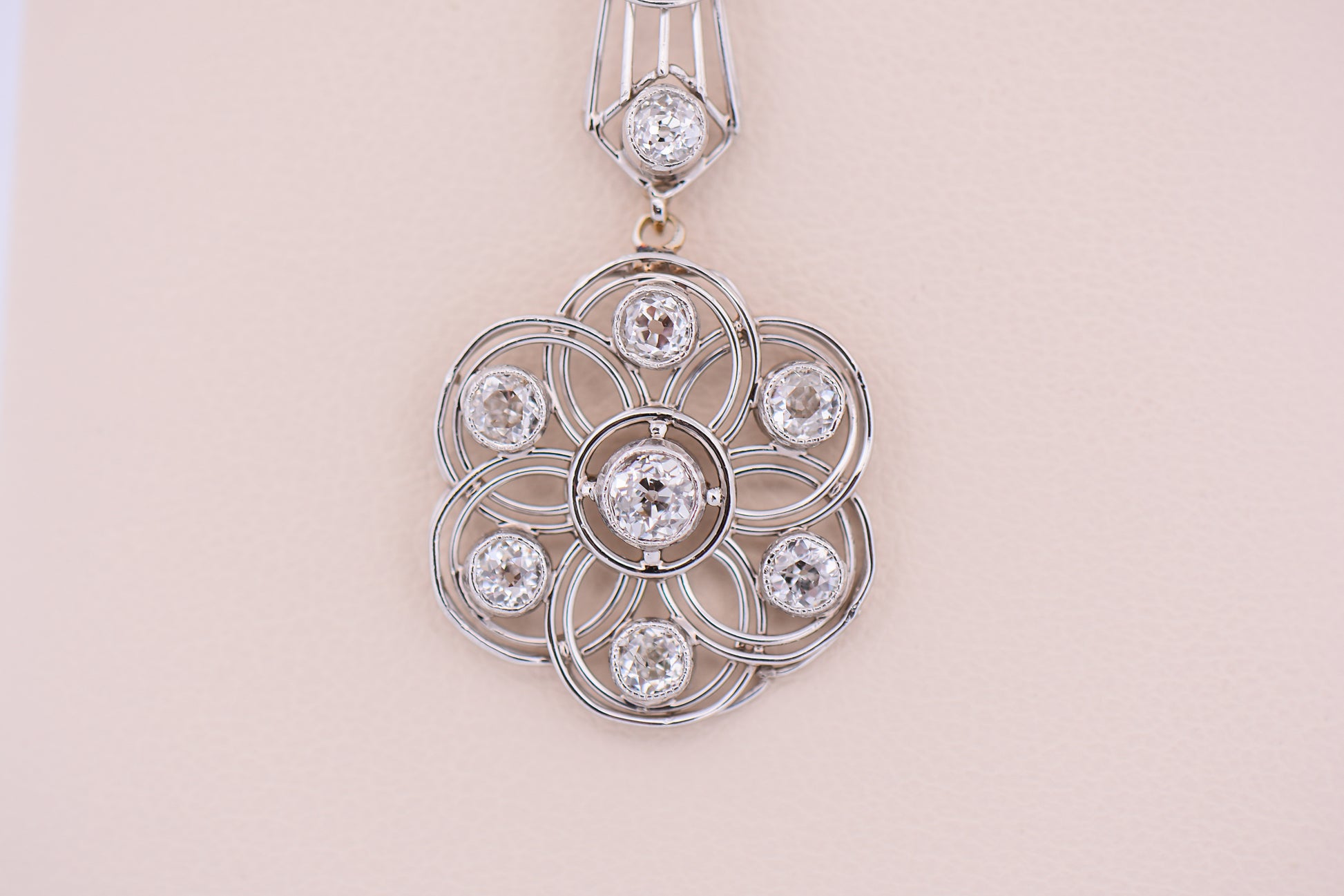 European-cut diamonds are set throughout the pendant, adding a soft antique sparkle that complements the intricate metalwork. The diamonds highlight both the vertical elements and the circular floral drop, enhancing the pendant’s movement and emphasizing the distinctive architectural style of the Art Deco period.