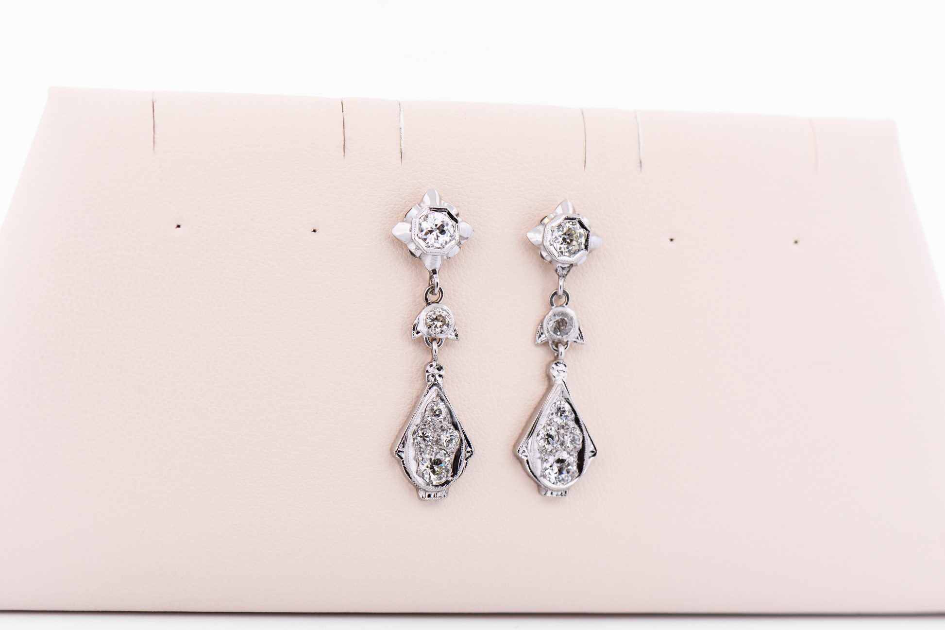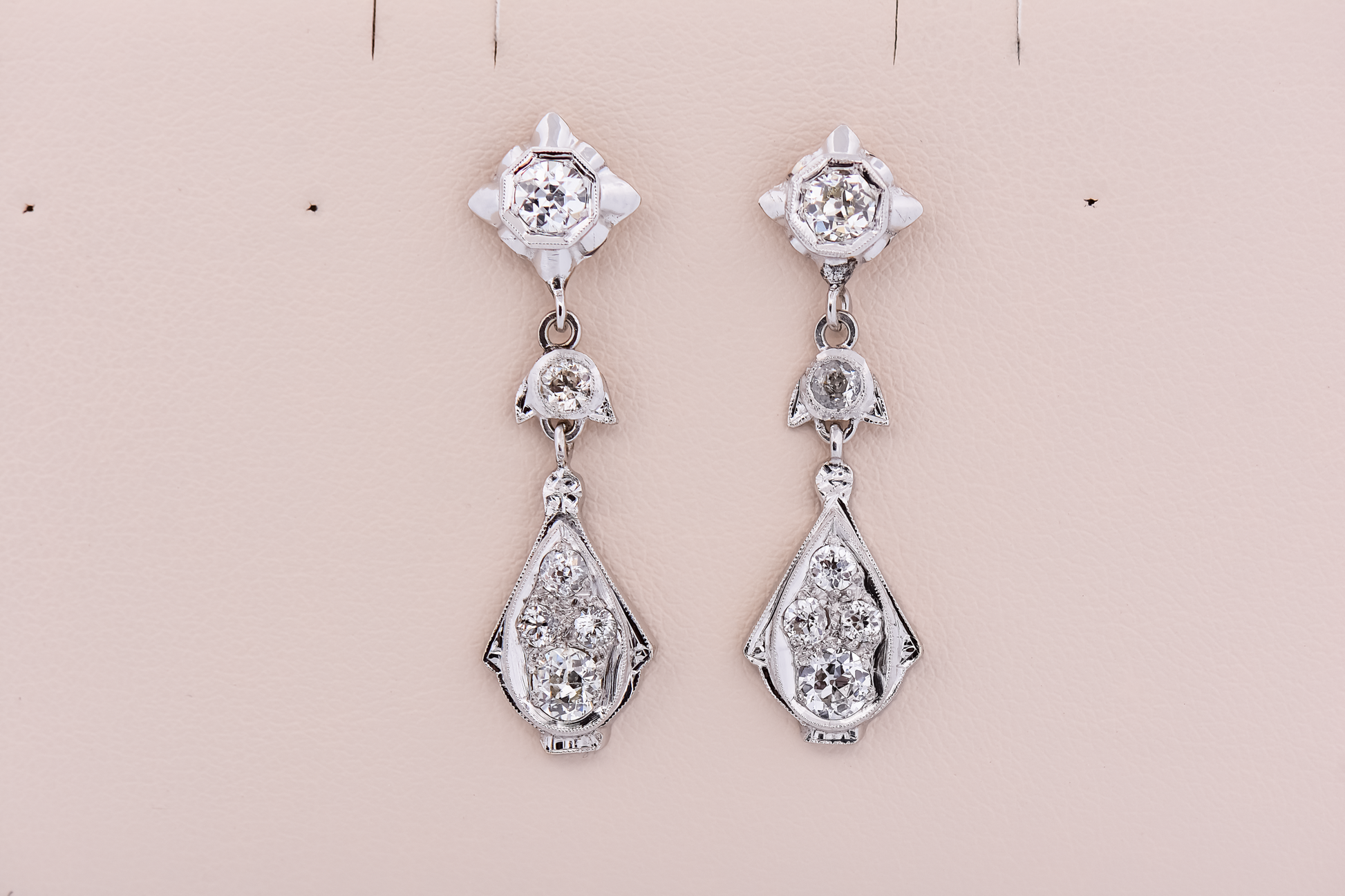 Each earring is set with a combination of old European-cut diamonds, their soft, romantic sparkle enhanced by the clean geometry of the Deco design. The elongated drop culminates in a teardrop-shaped cluster, framed by delicate milgrain detailing that adds texture and period authenticity.