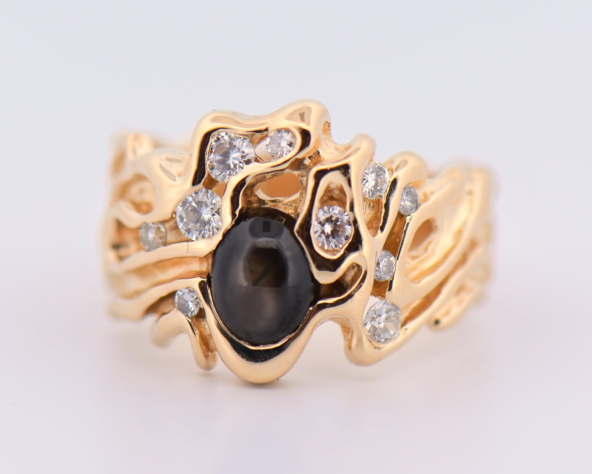 Details: Estate custom 14k yellow gold freeform men's ring set with a 1ct, 8x6 mm oval black star sapphire and .45ctw of single-cut and round natural diamond accents (SI-I1, GH), circa 1975.