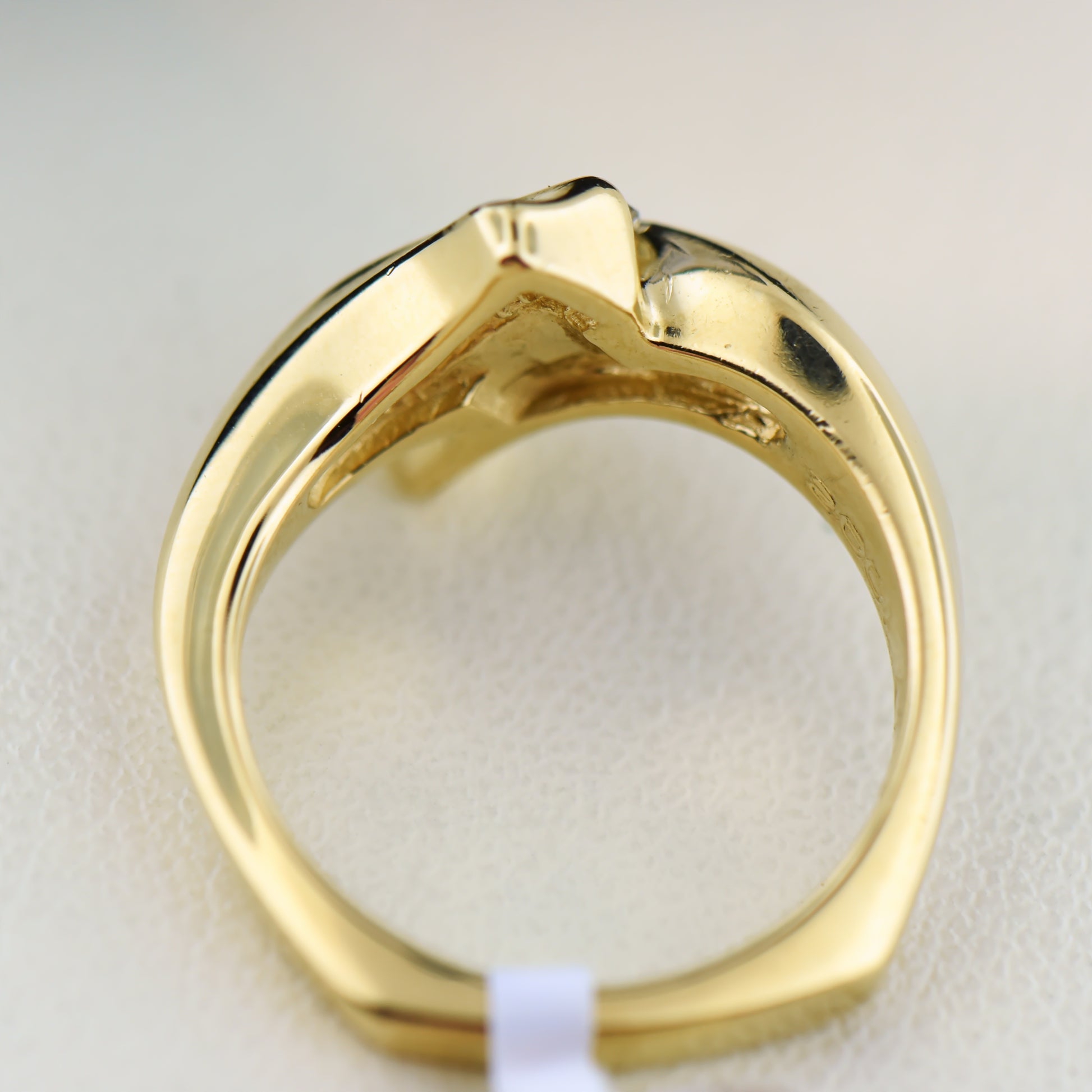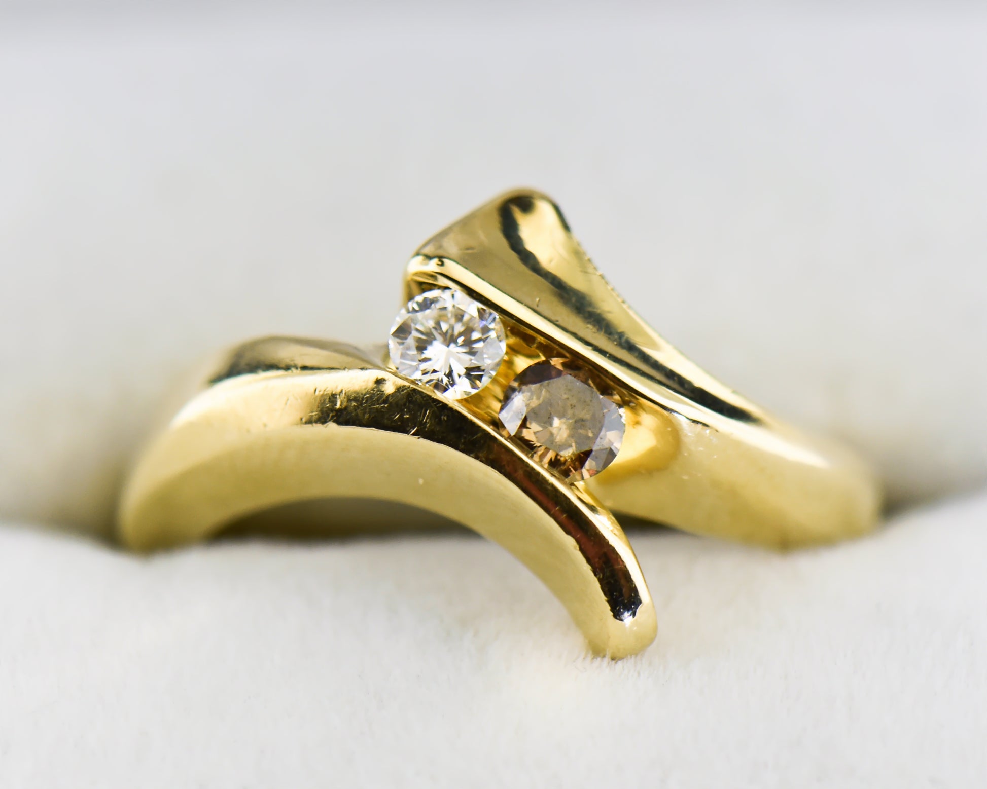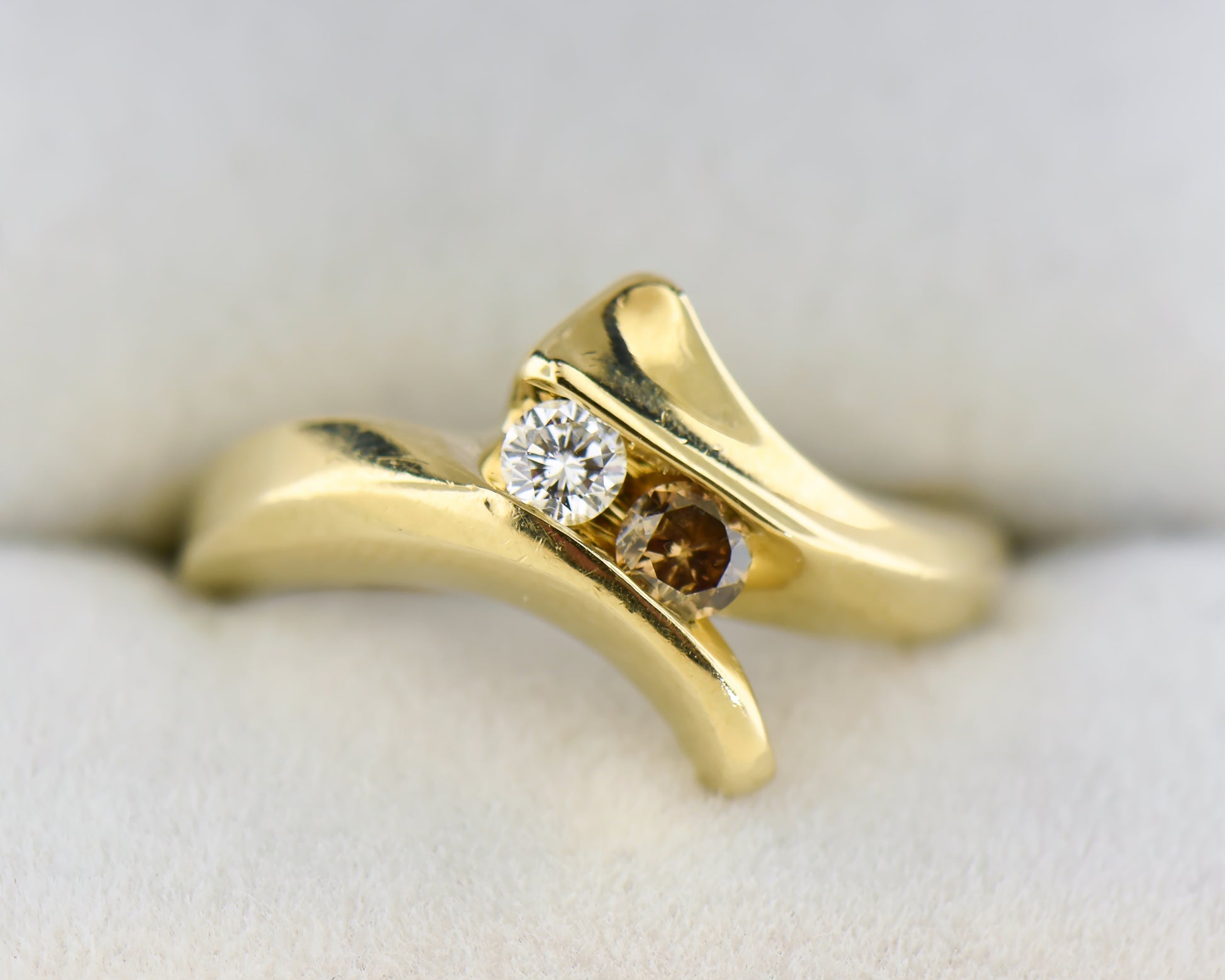 Details: Custom 14k yellow gold bypass ring set with two natural diamonds on a heavy gold euro shank: .10ct white diamond (SI GH) and .15ct brown diamond (SI C7).