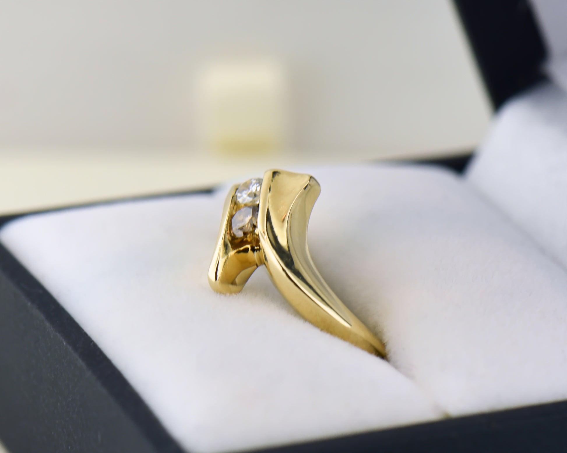 This stunning custom gold ring was designed for someone who needs a durable everyday piece while still wanting something unique. Crafted using the wax casting, the ring features a heavy gold bypass design set with two natural diamonds. Both diamonds have a combined total weight of 1/4 carat and exhibit excellent brilliance, enhancing the overall aesthetic of the piece.