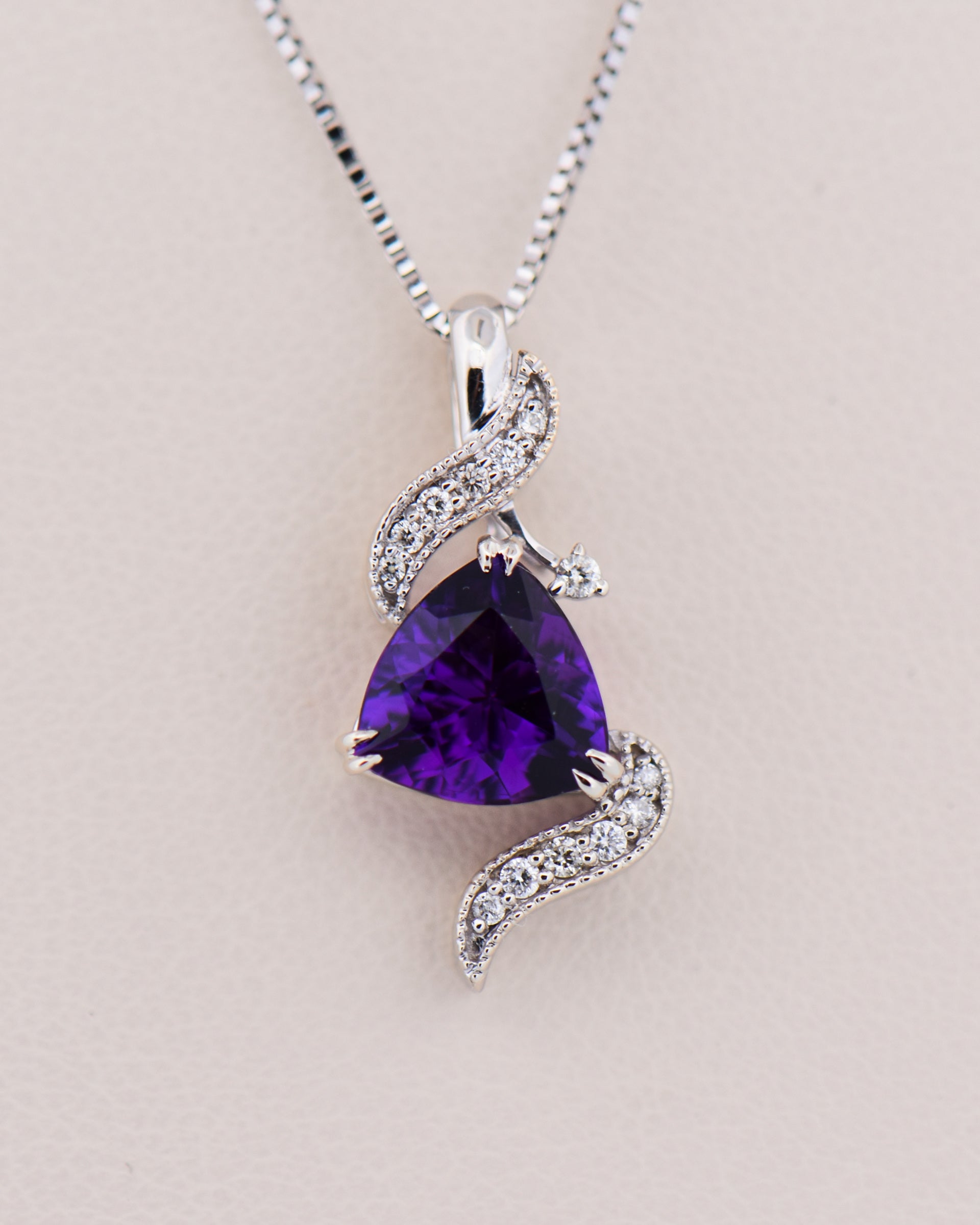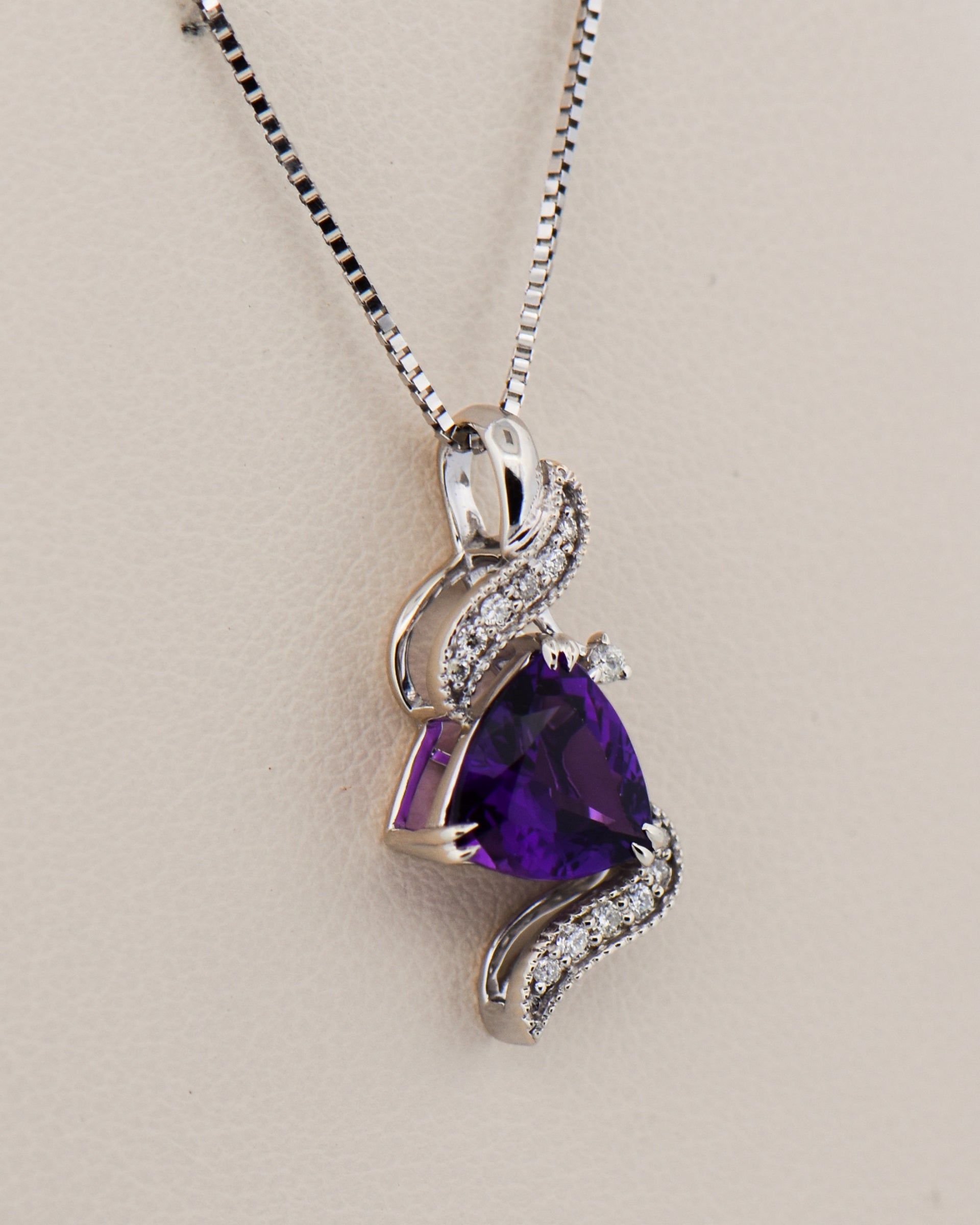 Details: Custom 14k white gold pendant set with a 1.26ct deep-color amethyst trillion and 0.08ct diamond accents (I1 GH).