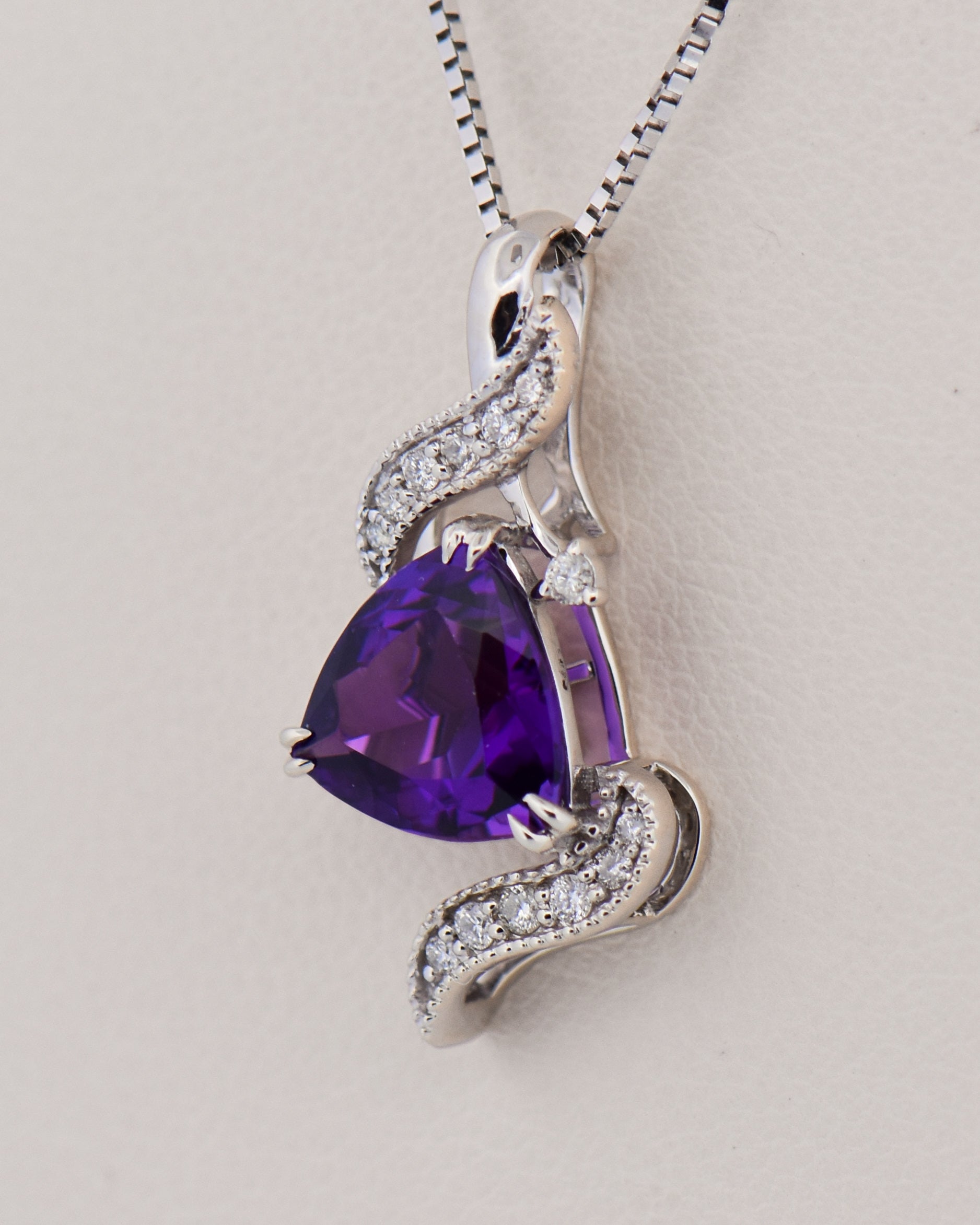 This stunning amethyst pendant is a custom creation by FWC Jewelers. Crafted in white gold, the pendant has a freeform design showcasing a high-quality trillion-cut amethyst. This Uruguayan amethyst exhibits a deep, dark purple hue, so rich that it reflects flashes of blue and red in certain lighting, highlighting its exceptional quality. Swirling white gold elegantly flows behind the amethyst, adorned with sparkling diamond accents. This pendant makes a perfect gift for those born in February, but it is also suitable for any occasion.