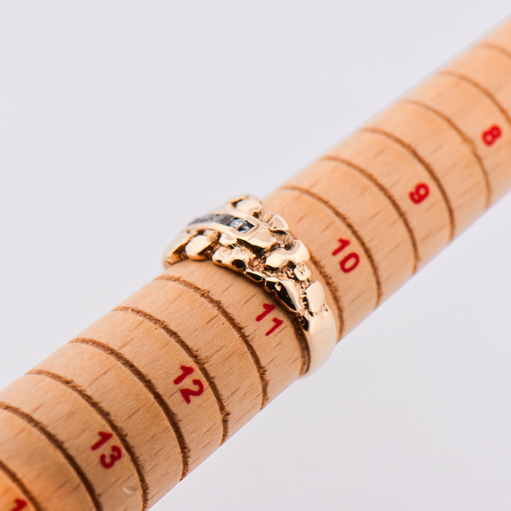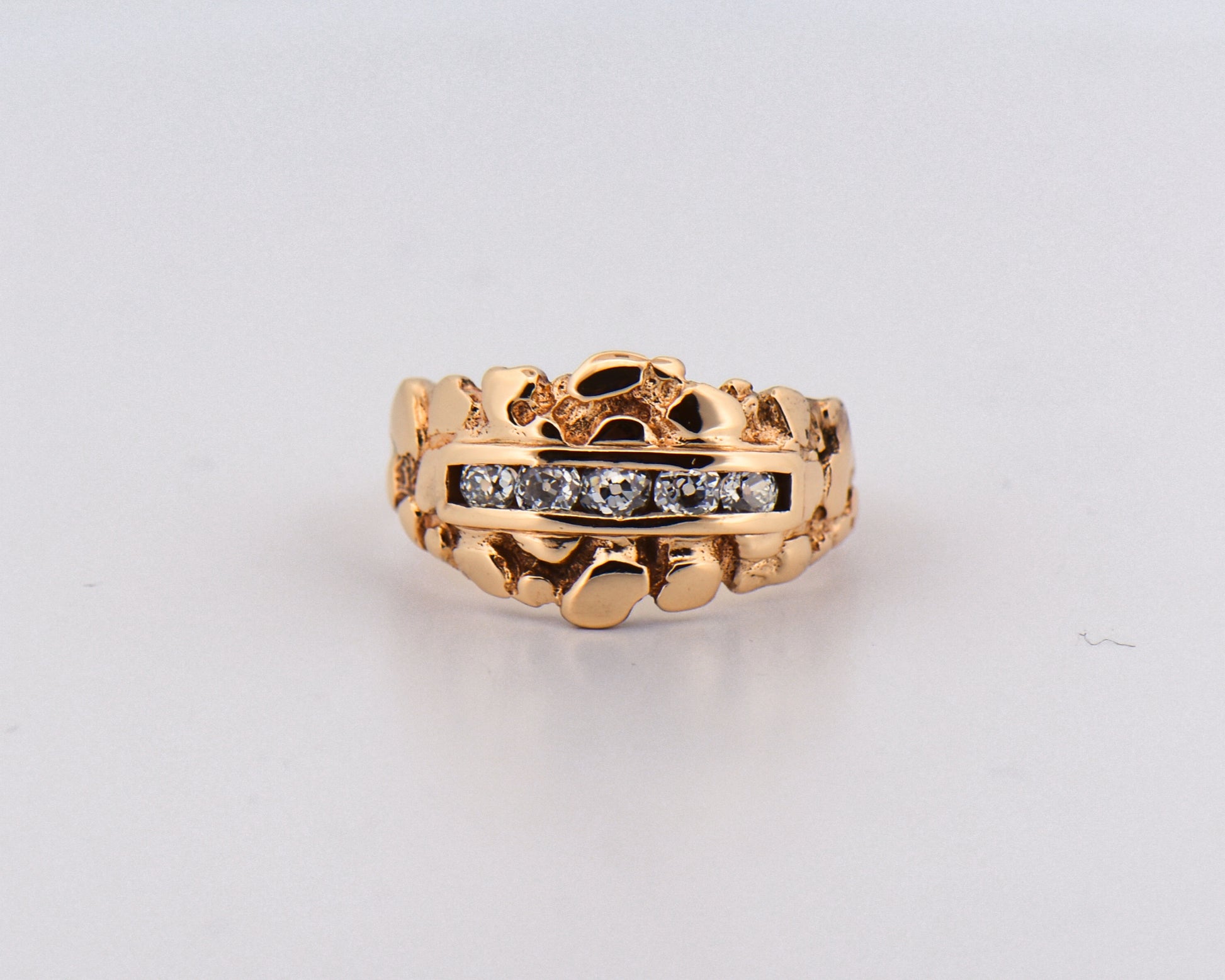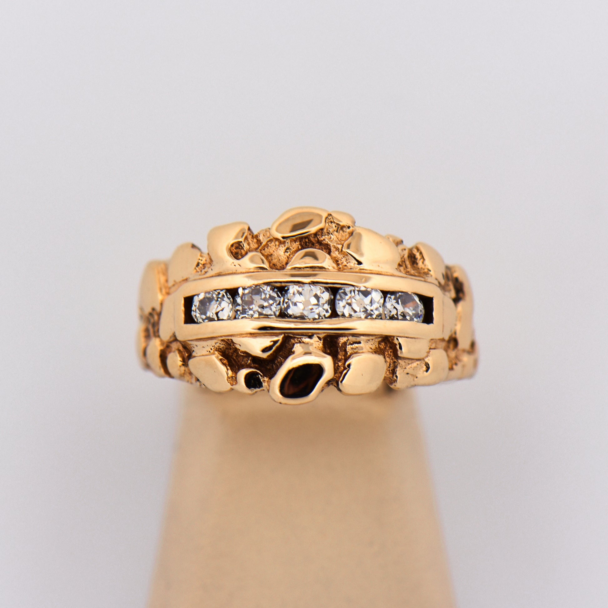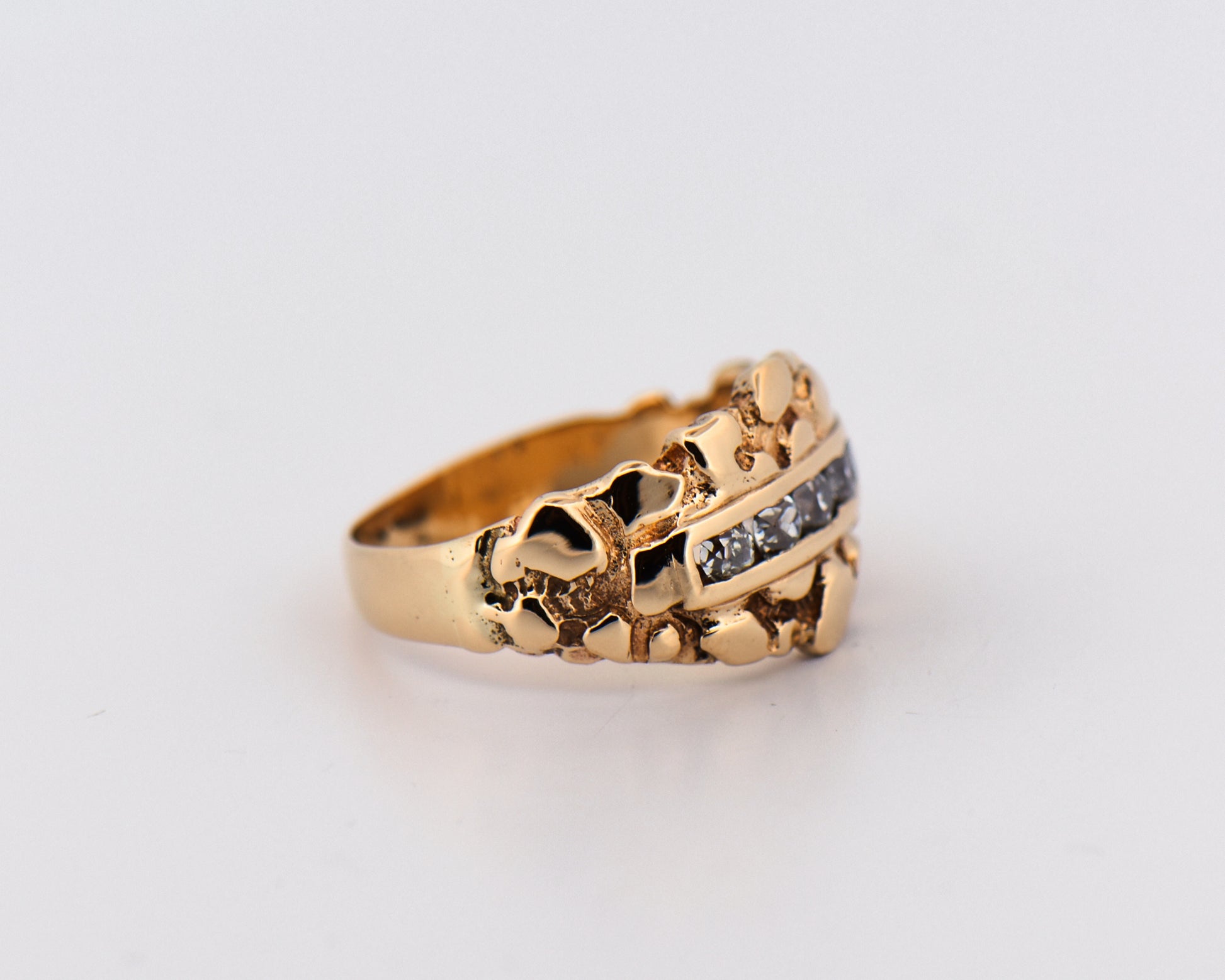 Details: 14k yellow gold men's nugget-style wedding band set with 1.00ctw of vintage mine-cut diamonds (VS clarity, GH color), circa 1970.