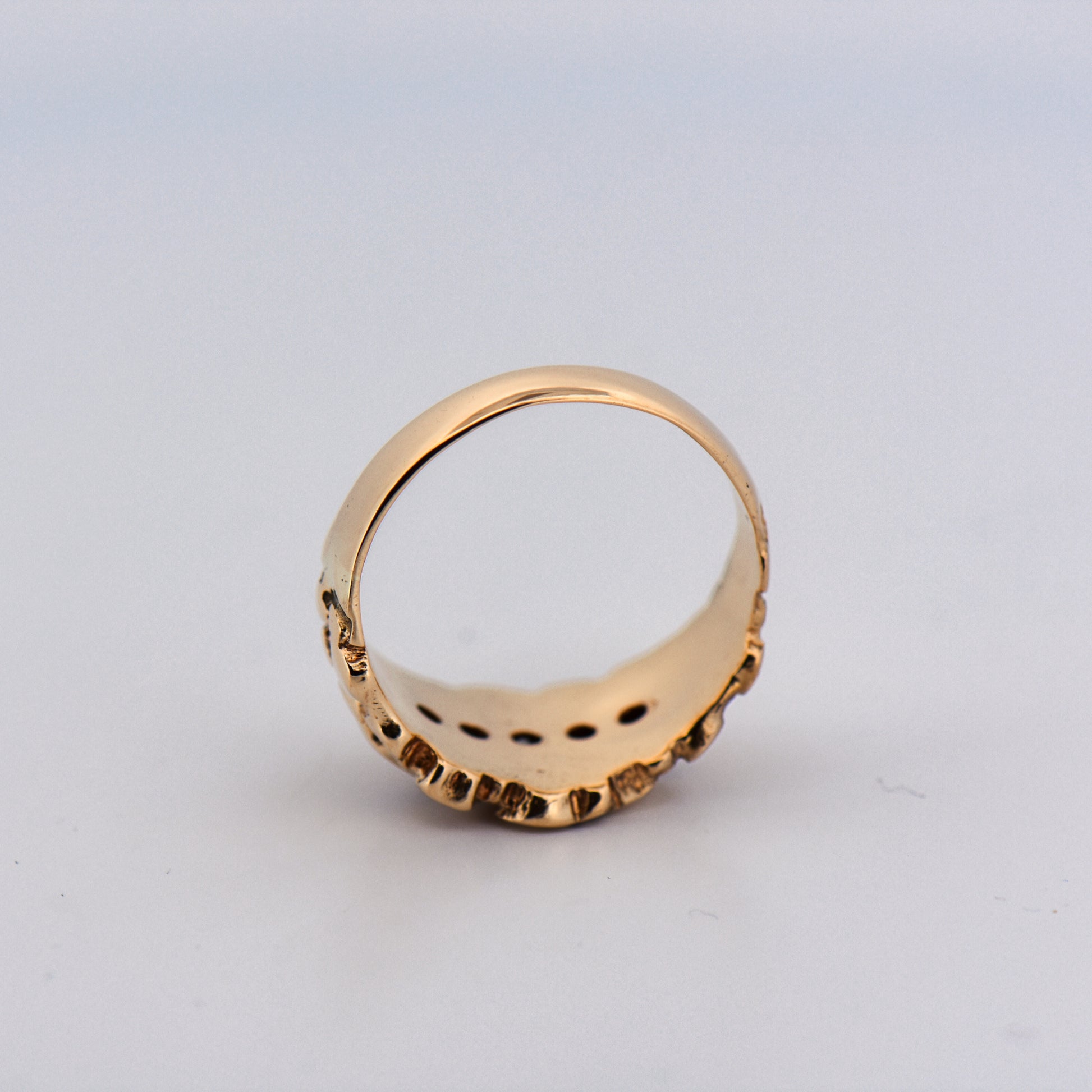 Bold, bright, and bursting with character. This men’s wedding band hails from the 1970s, and strikes the perfect balance between rugged sophistication and elegant sparkle. Crafted in rich 14k yellow gold with a classic nugget motif, the band is set with approximately 1 carat of channel-set, vintage mine-cut diamonds. The crisp glimmer of the gems add contrast and sophistication to the bold gold surface, creating a statement piece that feels both timeless and distinct.