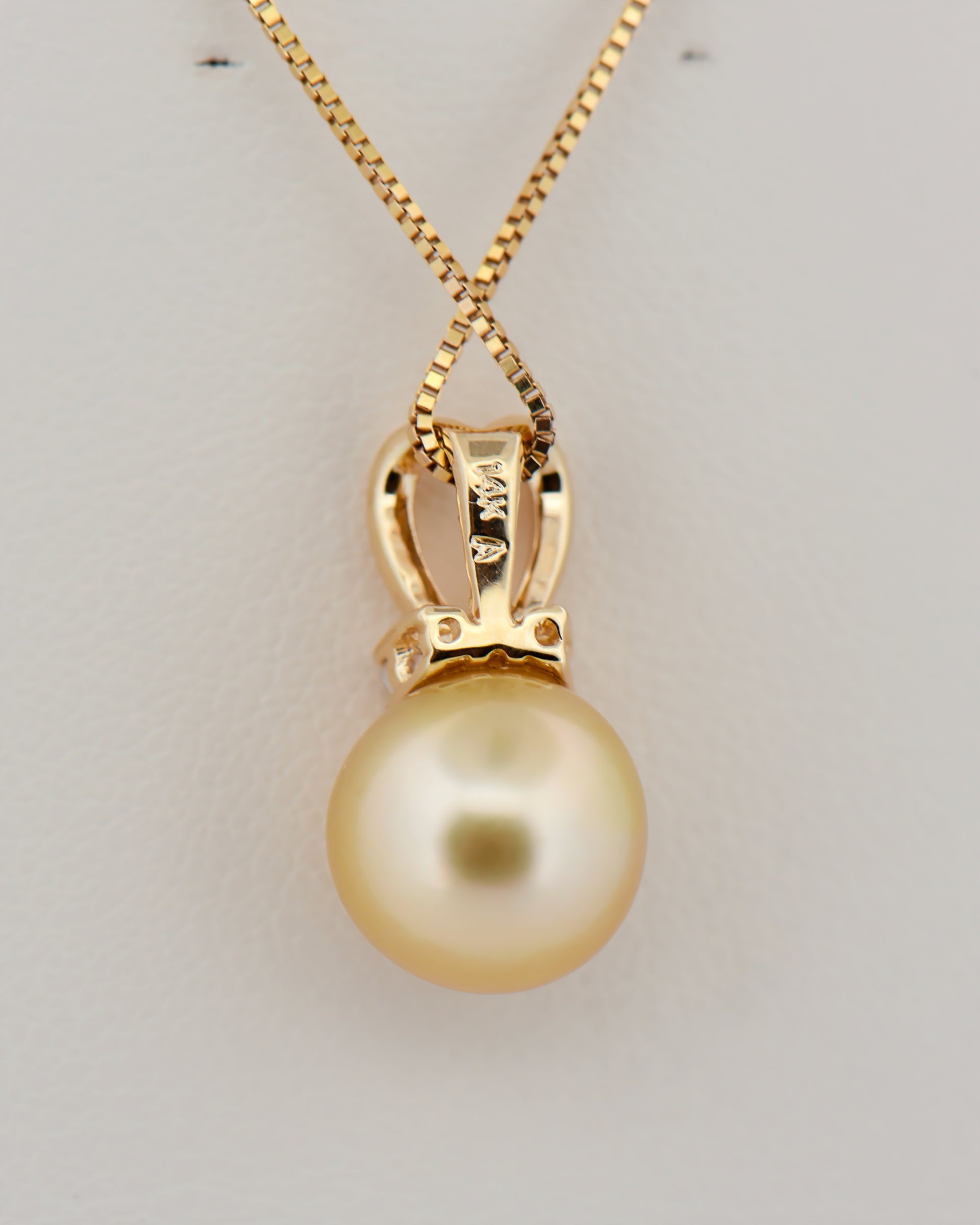Details: Golden South Seas pearl and diamond pendant in 14k yellow gold featuring 10mm pearl accented by approx. 0.14ctw diamonds (SI clarity, G–H color); estate piece.