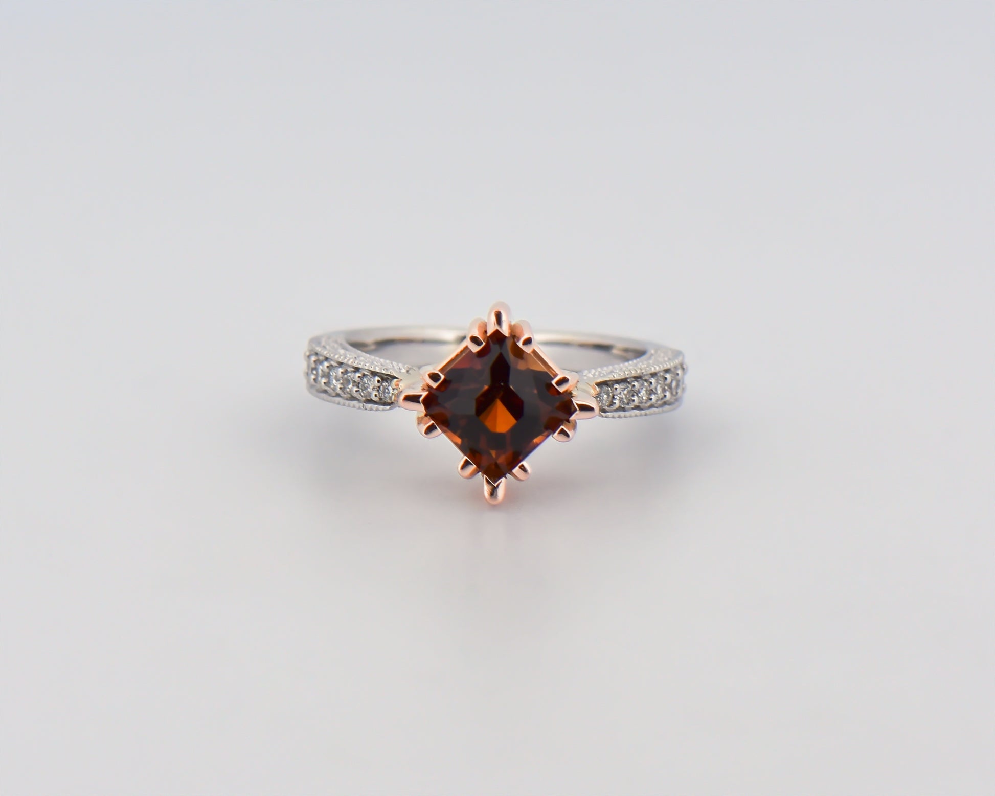 Details: Custom 14k white and rose gold ring featuring a 1.73ct square dravite tourmaline (cognac color, John Dyer cut) and .12ctw natural diamond accents (SI GH).