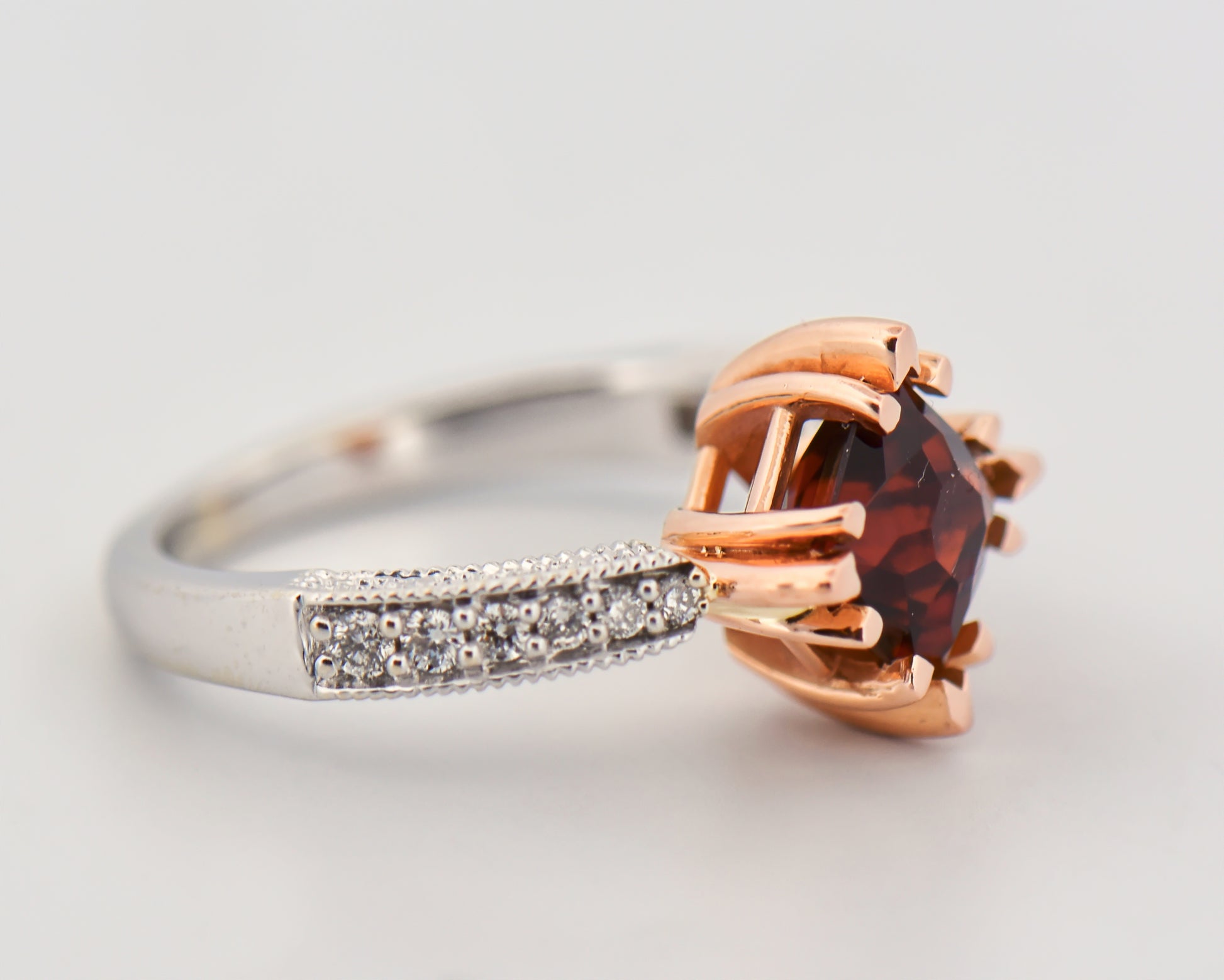We have set this gem in a custom-made rose gold basket-style head with three prongs at each corner, positioned on point for an intriguing look. A single row of diamonds flanks the tourmaline on either side of the white gold shank. If you're seeking the perfect earth-tone gemstone to complement your fall wardrobe, look no further!