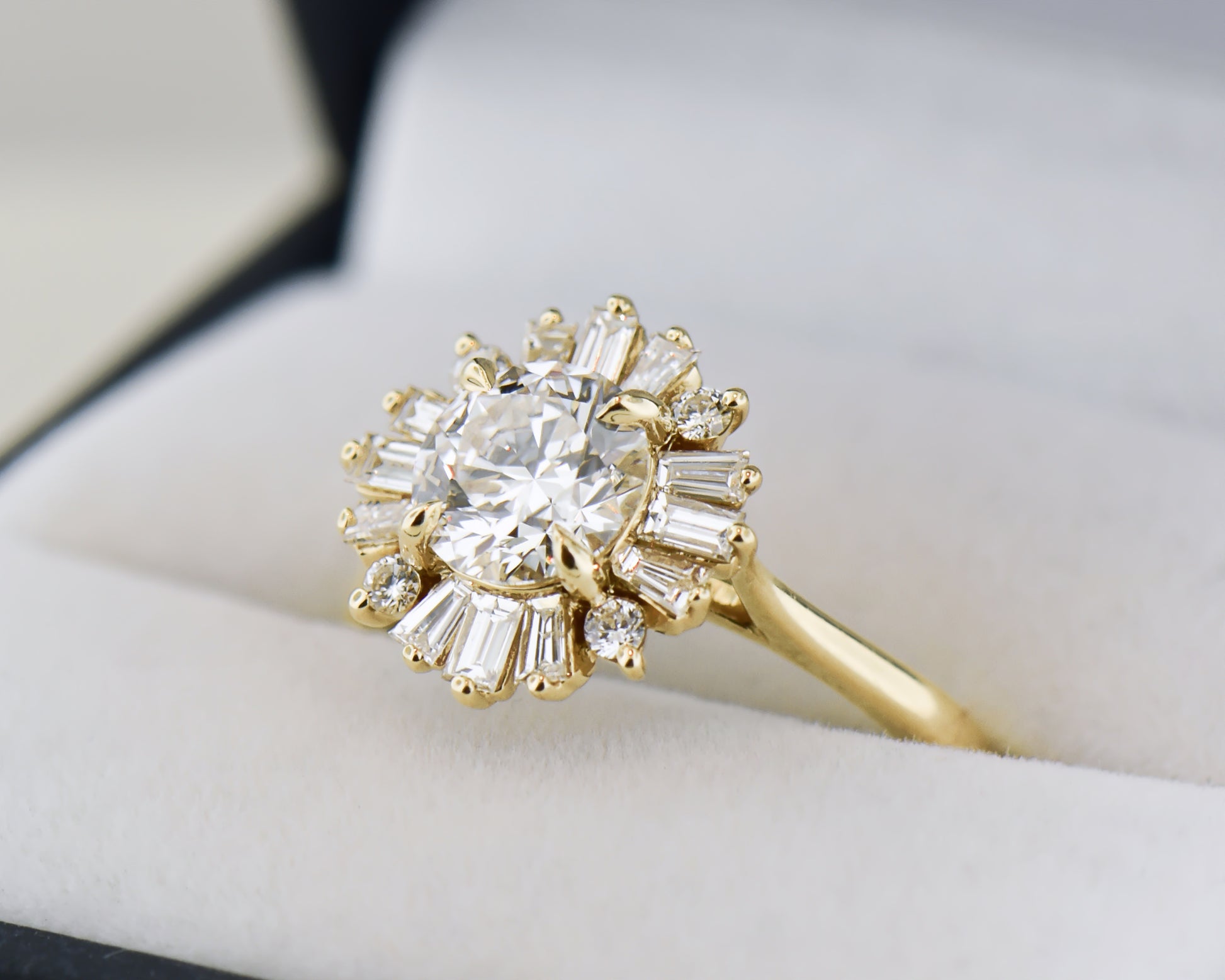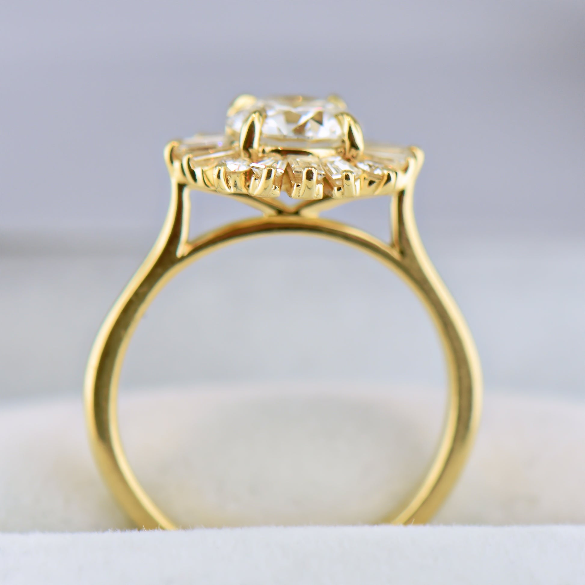 This stunning lab-grown diamond halo engagement ring offers a modern twist on a classic design. The ring mounting, made of 18k yellow gold, features a halo of round and baguette diamonds arranged in a beautiful compass or sunburst pattern. At the center is a 1.25-carat lab-created diamond of exceptional quality with D color, which sparkles brilliantly against the gold setting.