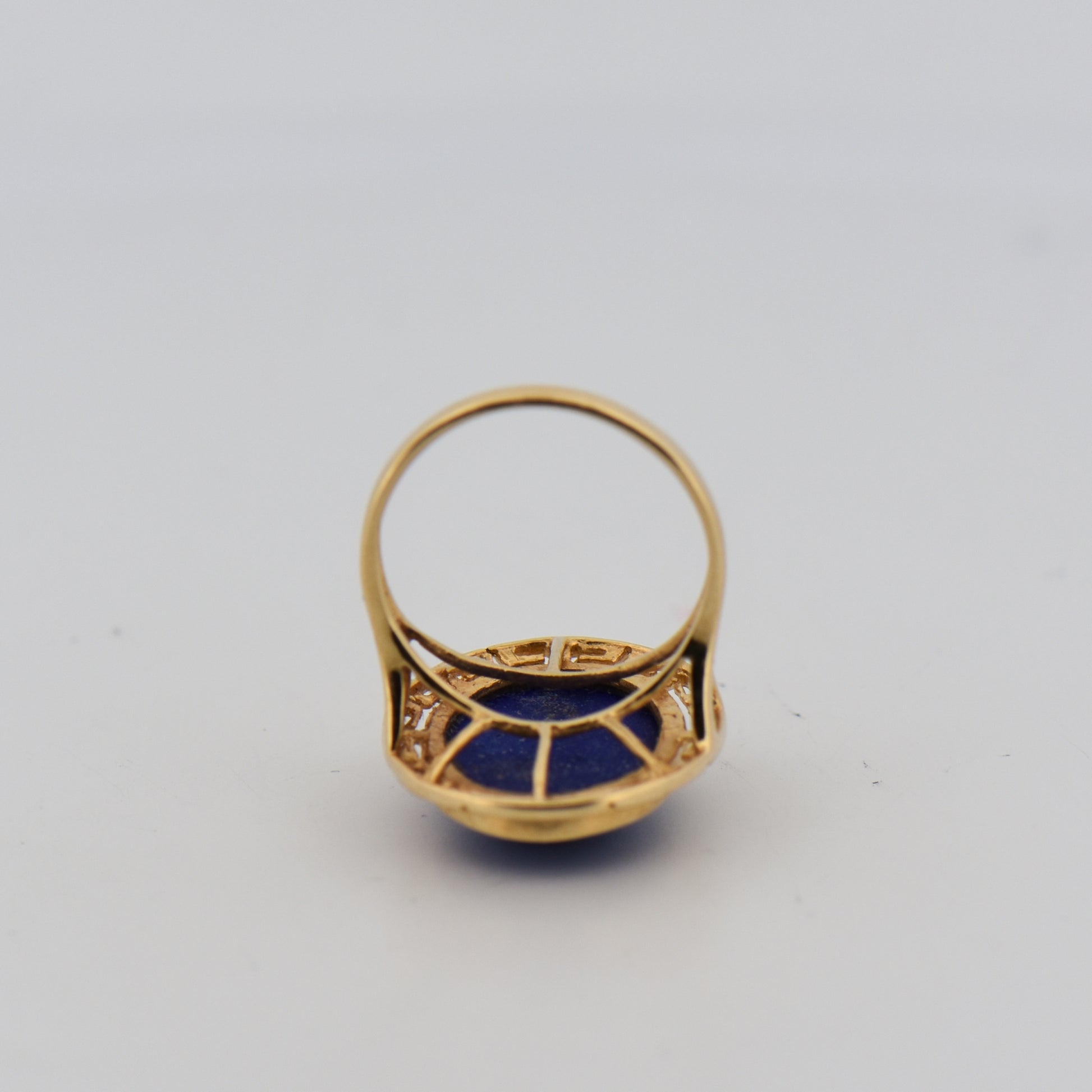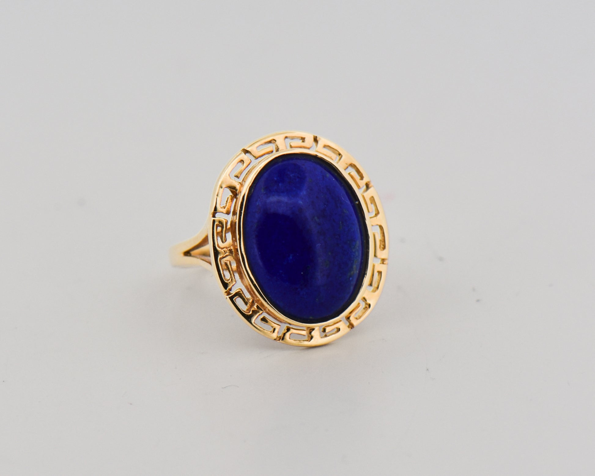 Details: Lapis lazuli ring in 14k yellow gold featuring an oval cabochon lapis within a Greek key frame; total weight 4.2 grams; sourced from Afghanistan; estate piece, circa 1980s.