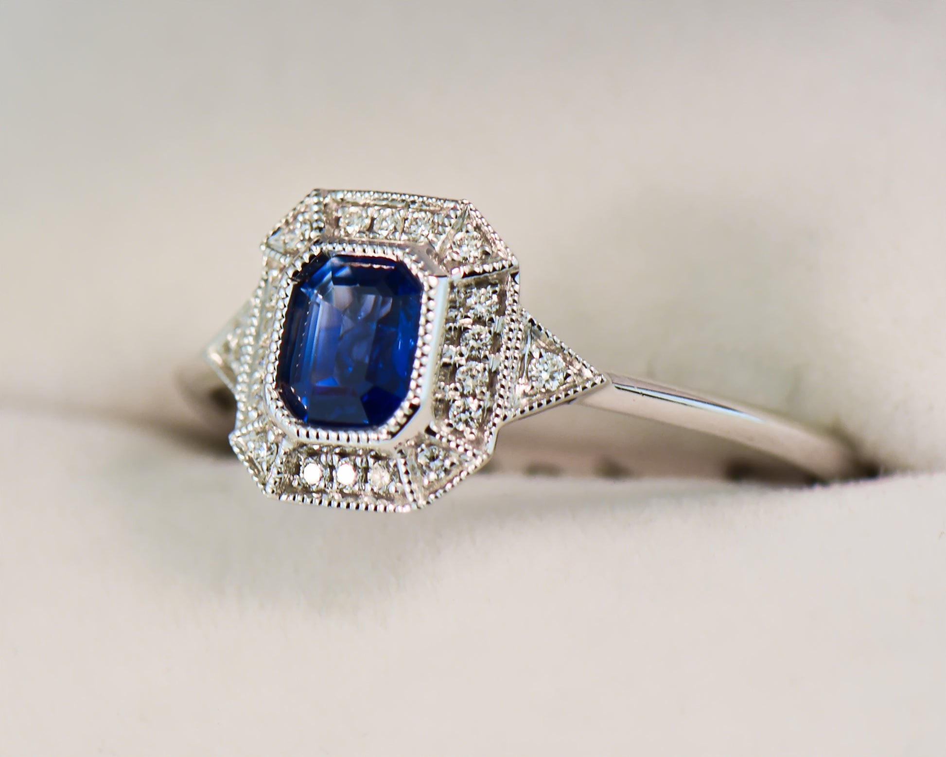 Inspired by the elegance of Art Deco, this engagement ring blends vintage charm with a contemporary twist on classic design. At the center, an emerald-cut blue sapphire from Sri Lanka, weighing 0.42 carats and heat-treated, is elegantly bezel set and enhanced with milgrain detailing. Surrounding the sapphire is a halo of sparkling diamonds, adding a touch of brilliance.