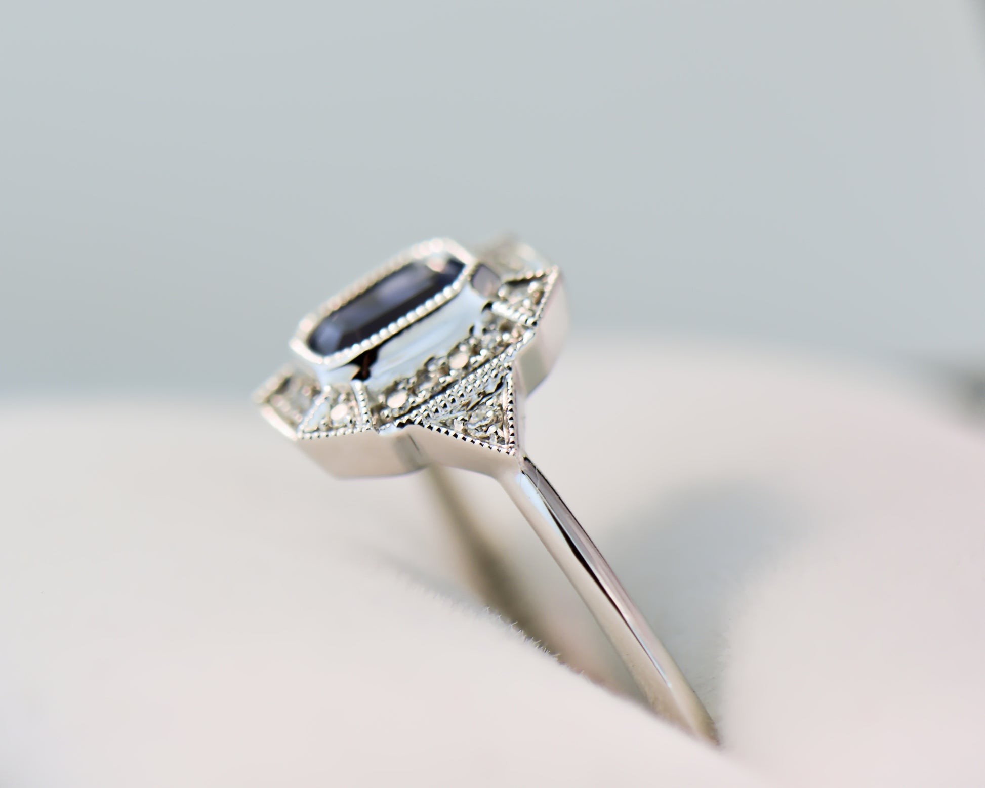 Details: Vintage-style engagement ring in 14k white gold, featuring a bezel set 0.42ct emerald-cut blue sapphire (heat-treated, Sri Lanka) and 0.08ct diamond accents (SI, GH).