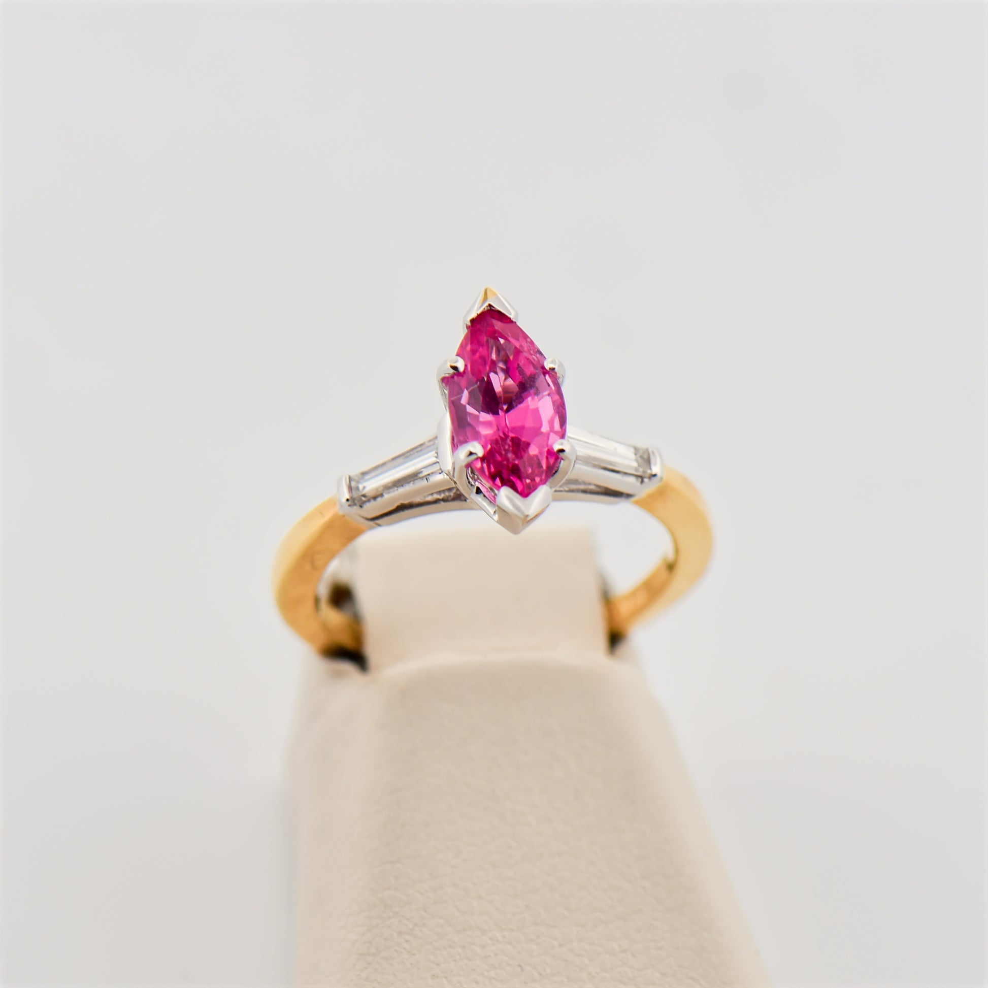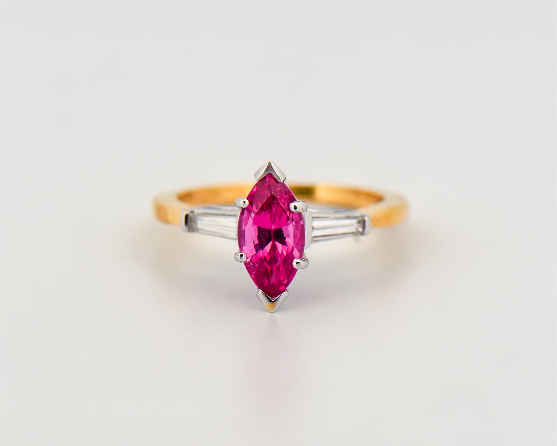Details: Marquise pink sapphire and diamond ring in 14k two-tone gold featuring approx. 1.20ct heat-treated sapphire accented by approx. 0.18ctw baguette diamonds (VS clarity, G–H color).