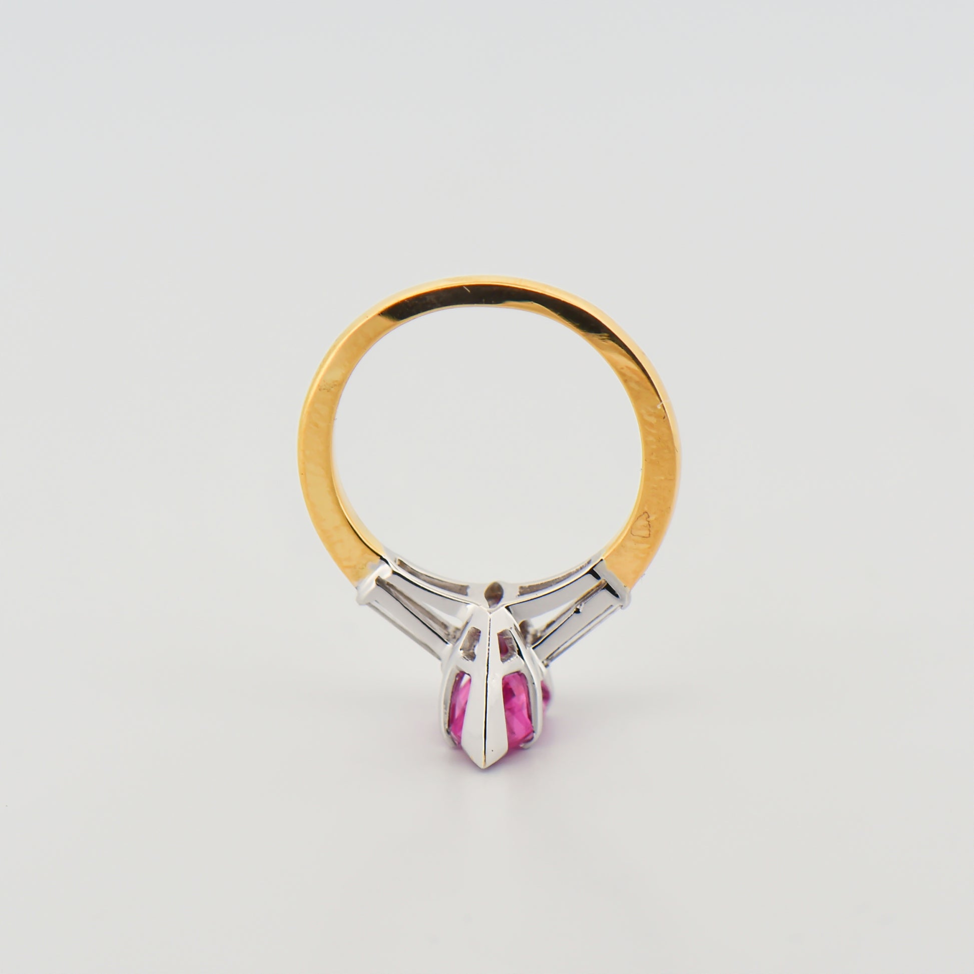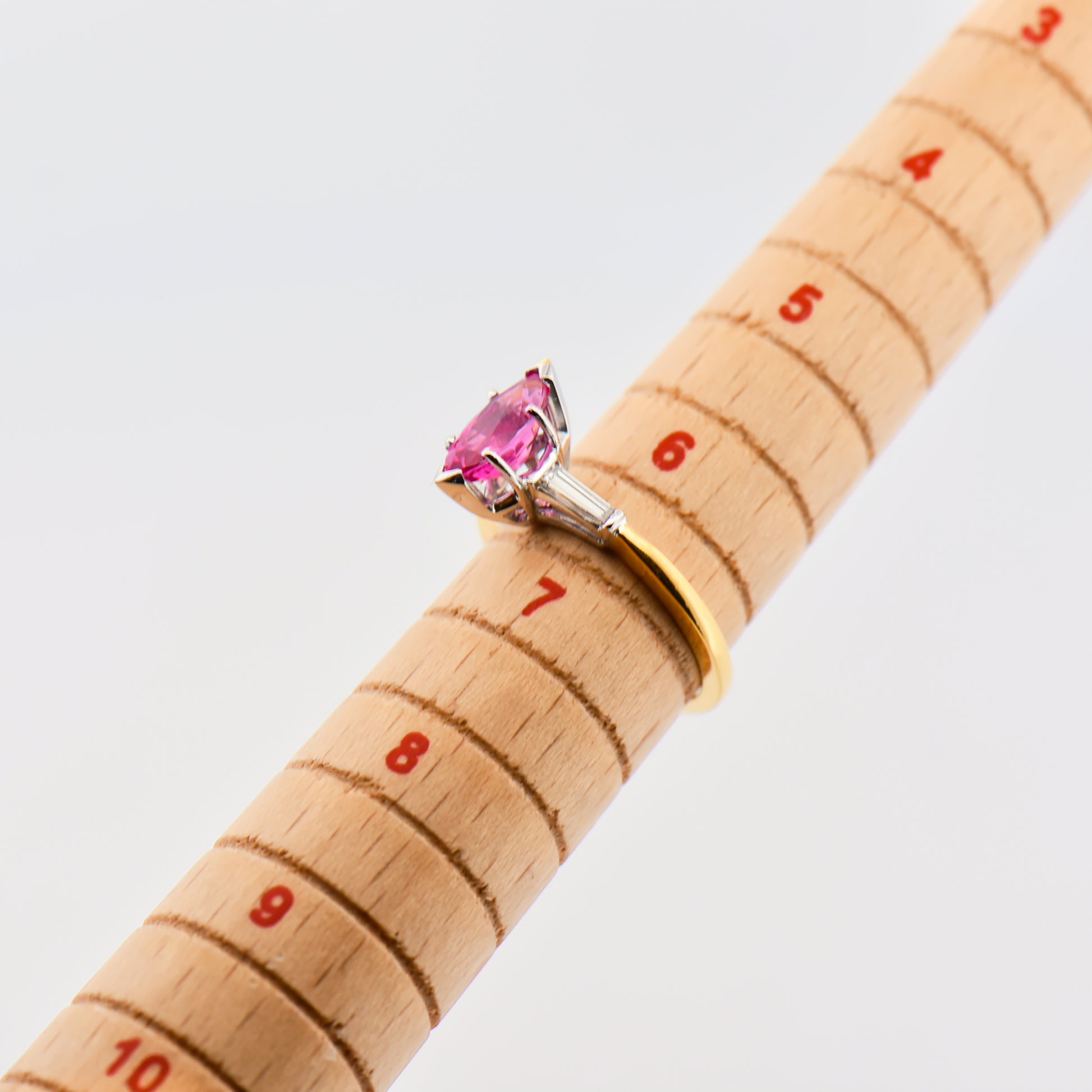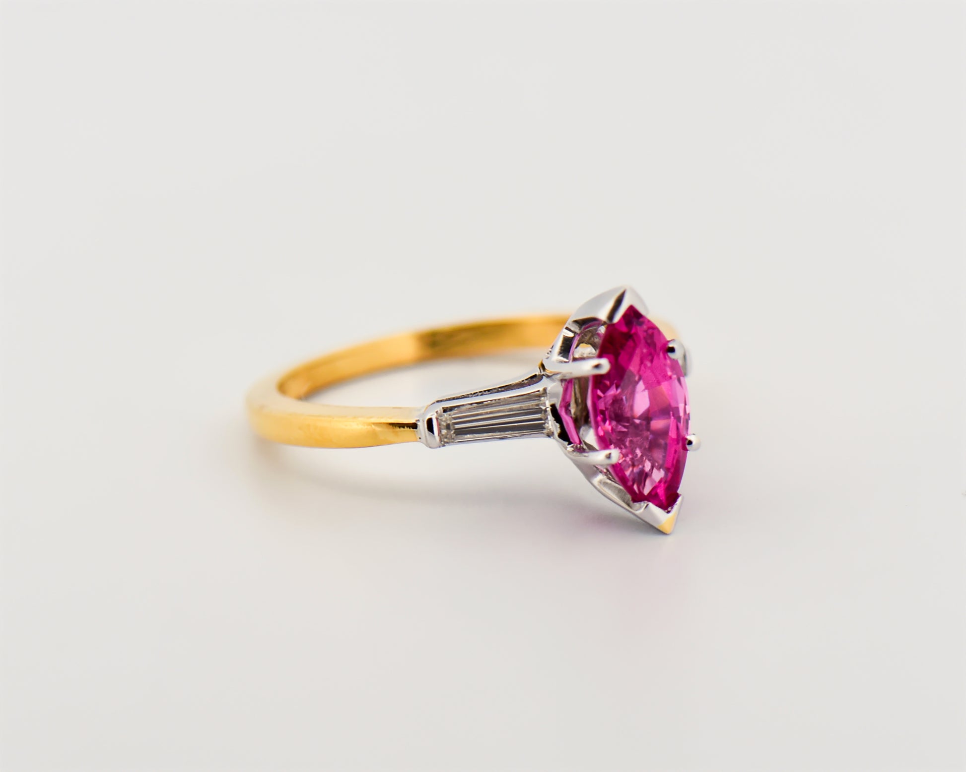 Perfectly pink and endlessly charming, this sapphire and diamond ring is sure to leave you blushing. At its heart rests a 1.20-carat marquise-cut pink sapphire, its lively hue guaranteed to catch the light—and the eye—with every movement. The elongated shape draws attention along the finger, emphasizing both elegance and presence. Accenting the sapphire are glittering baguette-cut diamonds, their brilliance providing a crisp contrast that enhances the gem's rosy vibrancy.