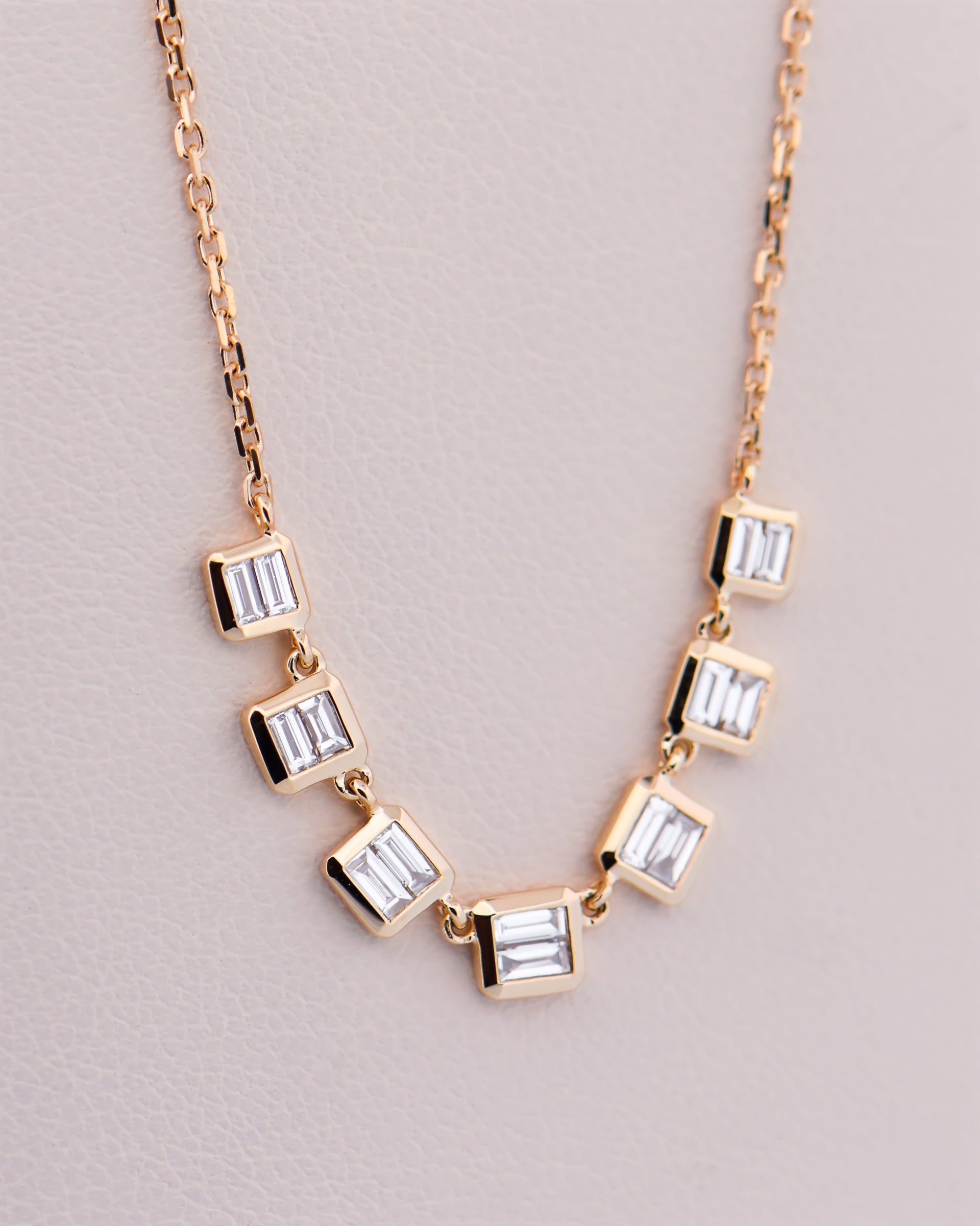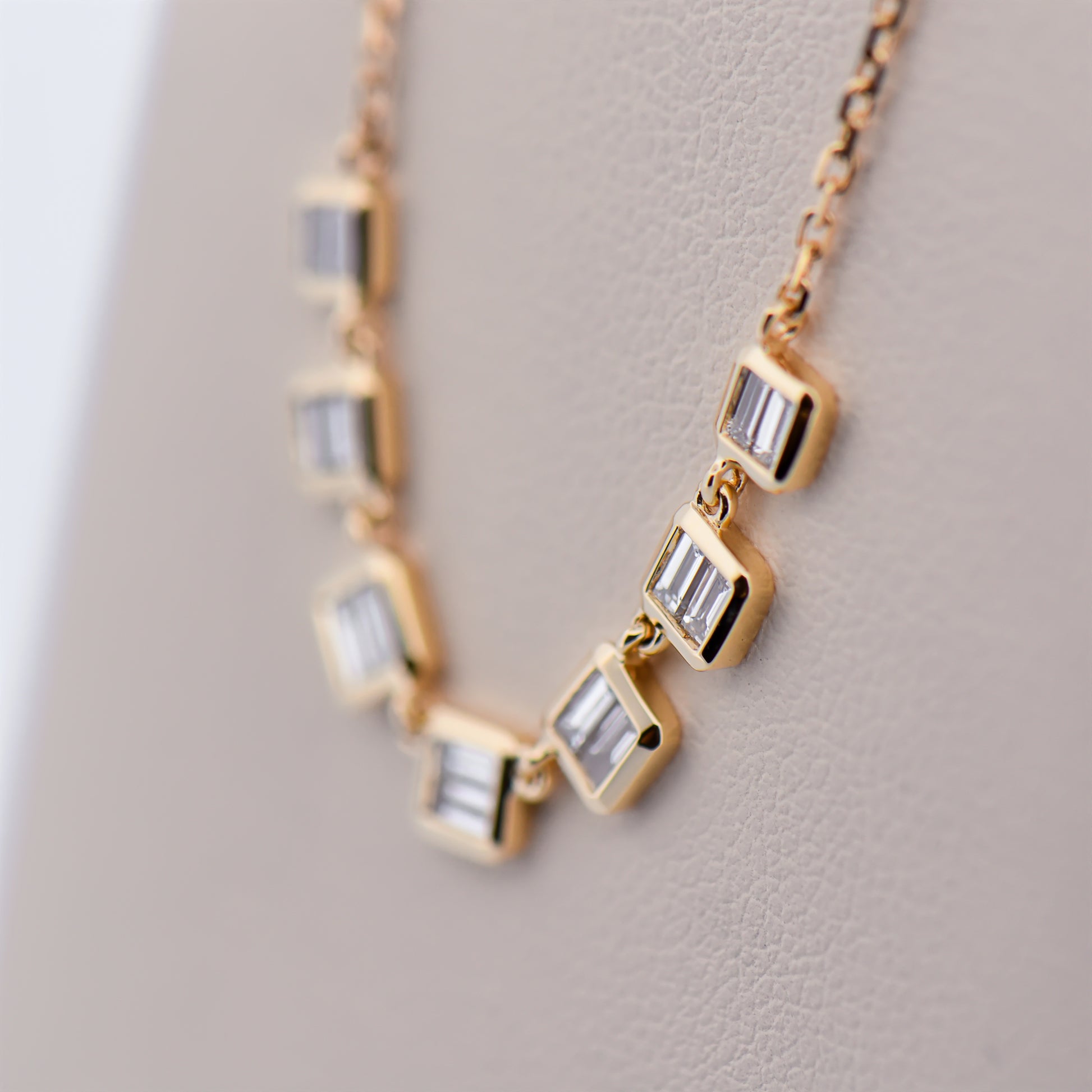 Sleek, sophisticated, and utterly stunning, this modern diamond necklace presents a contemporary take on a timeless classic. Set with 0.42 carats of baguette-cut diamonds, each VS-quality stone is meticulously arranged to create a chic linear silhouette that shines with every movement. The geometric nature of the baguette cut gives the design its modernist edge while maintaining an air of classic luxury.
