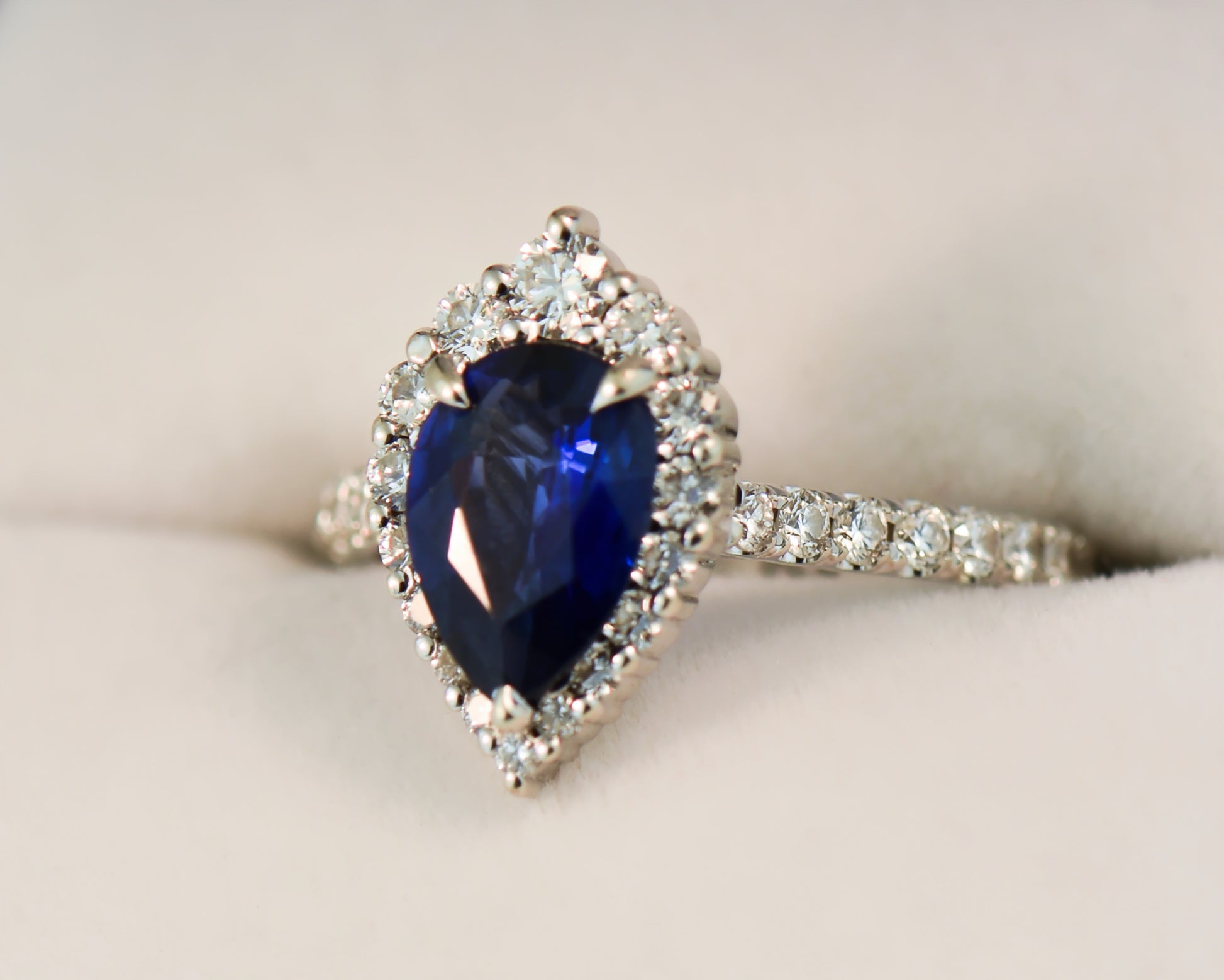 Modern Pear Shape Blue Sapphire & Diamond Halo Ring