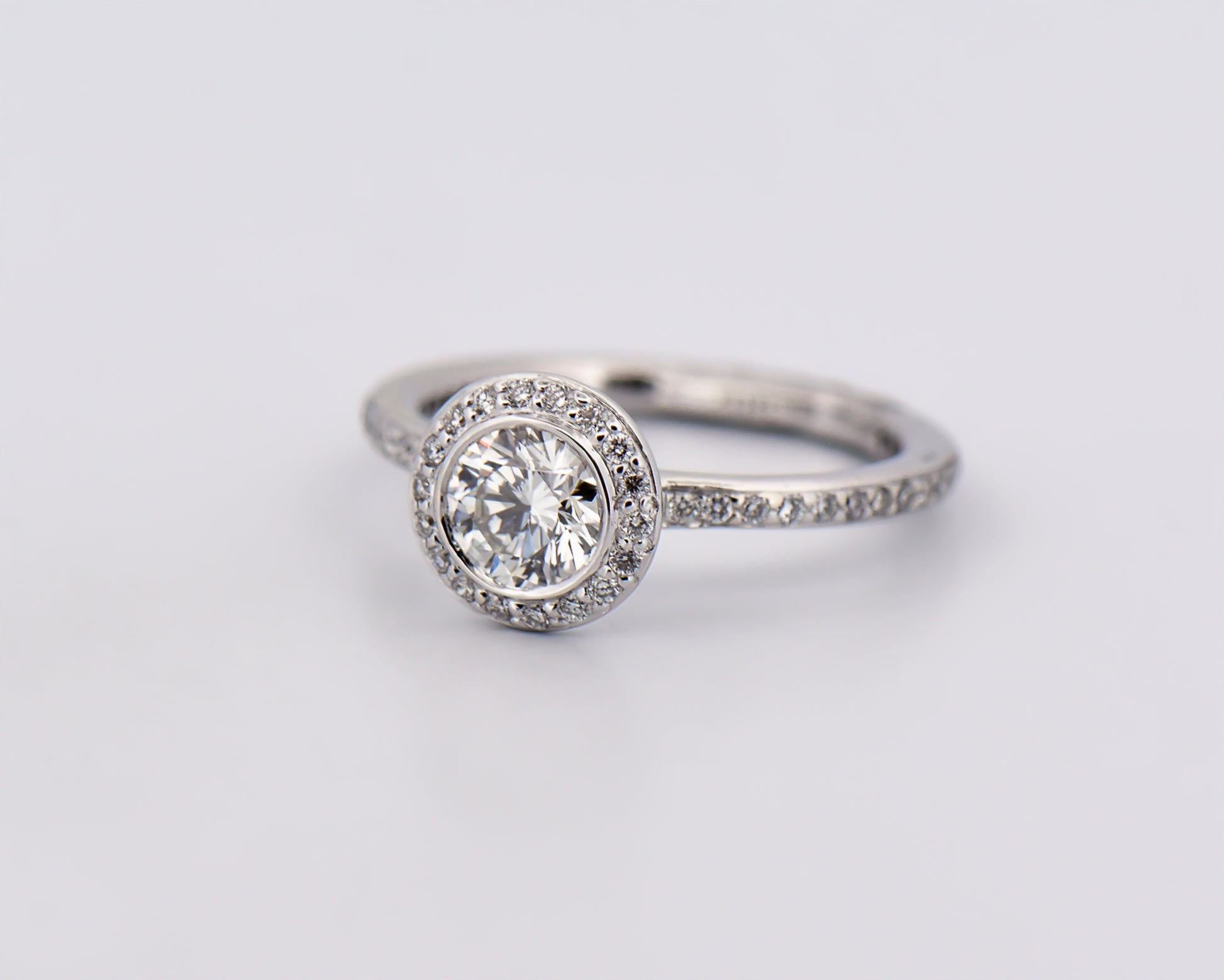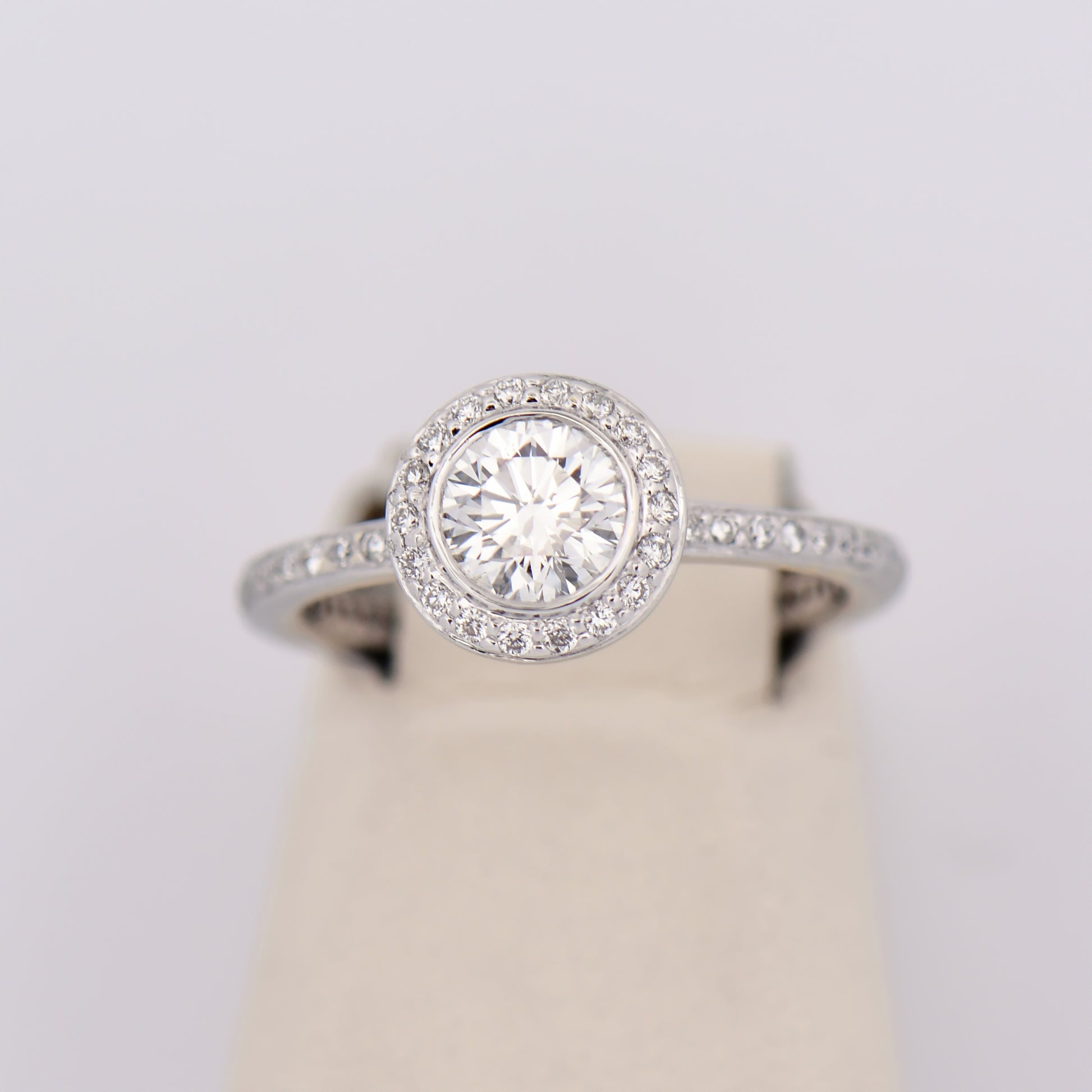Details: Modern engagement ring in 18k white gold, featuring a 0.60ct round center diamond (SI clarity, F-G color) with 0.30ctw of accent diamonds (SI1 clarity, F-G color). EGL certified.