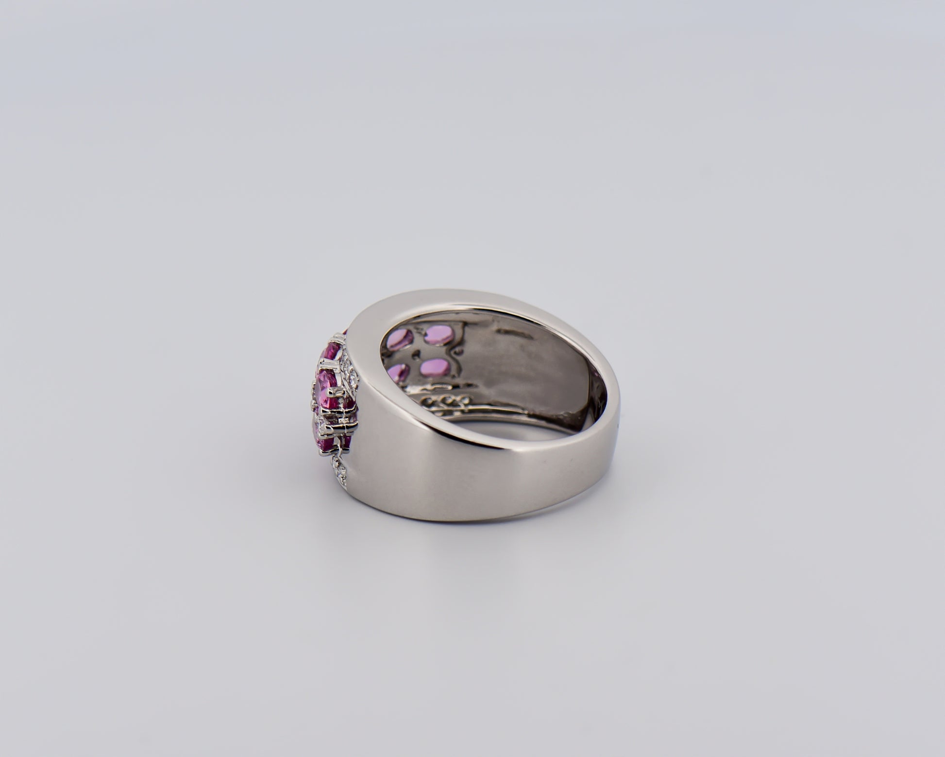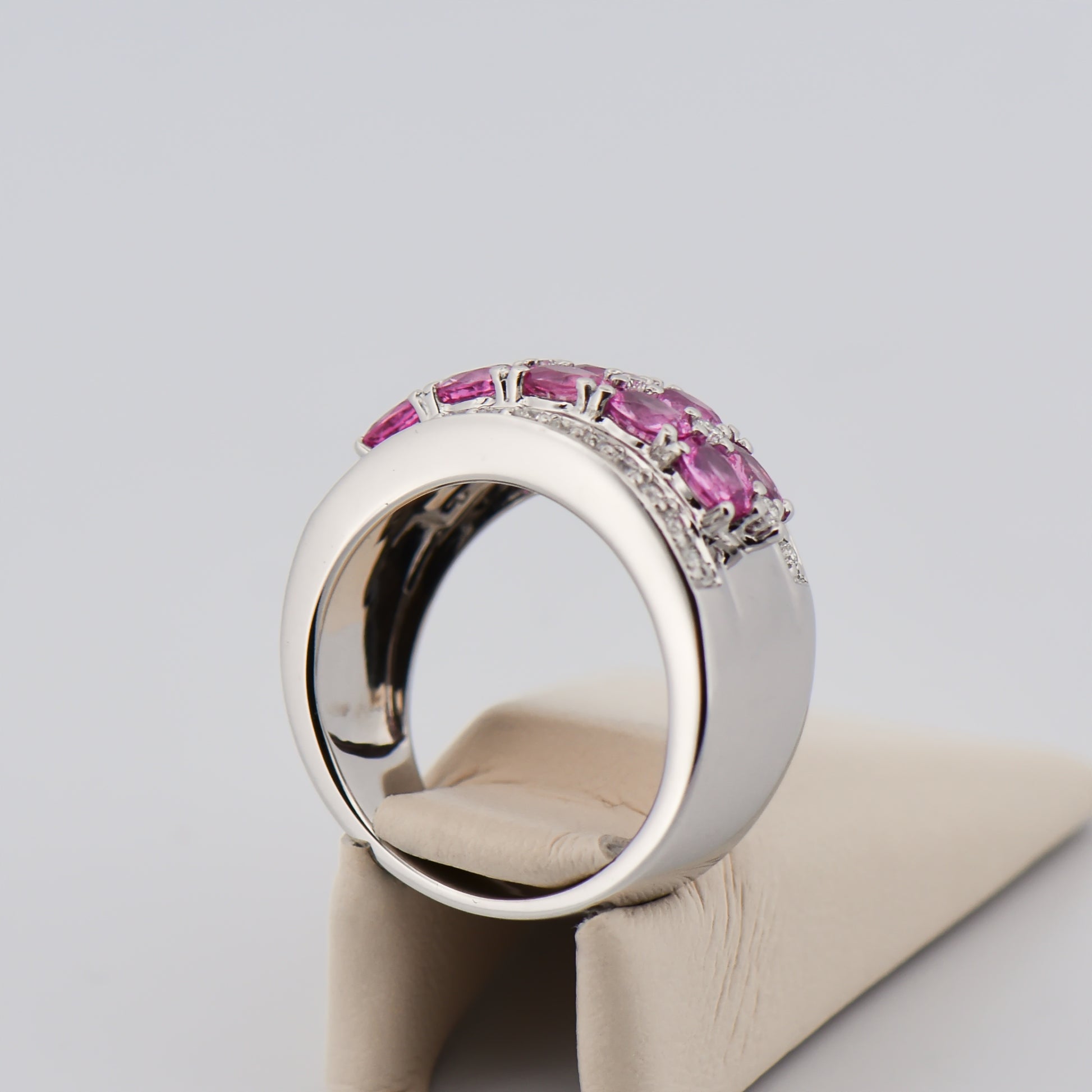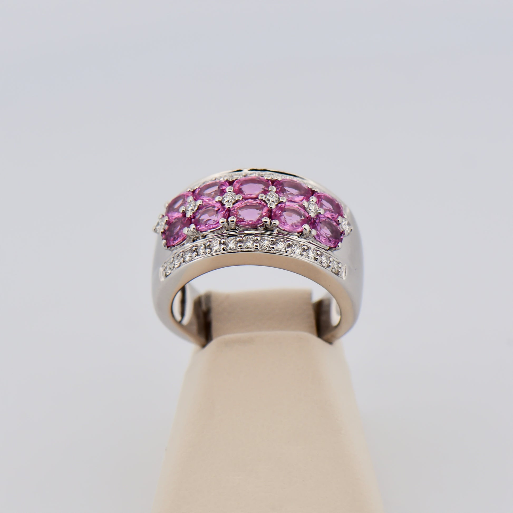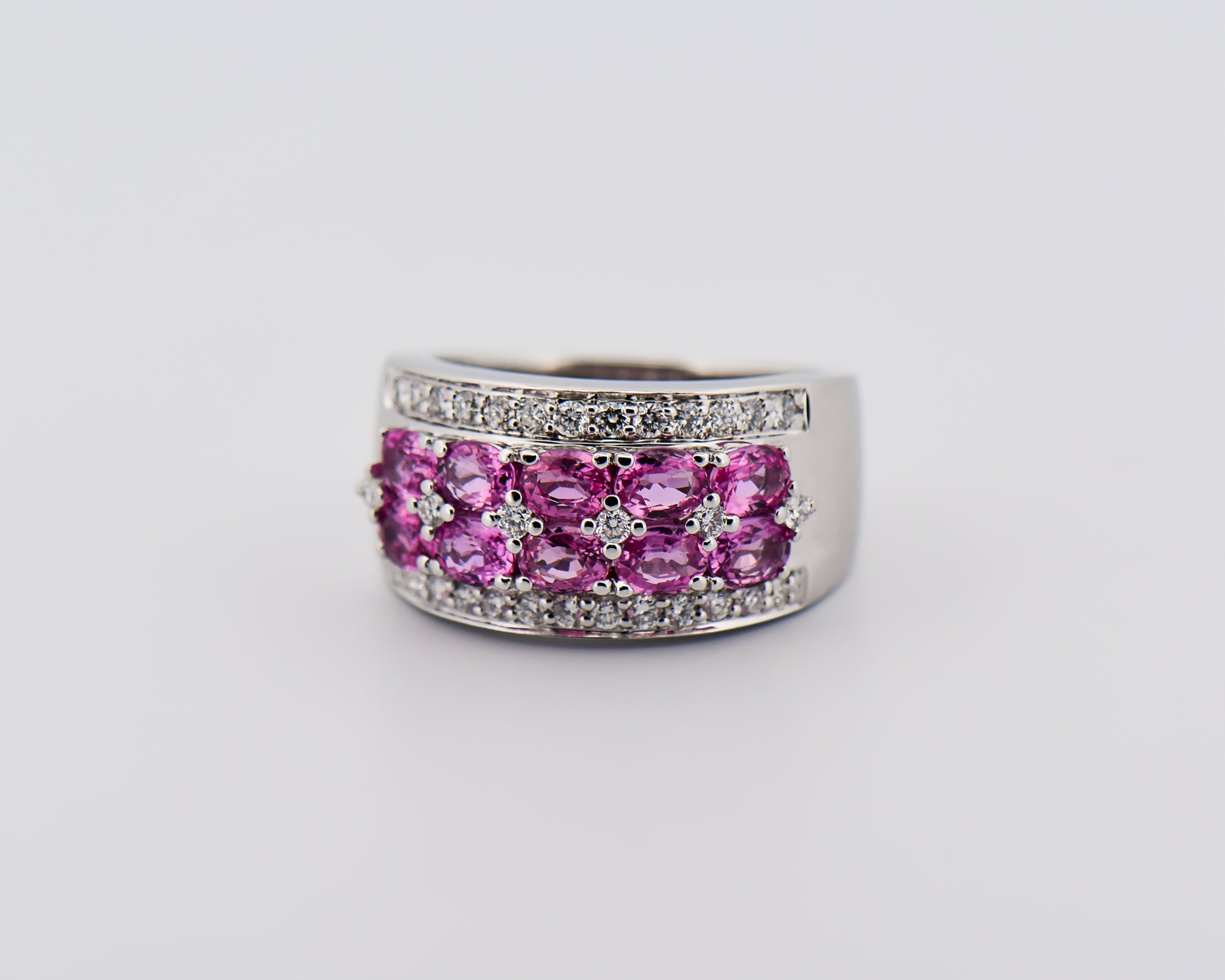 Details: Size 7.5, estate piece, 14k white gold cigar-band ring set with approximately 2 carats total weight of oval pink sapphires (heat-treated) and 0.25 carats total weight of round diamond accents (SI clarity, G-H color).