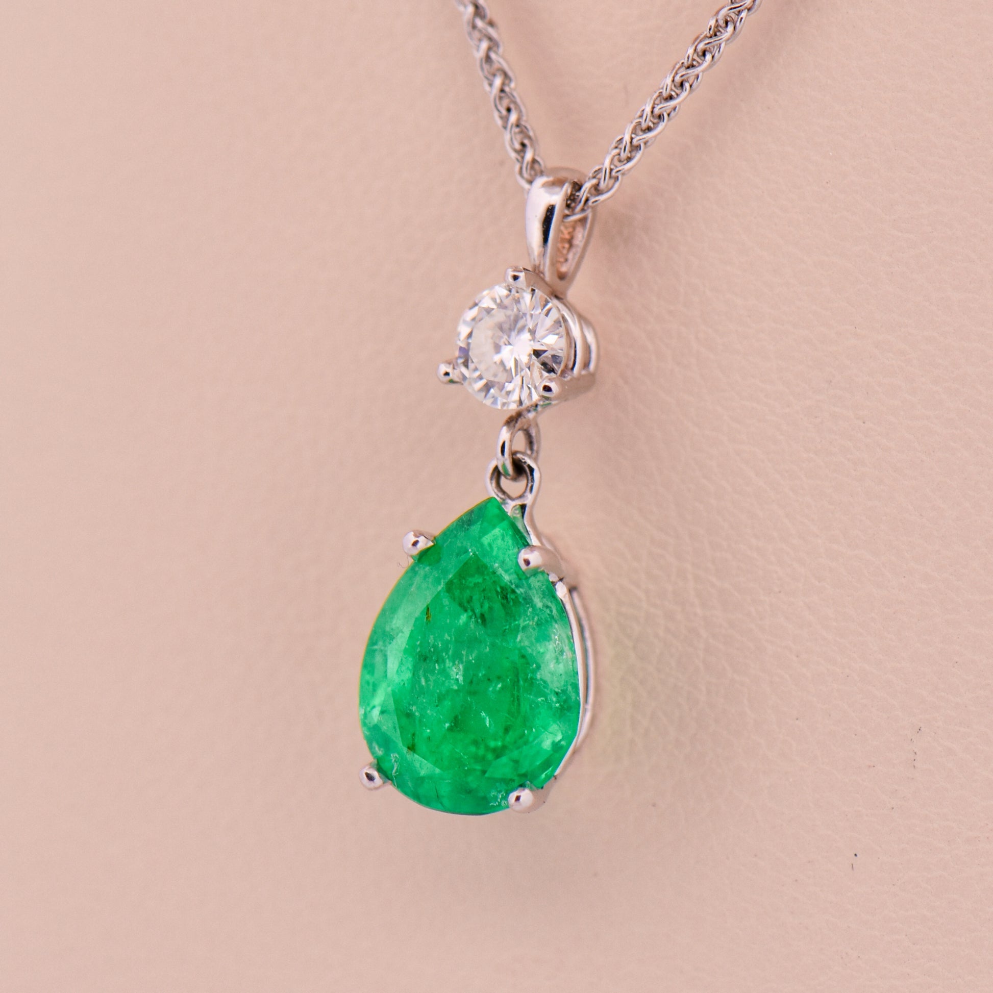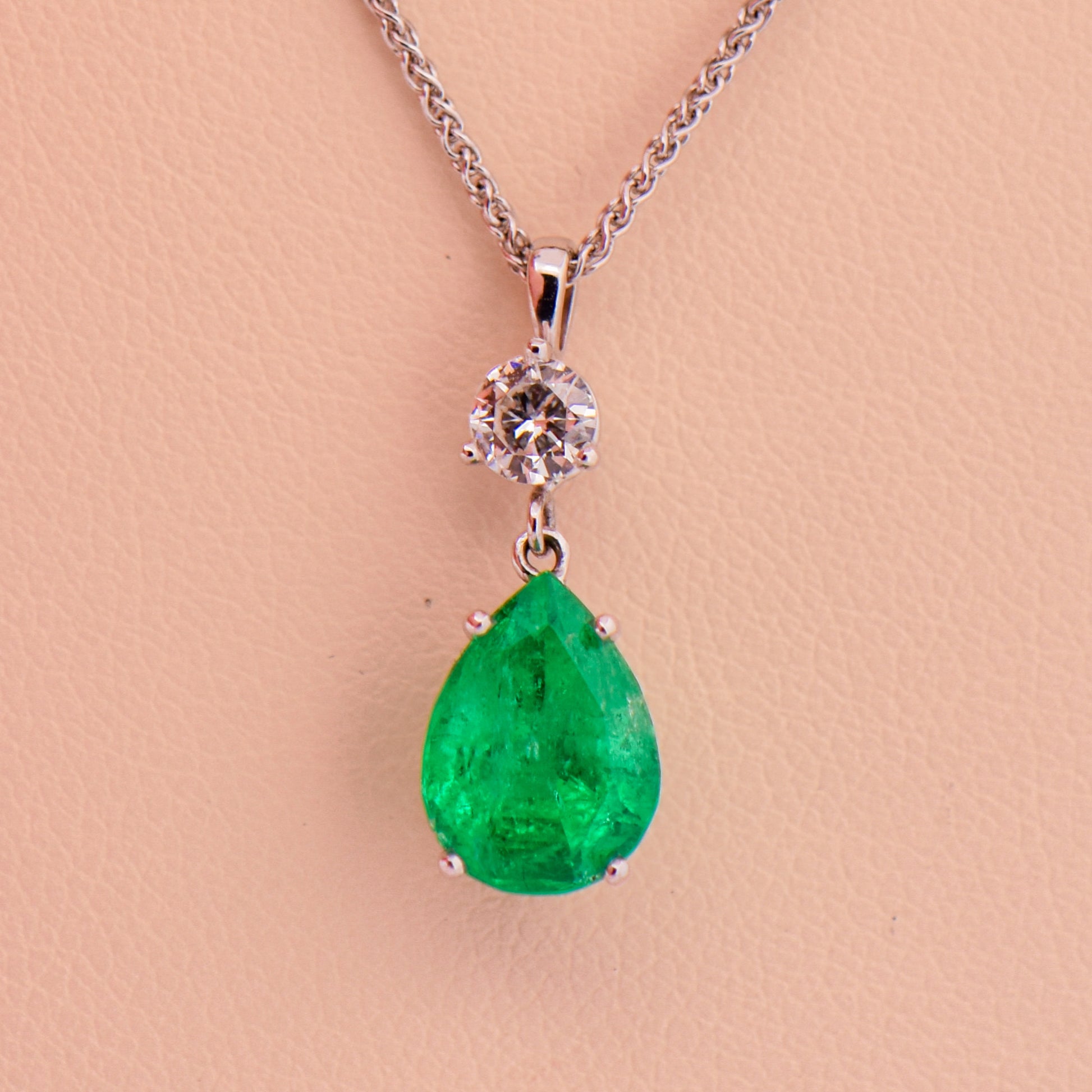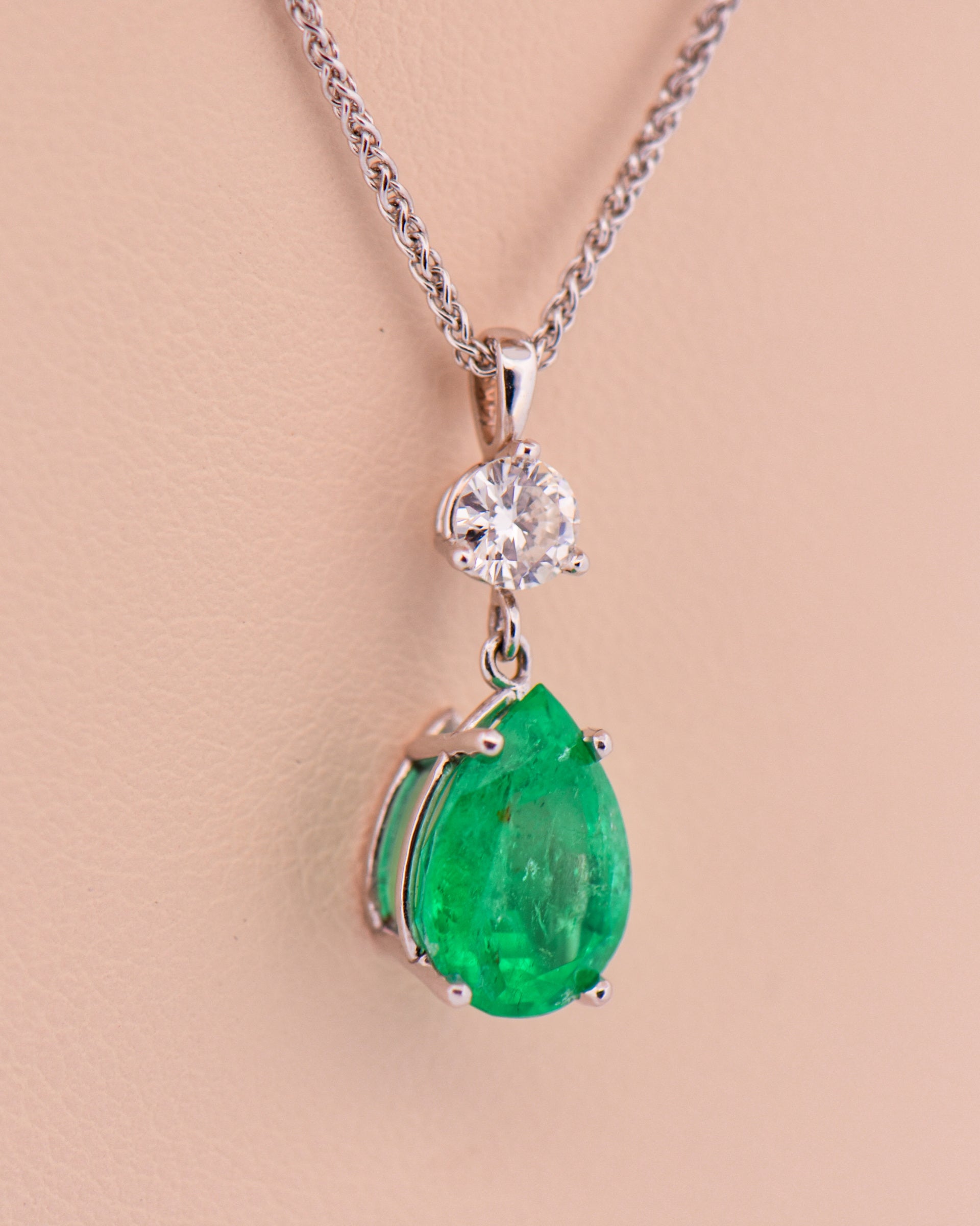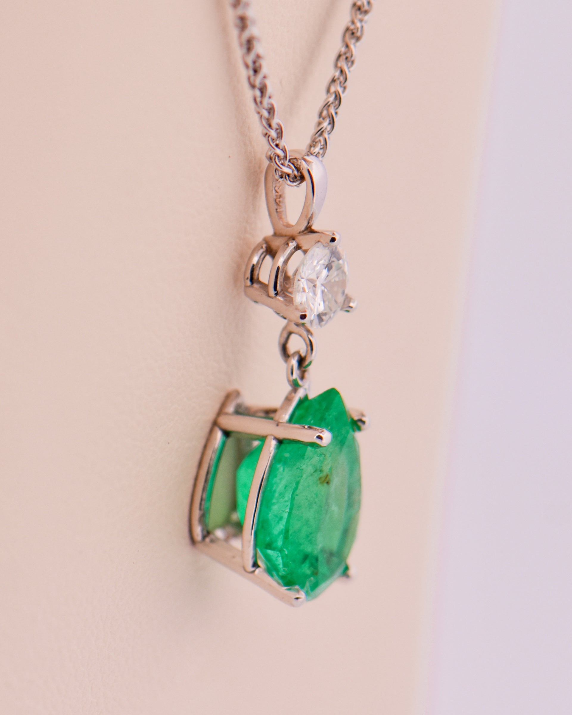 Details: Custom 14k white gold pendant set with a natural 2ct pear-shaped emerald (Colombian, oil only) and a single round diamond accent (natural, VS GH).