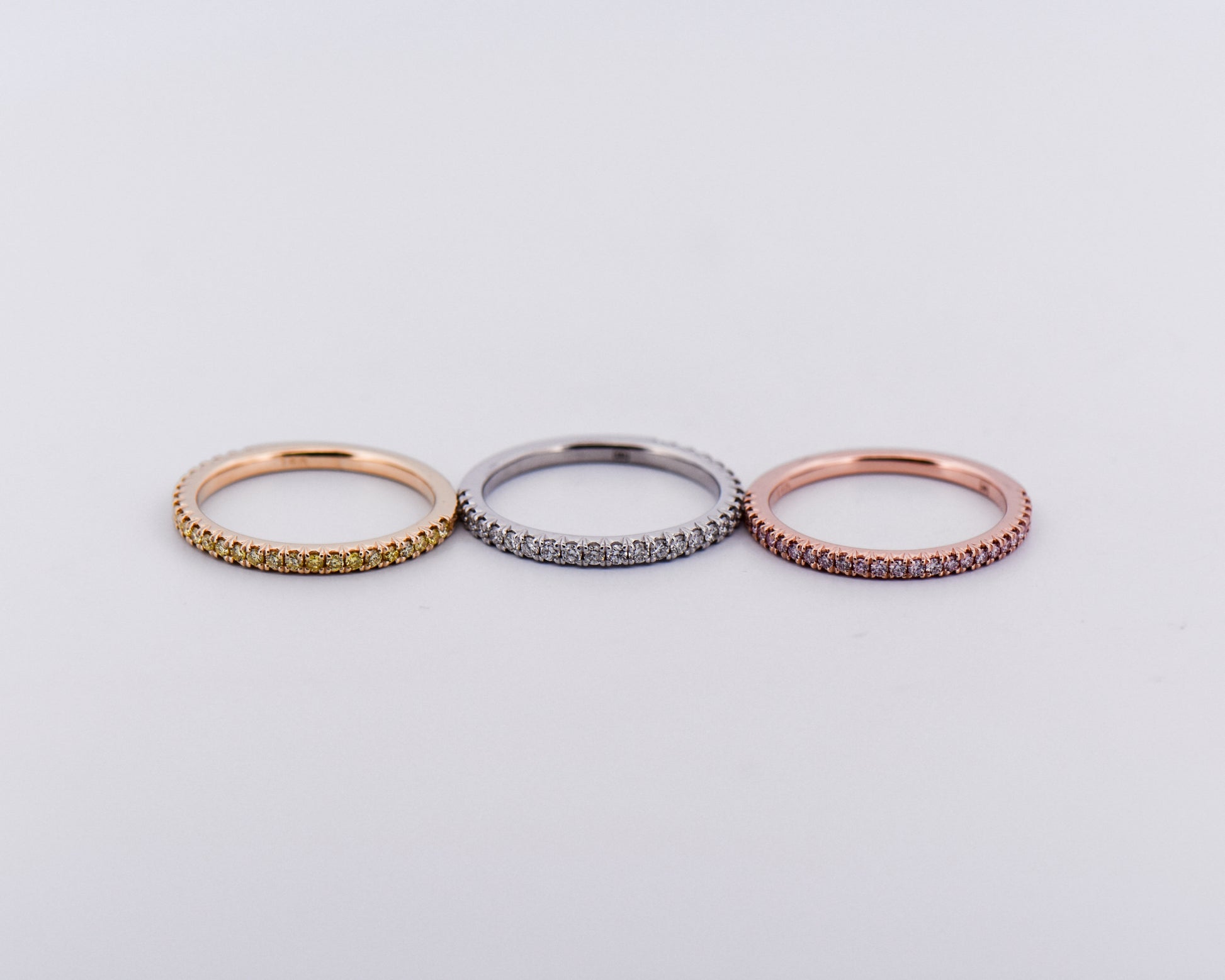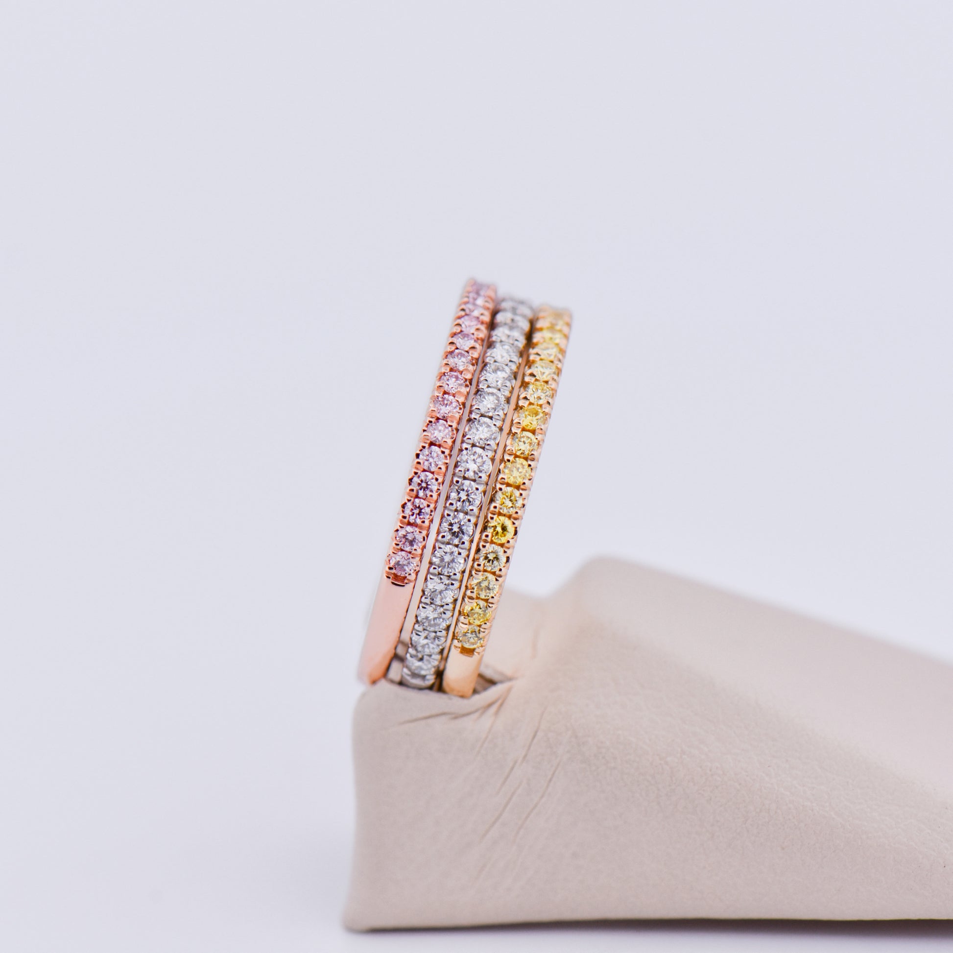 Discover the perfect stacking bands to elevate your jewelry collection! This trio of handcrafted rings is designed to showcase stunning natural fancy colored diamonds while serving as a versatile accessory for any occasion.
