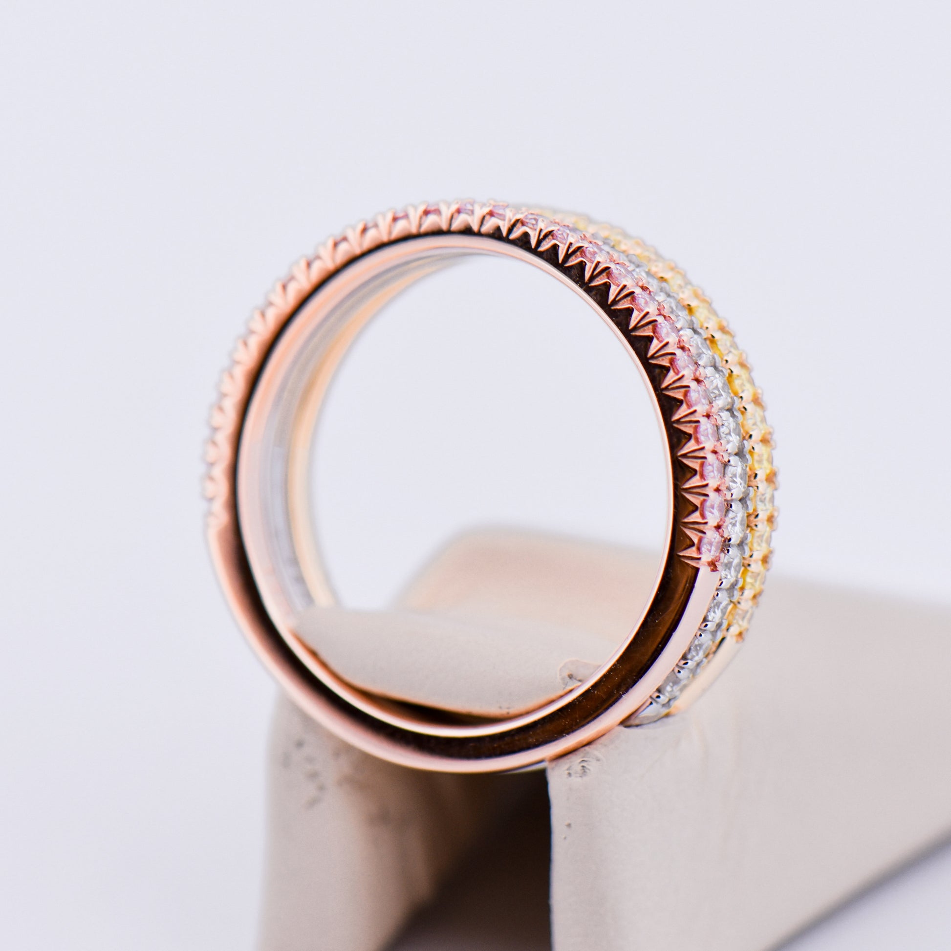 The first ring features a beautiful rose gold setting adorned with natural fancy pink diamonds. The second ring is crafted in white gold with classic white diamonds, and the last is made of yellow gold, set with natural fancy yellow diamonds. The white diamond band is slightly larger than the colored bands, adding a touch of dimension to the set.