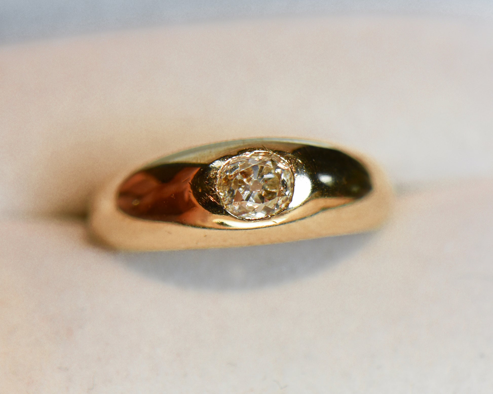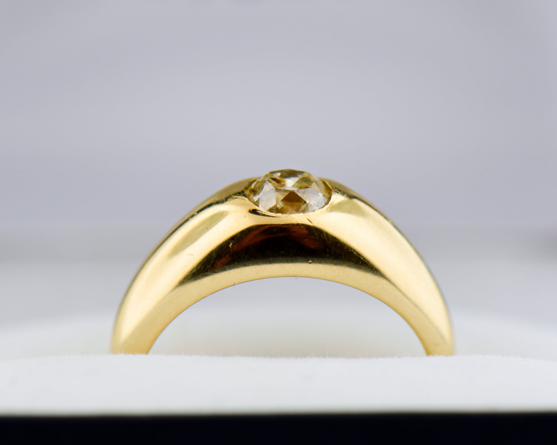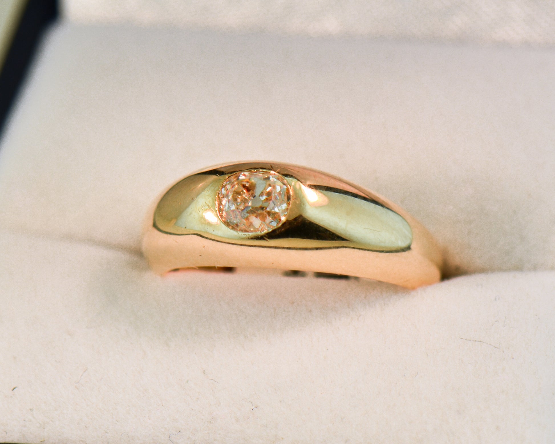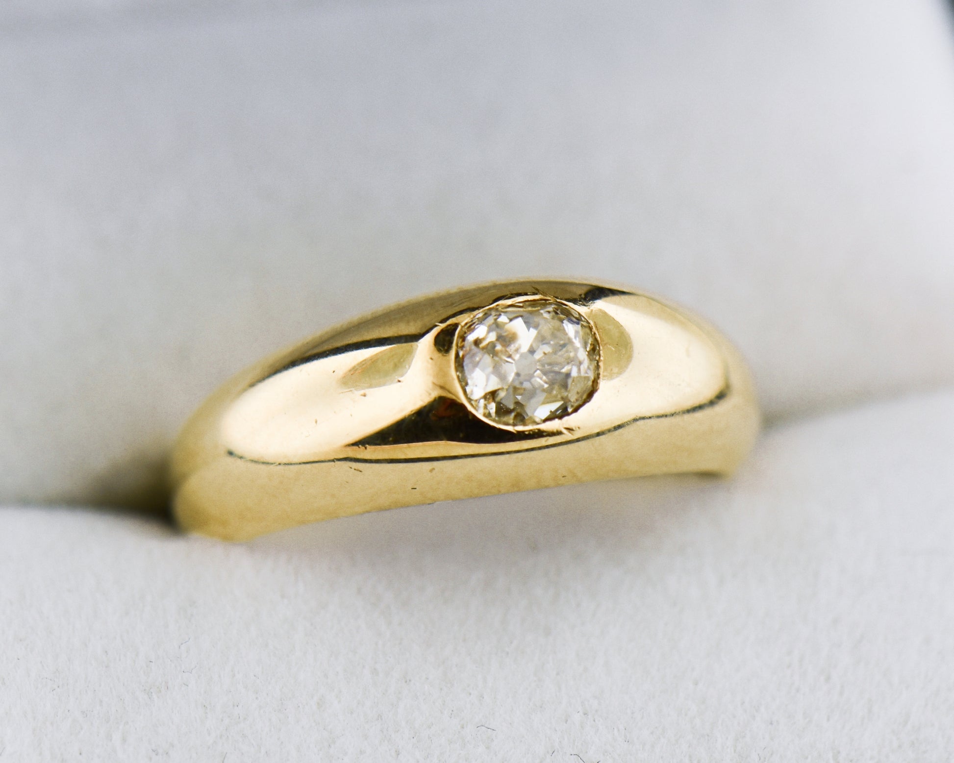 This antique gold and diamond wedding band is a staff favorite because it combines the classic look of a wedding band with a touch of intrigue from the diamond, making it ideal for everyday wear. The domed gold band sits low and hugs the finger comfortably, featuring a chunky old mine-cut cushion diamond set east-west in the center. Although the term is no longer in use, these styles were historically referred to as “gypsy rings” due to their origins in Eastern Europe; this particular piece dates back to late 1800s Britain. Despite its age, the ring is in excellent condition and is ready to find a new home on a wedding ring finger or as a pinky ring.