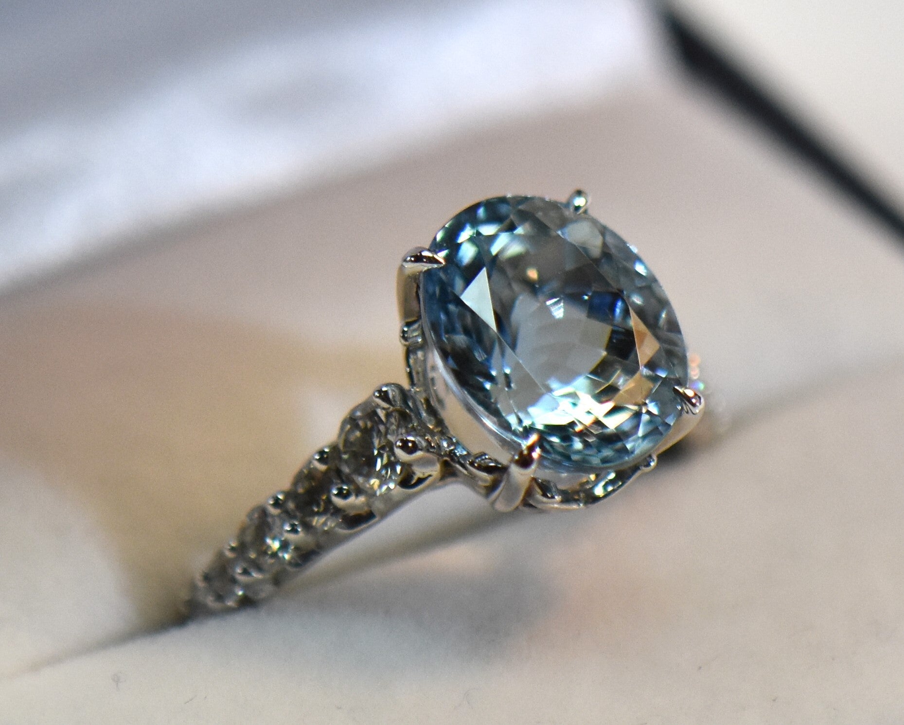 Details: 14k white gold engagement ring featuring a 4.29ct oval natural aquamarine (India, untreated) and .70ctw round natural diamond accents (SI2 GH).